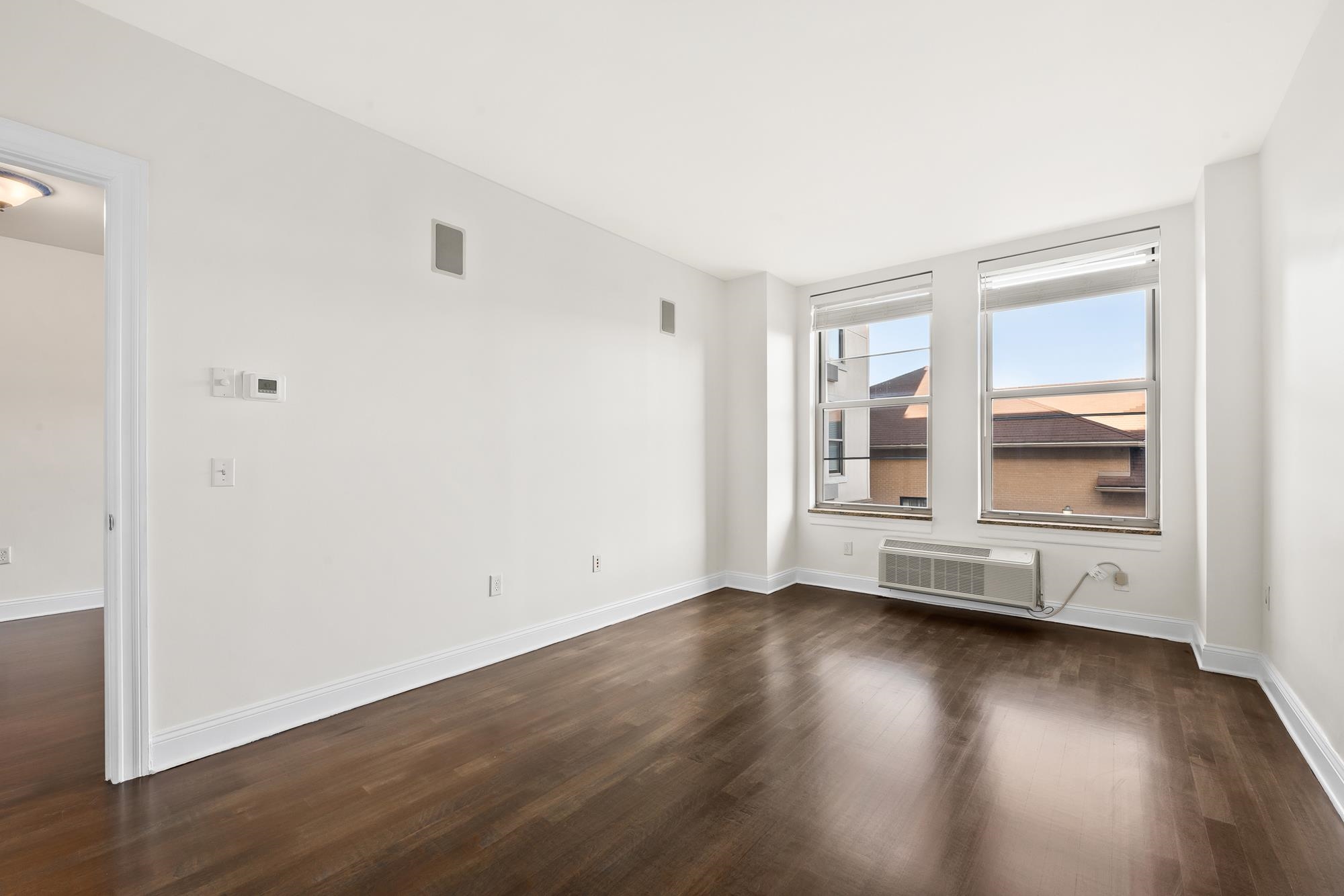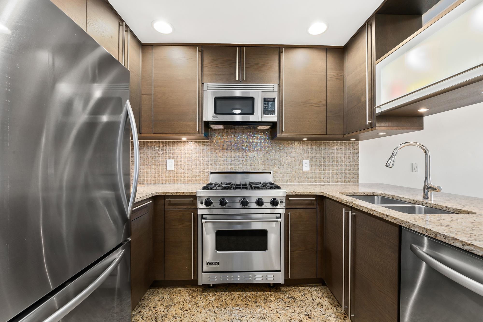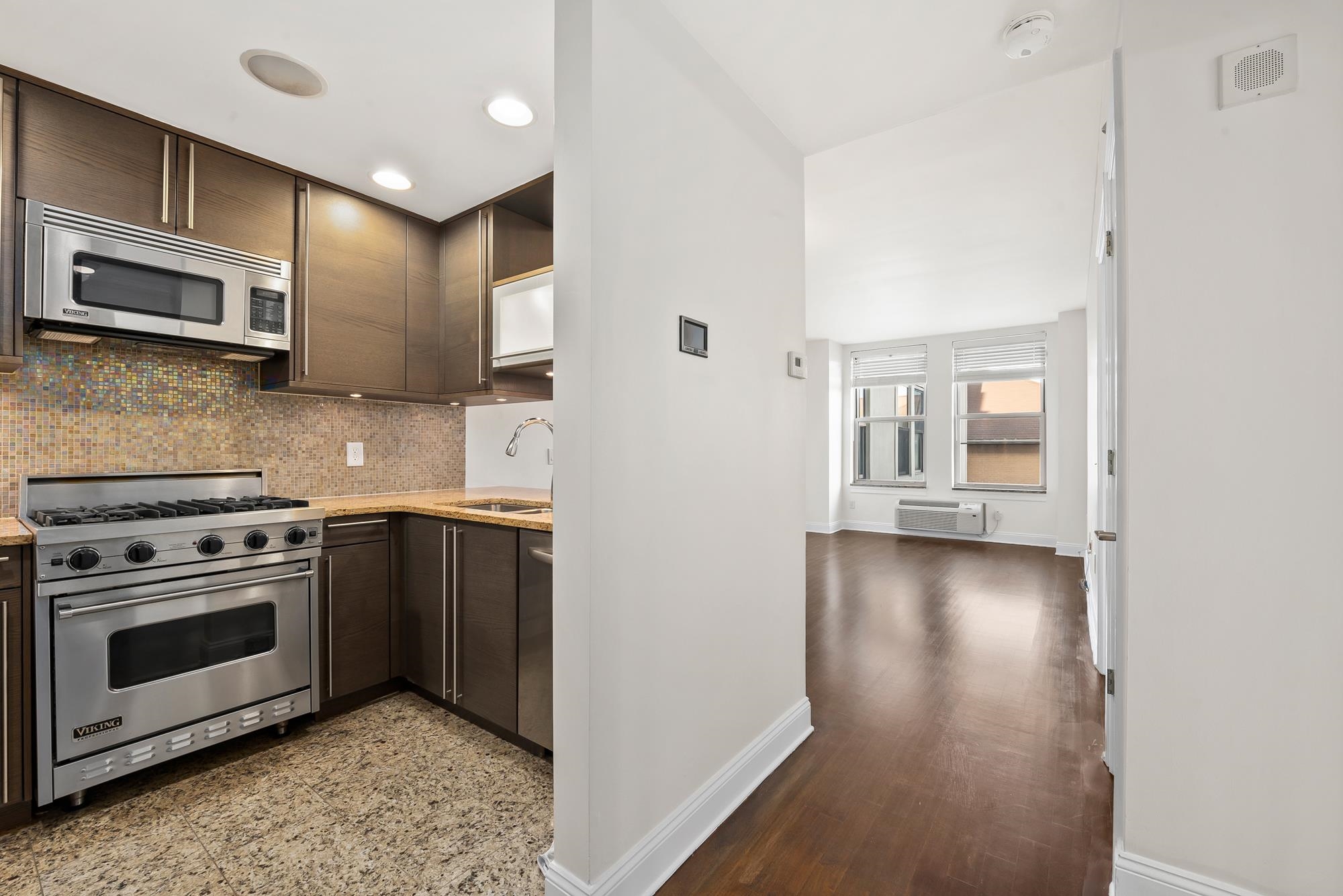 Be part of 10 Regent St community and enjoy the luxury of a full-service, 24-hour doorman building offering an impressive array of amenities. Residents have access to an in-ground pool and grilling area, a fully equipped fitness center with dedicated dance and yoga studios, a game room, and a resident lounge complete with a working fireplace. Upon entering the home, you’re welcomed by a beautifully designed kitchen featuring sleek, modern flat-panel cabinetry with a rich wood finish, full-overlay construction, and contemporary stainless steel hardware. Clean lines and integrated storage create a streamlined aesthetic that pairs seamlessly with granite countertops, a mosaic tile backsplash, and high-end Viking and KitchenAid stainless steel appliances—offering the perfect balance of style and functionality. The breakfast bar opens seamlessly into a naturally sunlit living area, offering a flexible layout that can easily accommodate both a dedicated dining space and a comfortable living room. The spacious bedroom features double closets and comfortably fits a king-size bedroom set with additional room for furnishings. Additional highlights include hardwood flooring throughout, an in-unit washer and dryer, and a surround-sound system pre-wired and ready to enhance your entertaining experience. The Sutton is centrally located in the highly sought-after Van Vorst Park section of Downtown Jersey City, where everyday convenience is truly at your doorstep. The Jersey Avenue Light Rail is directly across the street, providing access to New York City in under 20 minutes. Zeppelin Hall, neighborhood cafés, and dining options are just steps away, and residents can enjoy the regularly hosted farmers market at Van Vorst Park.