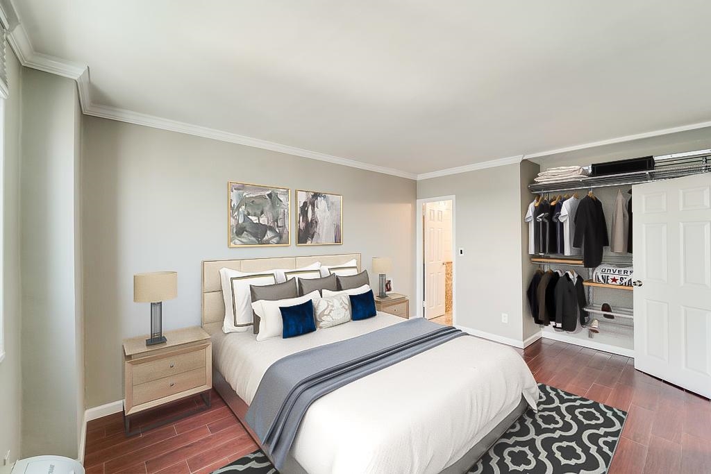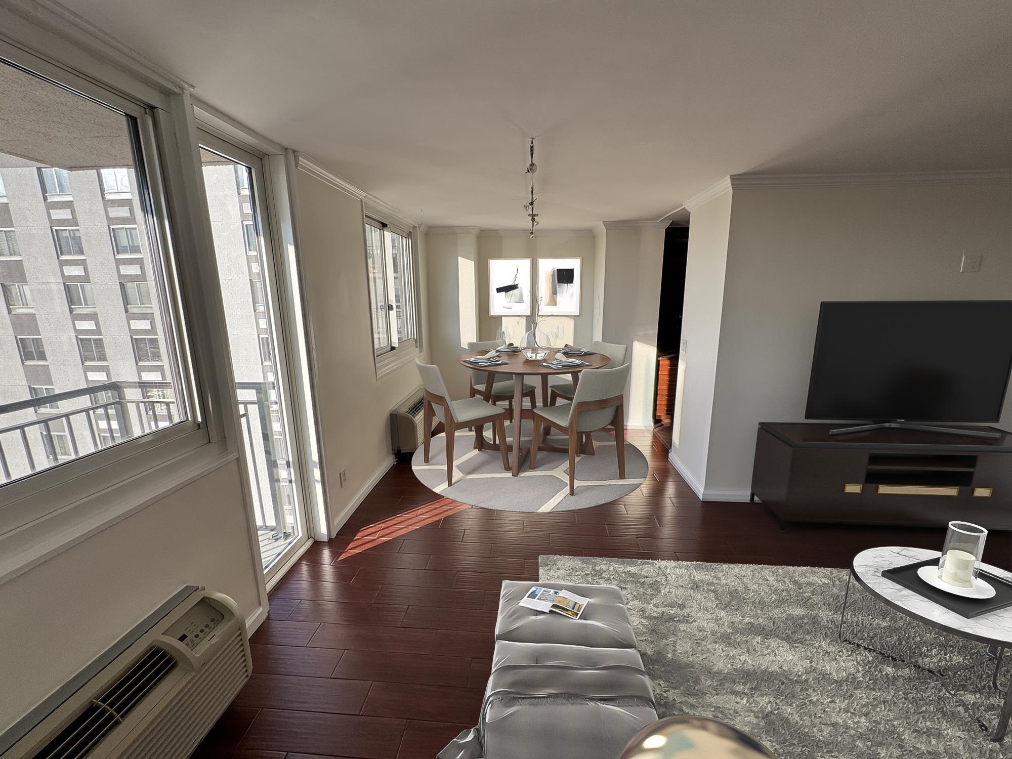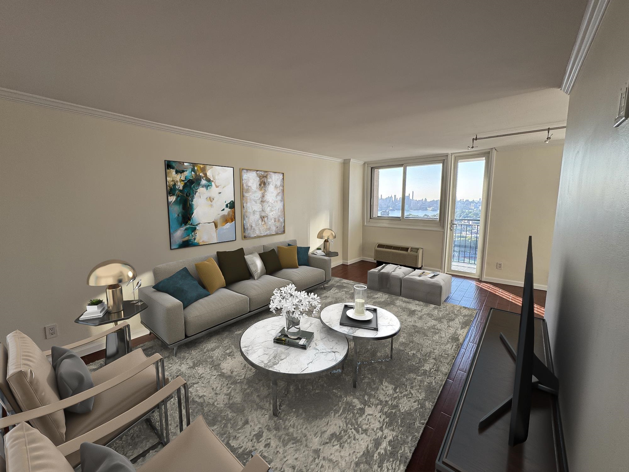 Center stage and you have a front row seat with the enticing views of the NYC skyline from your private balcony where every sunrise is unique! Welcome to this spacious 2br/2ba 1,045 sqft unit offering a galley kitchen with stainless steel appliances, beautiful hardwood floors throughout and new windows. Perfect for that NYC commuter with free shuttle service at the door to Hoboken Path, NJ Transit steps away, a 20 minute commute into the city. The Doric offers its residents a quiet work space, pool, garden and residents lounge all with wifi for those who work from home. Enjoy the pool and sundeck on a hot day or relax in our garden with the tranquil view. 24hr concierge, guest parking, dry cleaning, atm and a pet friendly building with a dog park across the street…woof.