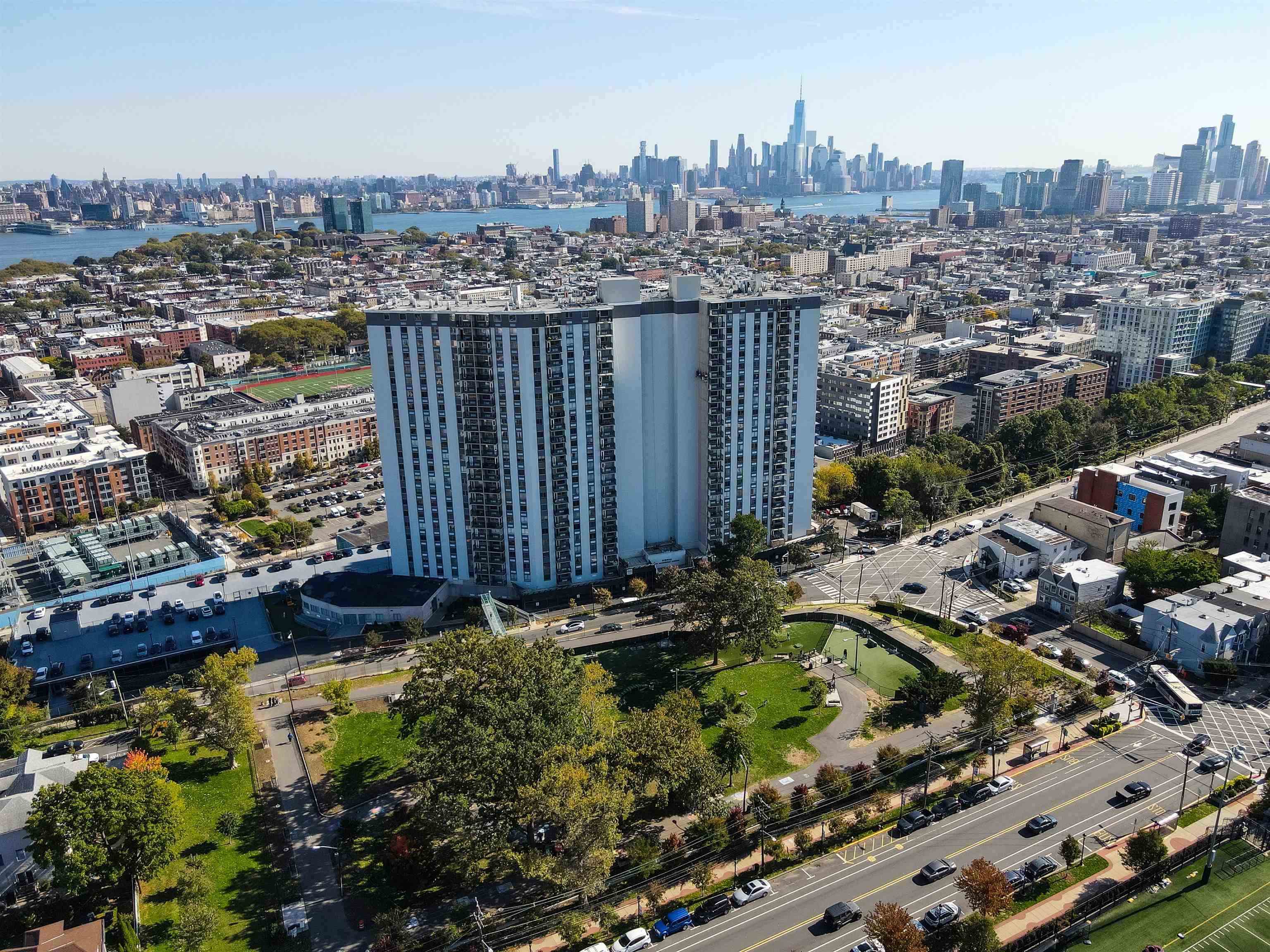 Visit this 2BDRM, 2BTH ‘CORNER’ residence with panoramic NYC and Hudson River views. HOA/Maint. Includes (TAXES, HEAT, AIR CONDITIONING, ELECTRIC, HOT/COLD WATER, COMMON EXPENDITURES) The Doric Luxury Community towers directly over Hoboken offering breathtaking scenery from every window and your private balcony. Enjoy an extra large 1095sf of living space, custom window treatments, and polished hardwood floors throughout. The corner exposure allows light from sunrise to sunset. The extra wide kitchen offers a subway tile backsplash, smooth quartz countertop, shaker cabinets with polished hardware, and stainless steel appliances including a refrigerator, glass top range, dishwasher, and microwave. The well-proportioned primary bedroom is fitted with double closets and en-suite bathroom with a floating vanity and sliding glass door walk-in shower. The second bedroom offers a large closet and is located steps from the smartly designed guest bathroom offering a porcelain sink, modern fixtures, and a glass privacy panel spa-like shower. Combined with brilliant views, this full-service building includes terrific amenities and a coveted location, just minutes to NYC via transportation or one block to Hoboken 9th St Light Rail station and located across the street from Washington Park with oversized dog run tennis and pickleball courts. Benefit from 24-hour concierge service, outdoor pool, residents lounge, gym, dry cleaner, deli, child daycare and reasonably priced on-site parking. Storage available for fee. Shuttle to Hoboken PATH or NY Waterway Ferry.