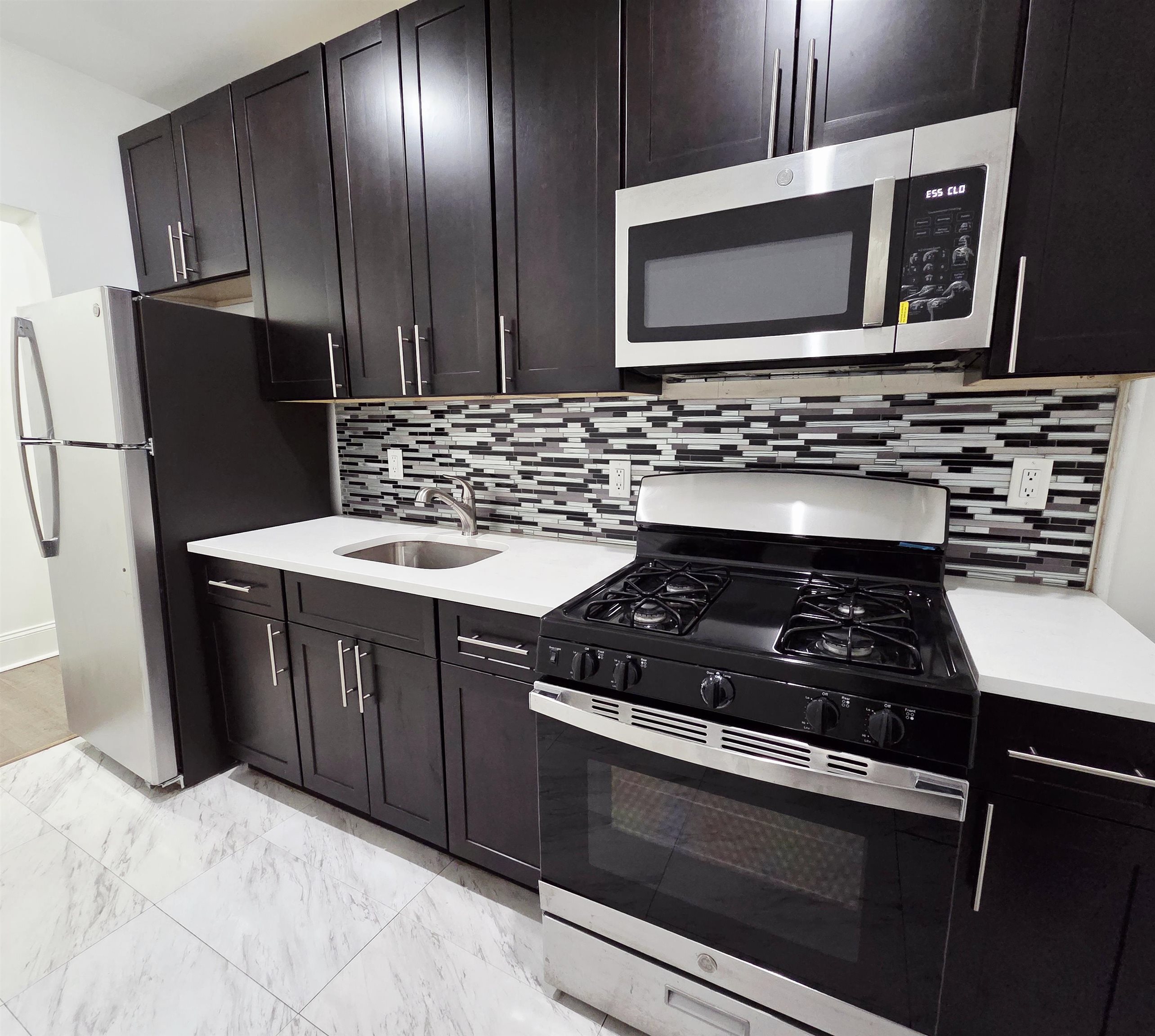 Welcome home to this fully renovated 1 bedroom apartment in the heart of Journal Square! This well sized unit is the ideal place to call home. Upon entry, you are greeted by a gorgeous kitchen with new stainless steel appliances, quartz countertops, and beautiful dark wood cabinets to match. There’s also a great sized living room, a nice sized bedroom, and brand new bathroom. There’s also a laundry room for added convenience. The apt is ideally located near all shops, restaurants, schools, and just a few blocks from the Path Station. This is the place you’ve been looking for, call for a private tour today!