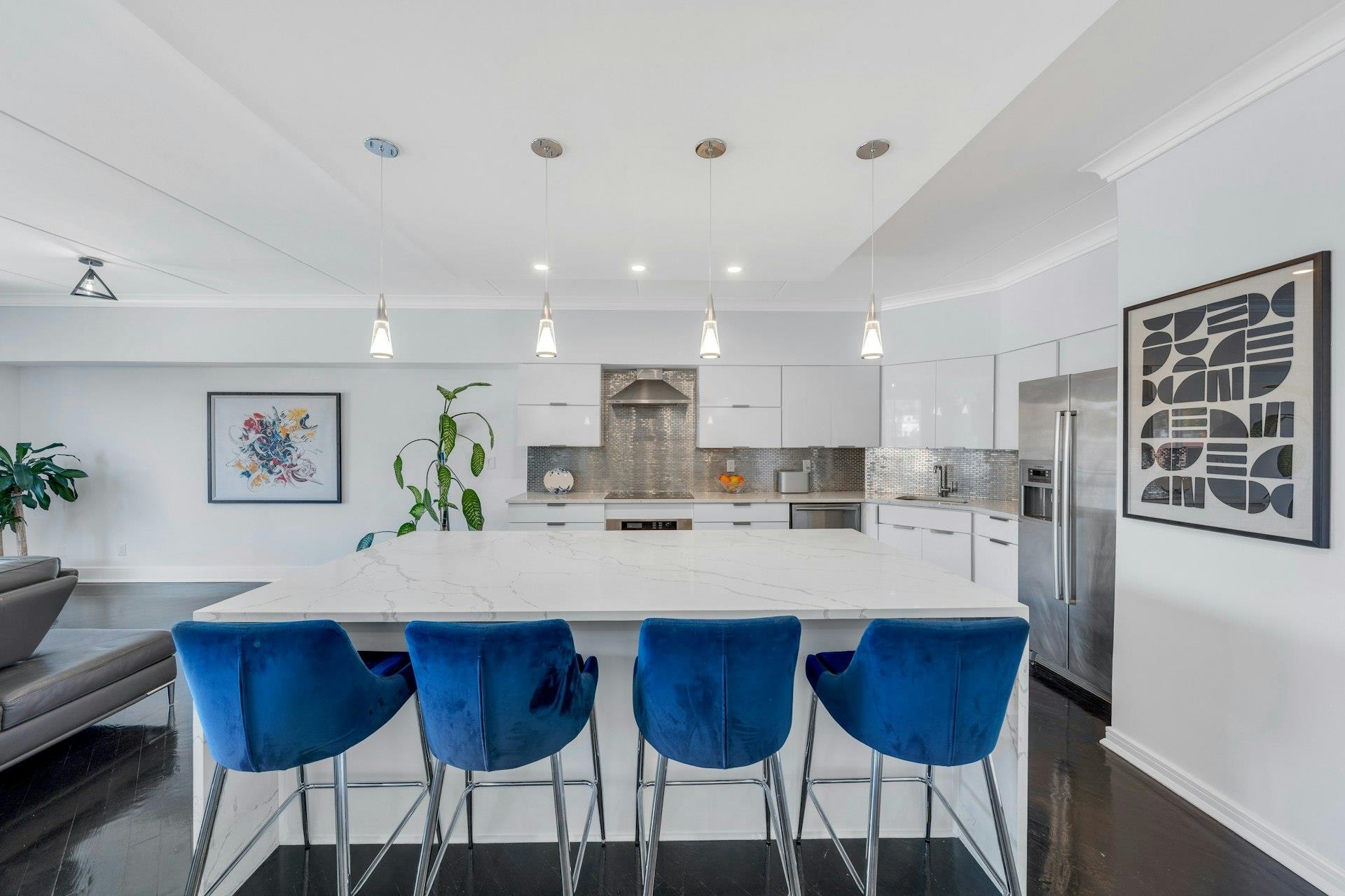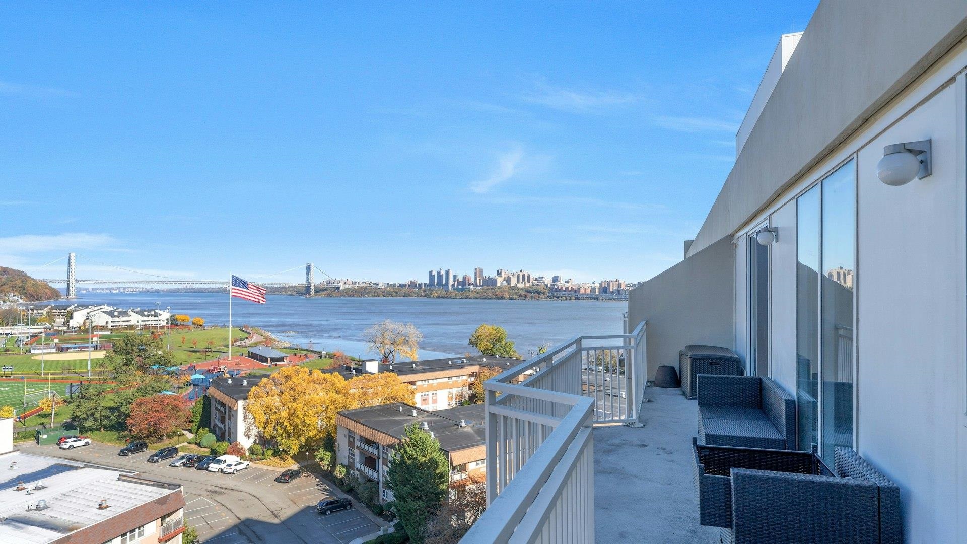 Impressive designer 2BR/2BA penthouse in prestigious gated community of Admirals Walk, offering the ultimate in luxury waterfront living. Enjoy captivating, unobstructed views of the Hudson River and George Washington Bridge from every room as well as the expansive private terrace that’s perfect for relaxing or entertaining. This stylish home features an open-concept living and dining area flooded with natural sunlight from oversized windows and hardwood floors throughout. The sleek high-end kitchen showcases a quartz waterfall center island, high-gloss cabinetry and a metallic backsplash combining sophistication and function. The spacious primary suite offers a serene retreat with a walk-in closet, Porcelanosa finished bathroom and another private terrace. The second bedroom features two generous closets. Outside of the bedrooms are 2 additional large storage closets in the hallway. Additional highlights include a large spa-inspired guest bathroom and two parking spaces – one outdoor space number 18 right by main entrance and one deeded covered space 33 (negotiable). Exceptional resort-style amenities include: 24-hour security and FT super, concierge, doorman, outdoor pool, hot tub, BBQ/picnic areas, fitness center, sauna, 2 tennis courts, basketball courts, community room and a private riverfront walkway. Convenient to NYC buses, ferries and dining and shopping.