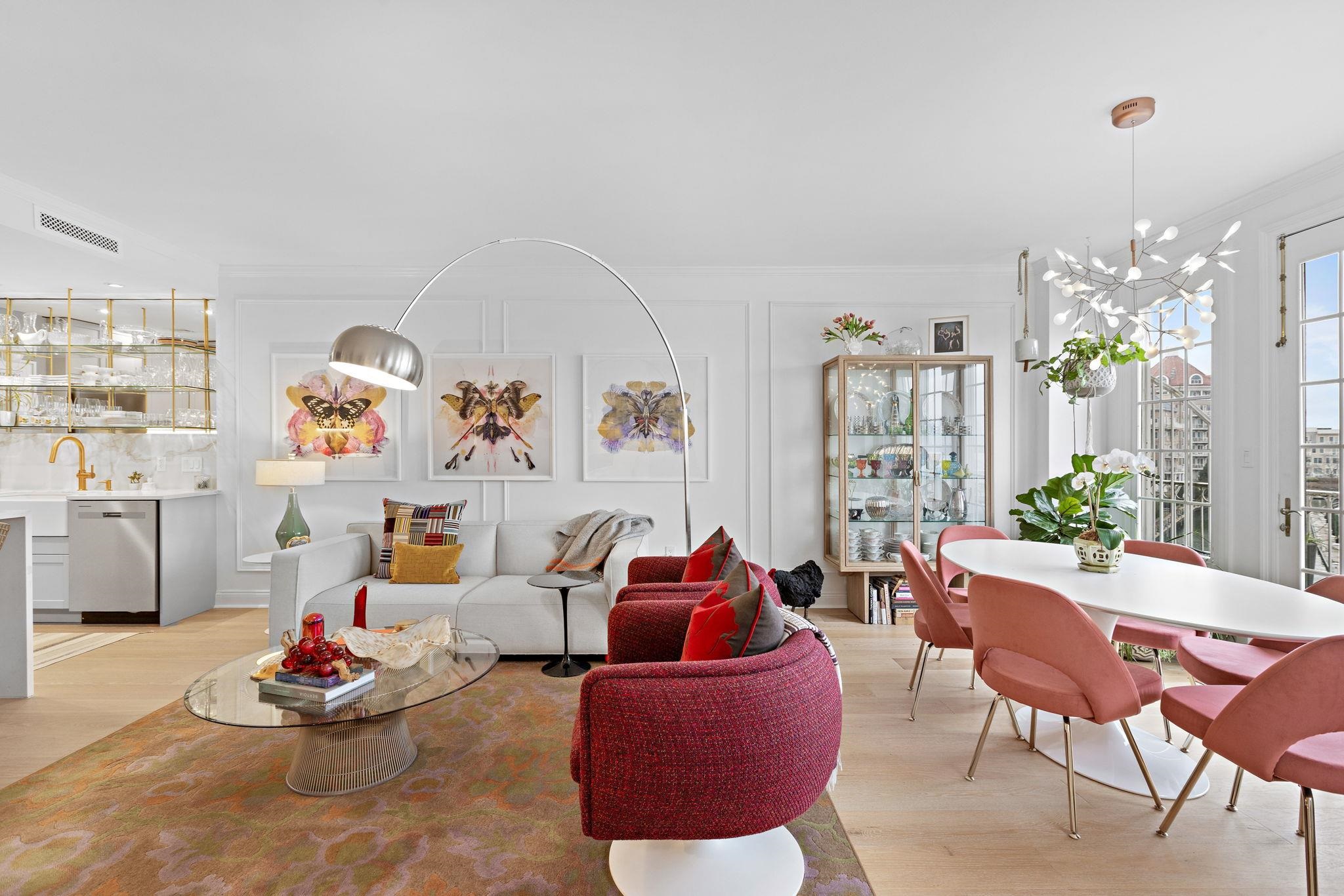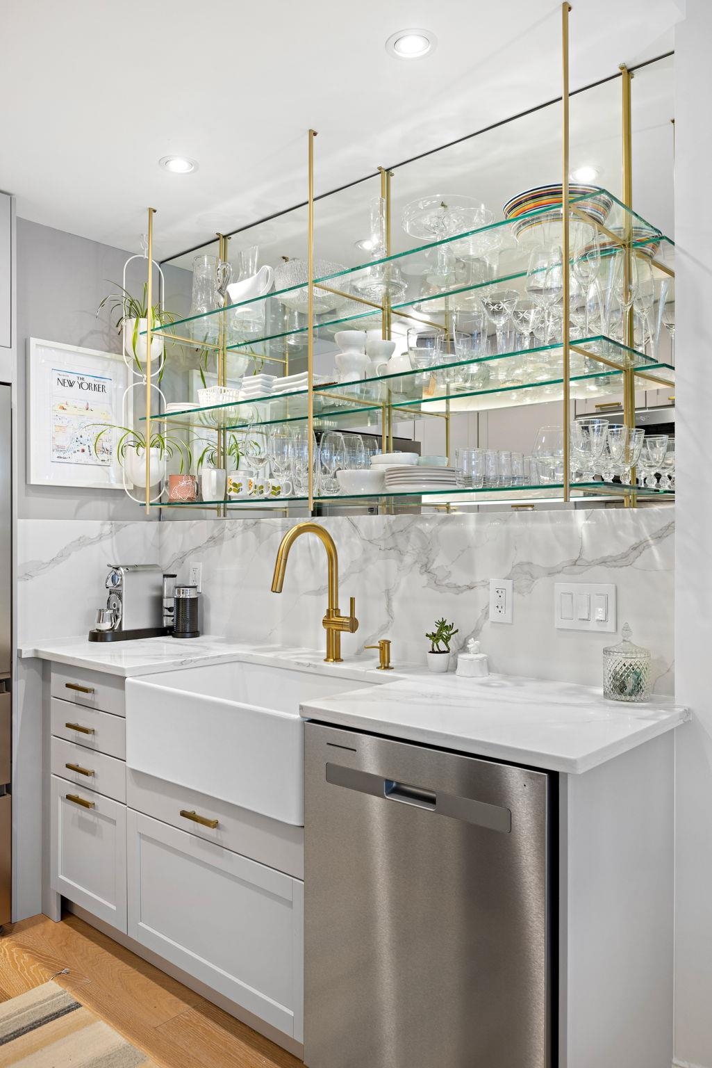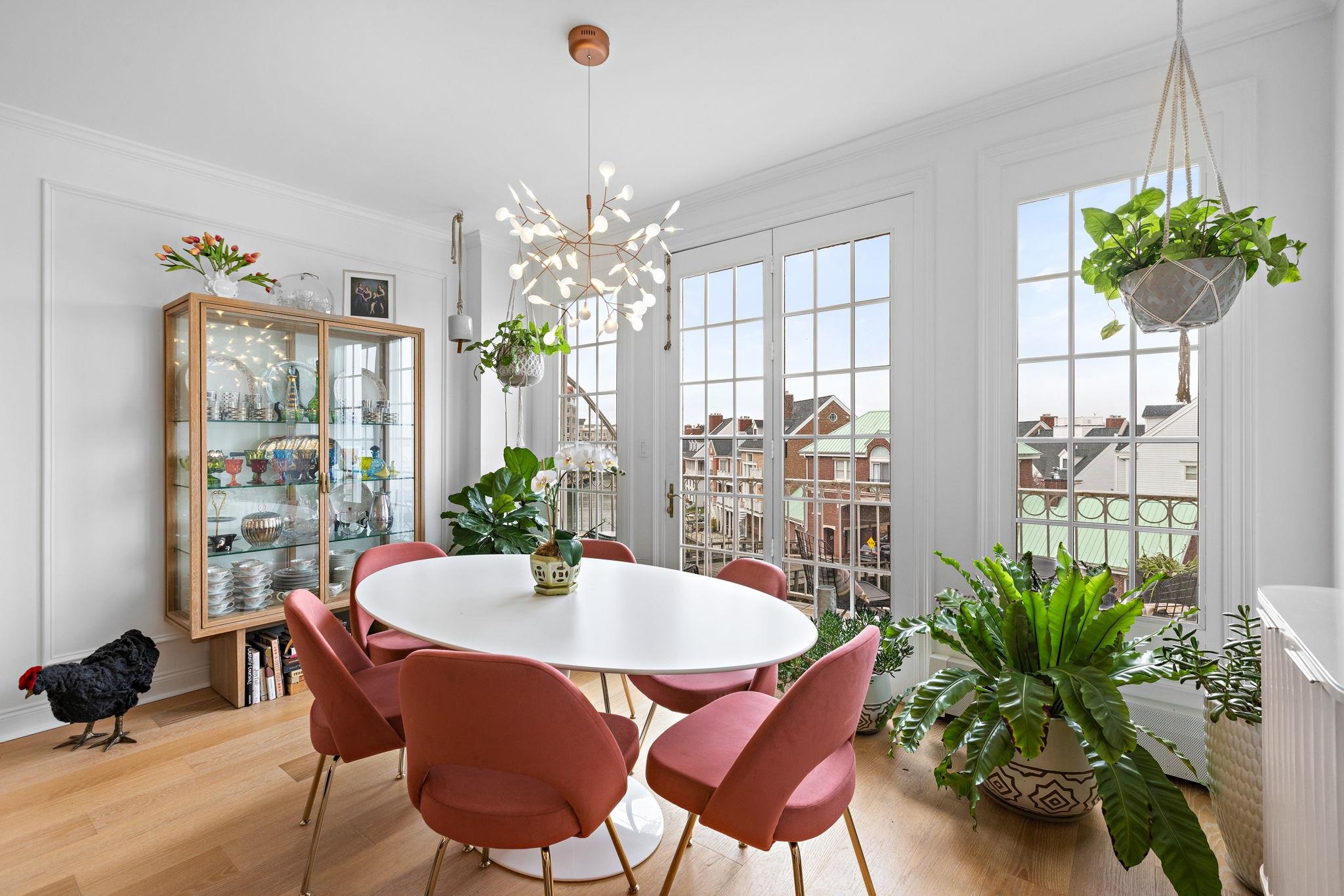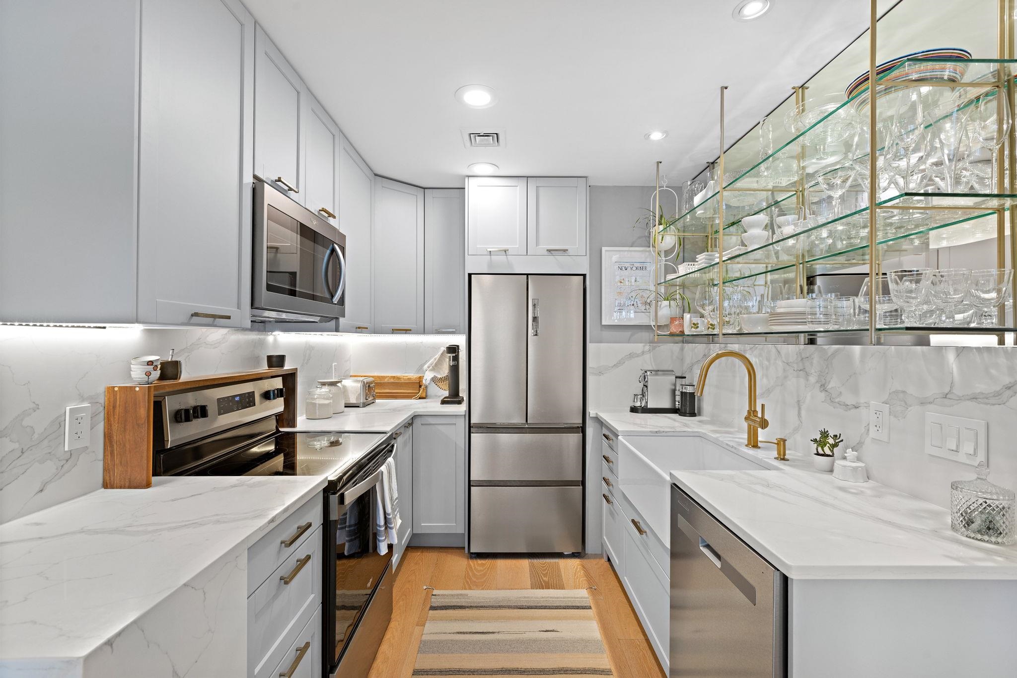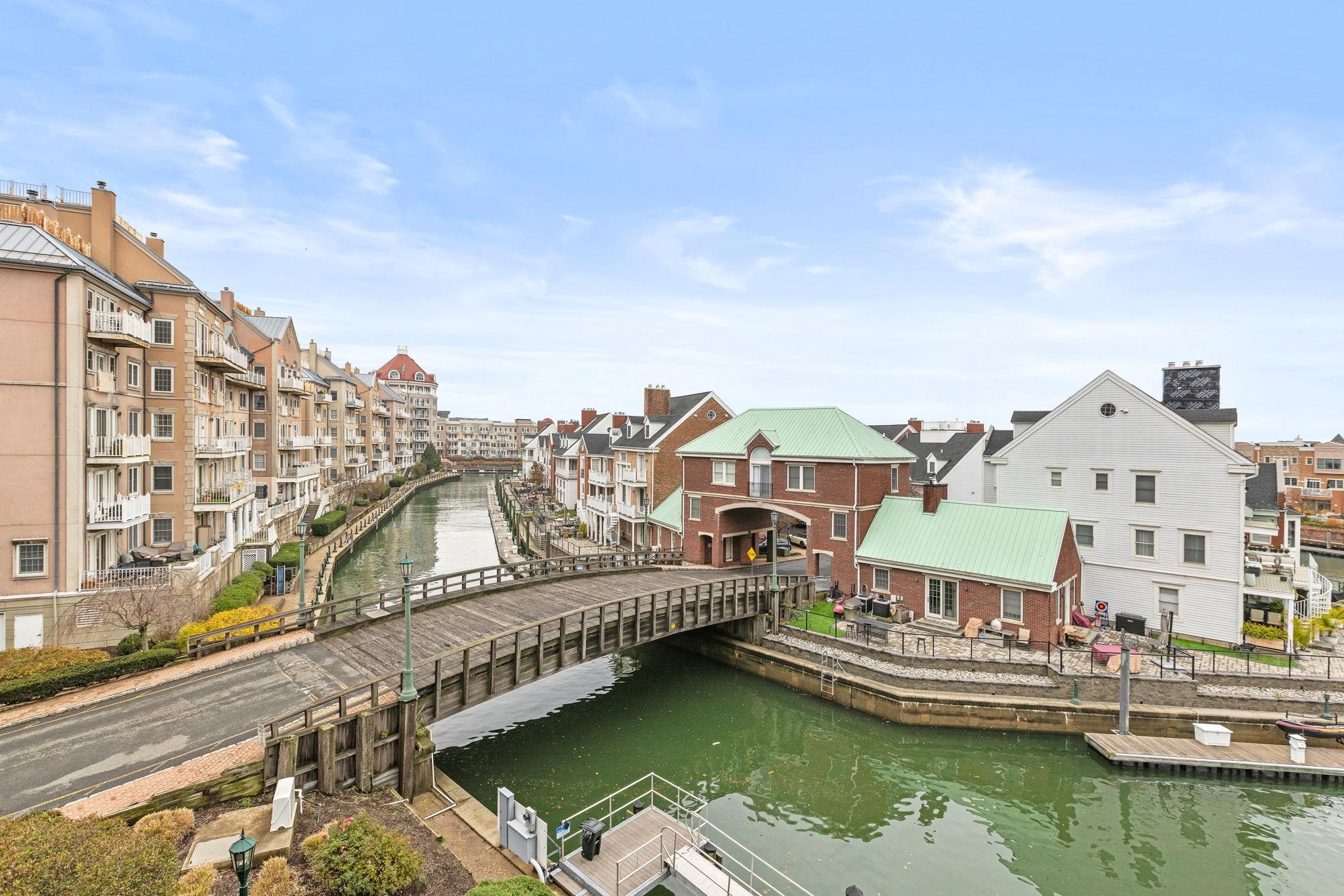 Bespoke Stunner! Step into your new home that lives like a work of art. Natural light, custom millwork, and elevated design come together against a backdrop of peaceful waters and picture perfect NYC skyline views. This is Port Liberté living reimagined. The sun splashed open living and dining space is framed by oversized windows, French doors and custom millwork, flowing effortlessly to a private balcony overlooking the tranquil canals and priceless view. The designer kitchen is a true showpiece — tailored cabinetry with double corner pantries, quartz counters, brass accents, open glass shelving, a farmhouse sink, premium appliances and stylish breakfast peninsula — delivering a functional ambiance curated for effortless entertaining. The spacious bedroom is a true retreat, featuring elegant paneling, Juliette balcony access, and a boutique-style walk-in closet. The luxurious bath showcases floor-to-ceiling marble, upscale fixtures, mirrored storage and an oversized vanity. In-unit laundry and central HVAC add everyday ease. Unparalleled resort-style amenities elevate the experience: 24-hour security, two pools, a fitness center, tennis and basketball courts, waterfront walkways, on site restaurant, private marina with boat slips and a nature sanctuary are just the highlights. Ultra convenient direct ferry service to lower Manhattan plus daily private shuttle service to the PATH. Assigned, attached garage parking included. A rare opportunity to own a turn-key designer residence in one of Jersey City’s premier waterfront enclaves — where lifestyle takes center stage and every detail inspires.