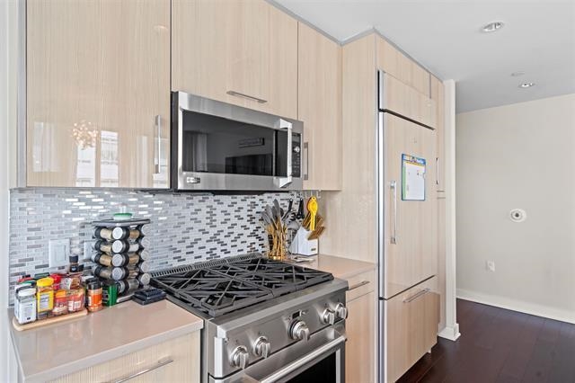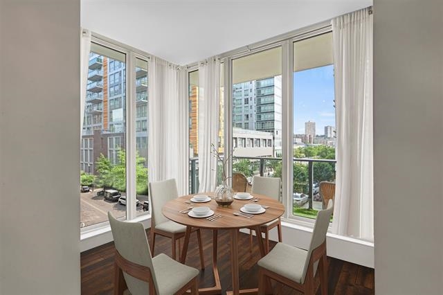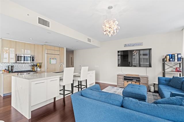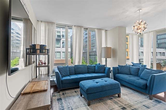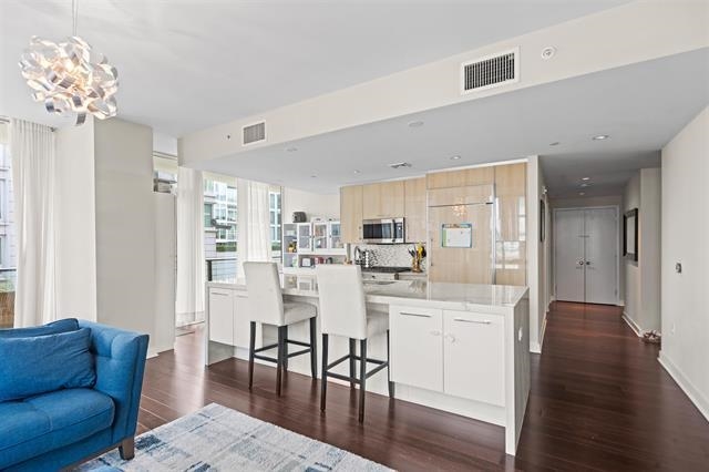 Experience upscale living in this stunning 3-bedroom, 3-bathroom corner unit condo spanning 1,784 square feet. This luxurious home features a wrap-around balcony, offering breathtaking views and abundant natural light through floor-to-ceiling windows. Hardwood floors throughout enhance the spacious and bright ambiance. The chef-designed kitchen is a culinary masterpiece, boasting a waterfall quartz countertop and Spazzi custom cabinetry. Ample storage ensures all your needs are met. This prestigious building offers unparalleled amenities, including 24-hour concierge service, a fully-equipped gym, a serene pool, a screening room, and an elegant sky lounge. Additionally, enjoy the convenience of one-car garage parking. Embrace a lifestyle of sophistication and comfort in this exquisite residence. Welcome home.