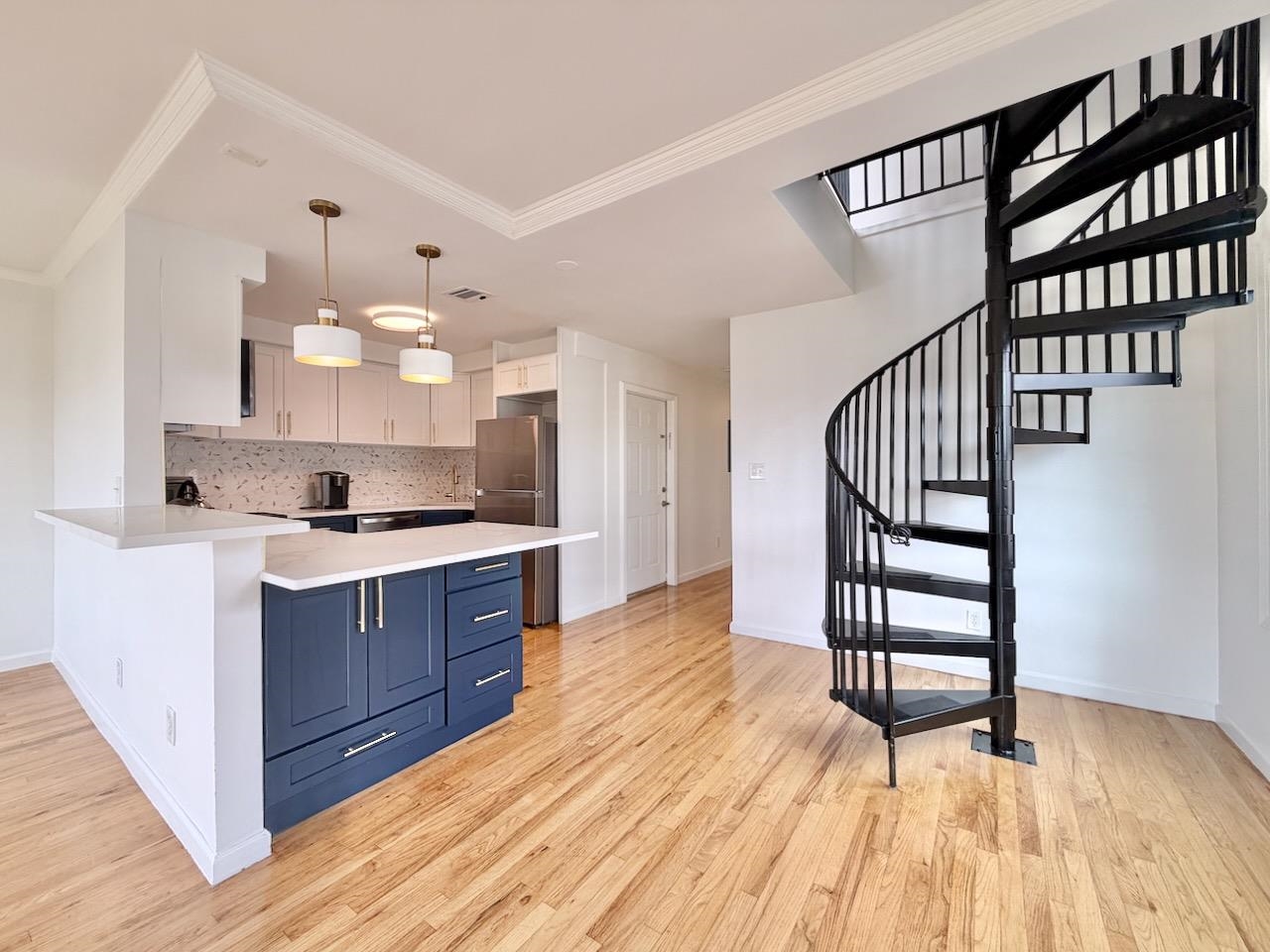 Newly renovated 4 bed 2 bath home with stunning NYC views, parking, central air, washer/dryer in unit, and lots of storage space located on gorgeous Ogden Ave in Jersey City Heights near Riverview Park. Four bedrooms including the primary with soaring ceilings and en-suite bathroom, two full bathrooms both completely renovated with modern tiles and fixtures. The east facing living room has direct NYC and Hudson River views through the large picture window and sliding glass doors that lead to one of the three private outdoor spaces. The chef’s kitchen has lots of storage space with the dual color shaker cabinets, stainless steel appliances including dishwasher, gas stove, built-in microwave, and refrigerator, and plenty of workspace on the large beautiful Carrara quartz countertops that include a breakfast bar. The kitchen opens up to an expansive living room with space for a dining room table near the spiral staircase. Go upstairs to the fourth bedroom or office which also has an NYC view. From there step out onto your large rooftop deck with plenty of space for seating, lounging, and grilling. The small door leads to a large attic storage space. One car parking in the driveway is optional. Outside your front door awaits Jersey City’s finest dining, Corto, Bread and Salt, Lo Fidelity, ModCup, Prato Bakery and Choc-o Pan. Not to mention Smart Start Academy daycare should you need one and direct bus line to NYC’s Port Authority. Enjoy the Riverview Park farmer’s market every Sunday, as well as the dog park, children’s playground, and neighborhood garden. Available ASAP