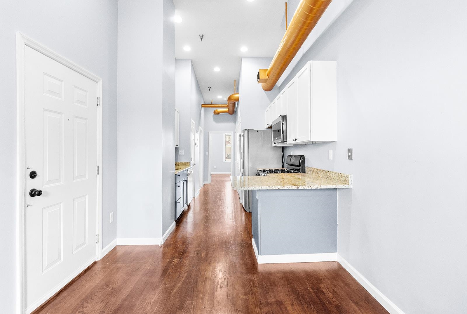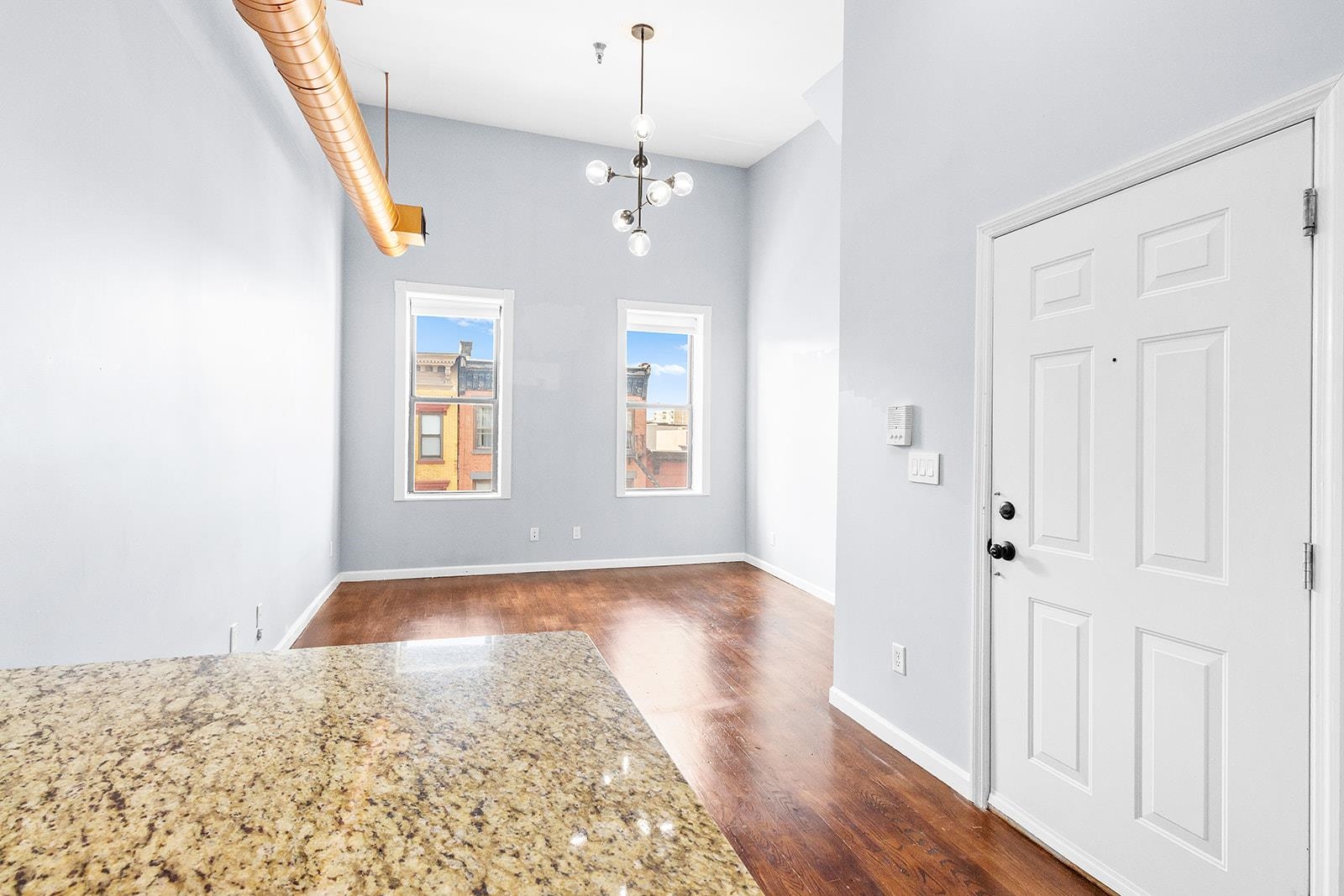 Stunning Penthouse-level rental in Downtown Hoboken with 14 foot high ceilings! Wake up to incredible Midtown-NYC views from your bedroom windows while enjoying the peace & quiet from no neighbors living above your unit. A beautiful kitchen with granite counters & stainless steel appliances opens up to your living room for easy entertaining. Enjoy the luxuries of in-unit Washer/Dryer, Central A/C and custom California Closets in your bedroom & coat closets! All of this within an incredibly convenient location in town, close to restaurants, shopping and transit.