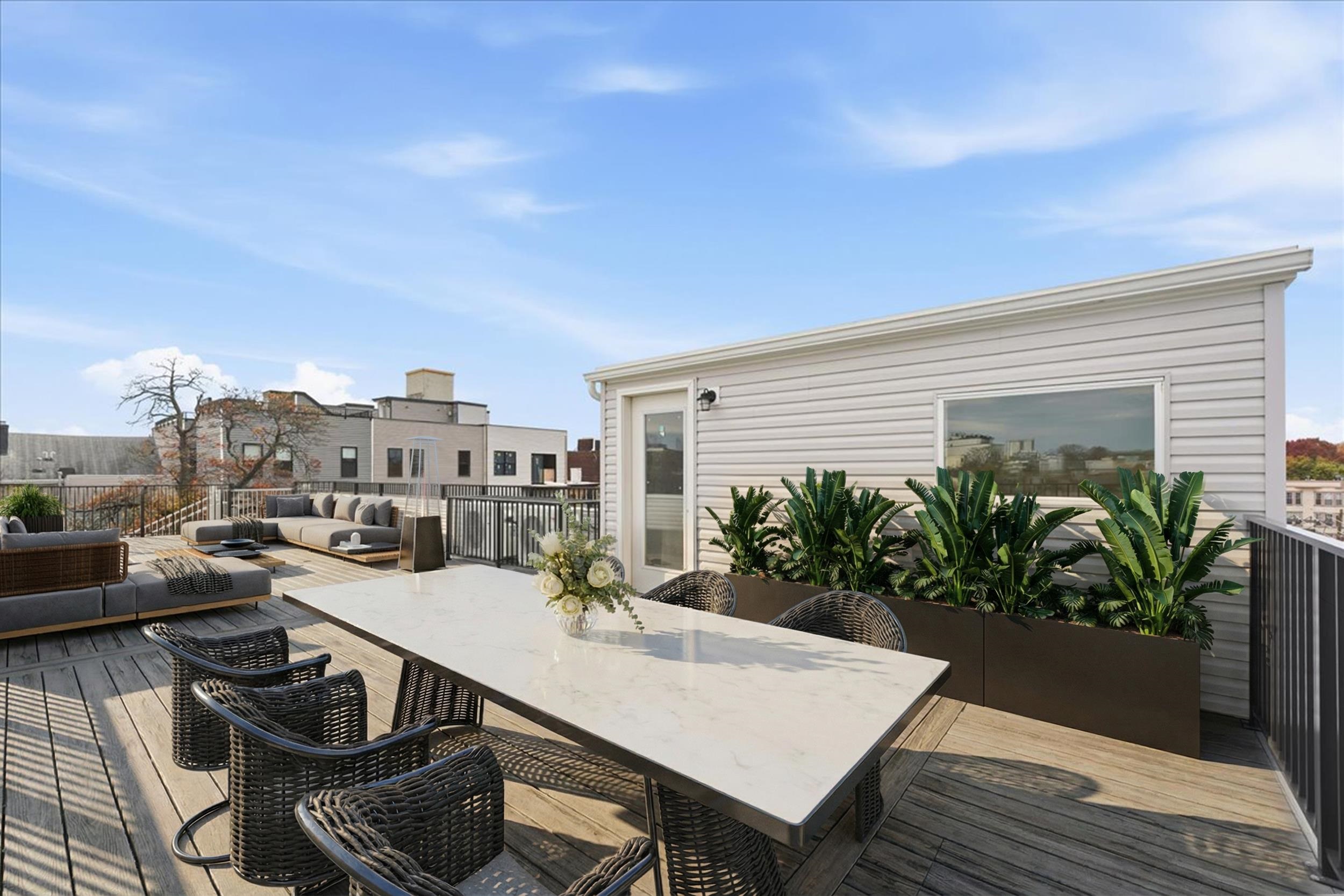 Designed for both serenity and sophistication, this elevated home offers modern finishes, tree-top views and an unbeatable Heights location just 1 block to 2nd Street stairs and Lightrail station. A hidden haven in the Heights, this beautifully crafted 3 bed, 2 bath residence blends bespoke finishes with gorgeous private rooftop-shared with unit 3- for a rare retreat. Wide plank floors ground the space, while natural light floods through the floor-to-ceiling windows illuminating the open floorplan. The kitchen offers clean lines and contemporary flair with modern white & blue cabinetry, gleaming quartz countertops, herringbone tile backsplash, sleek brass-accented fixtures and stainless steel appliances. Both bathrooms are beautifully finished with floor-to-ceiling porcelain tile, herringbone floors, and luxurious rainhead multi-spray shower systems and soaking tub. One bedroom is shielded with privacy glass giving both sunshine and seclusion, while the primary ensuite showcases a full wall of glass for a gorgeous view & lots of natural light. Top it off with a brand new stacking LG washer and dryer for everyday ease and convenience. Situated just one block from the 2nd Street Light Rail station, this home not only provides direct access to Hoboken and NYC connections, but also Riverview Fisk and Pershing Field Park and Reservoir. Jersey City Heights is known for its vibrant community, excellent parks and schools, boutique shops and restaurants and close proximity to NYC and surrounding areas.