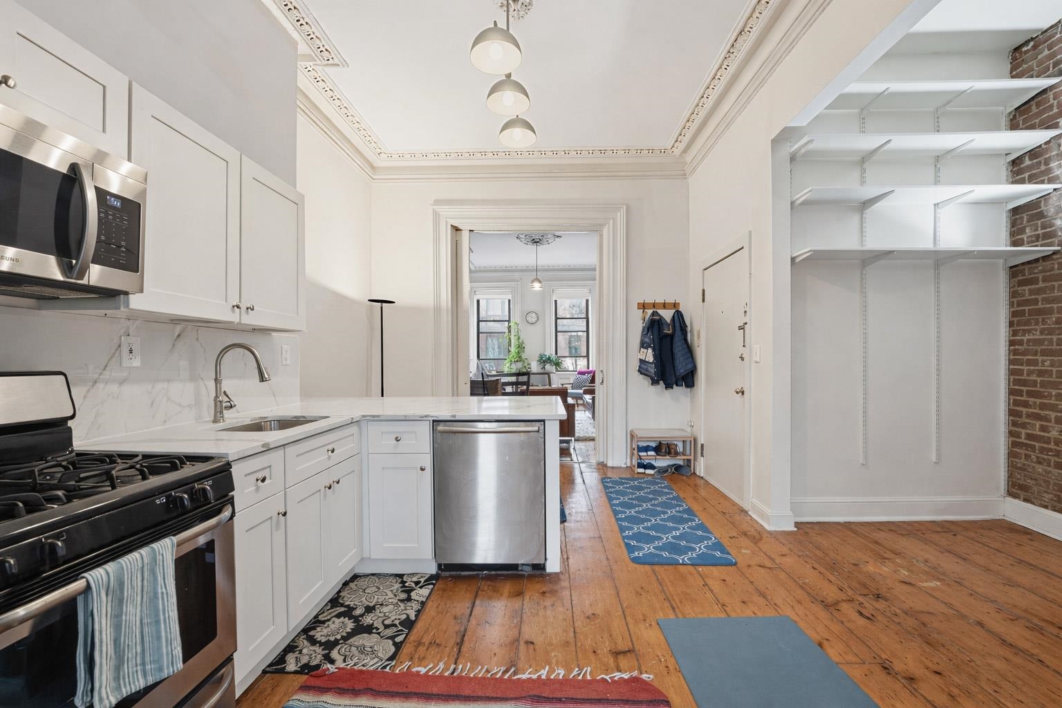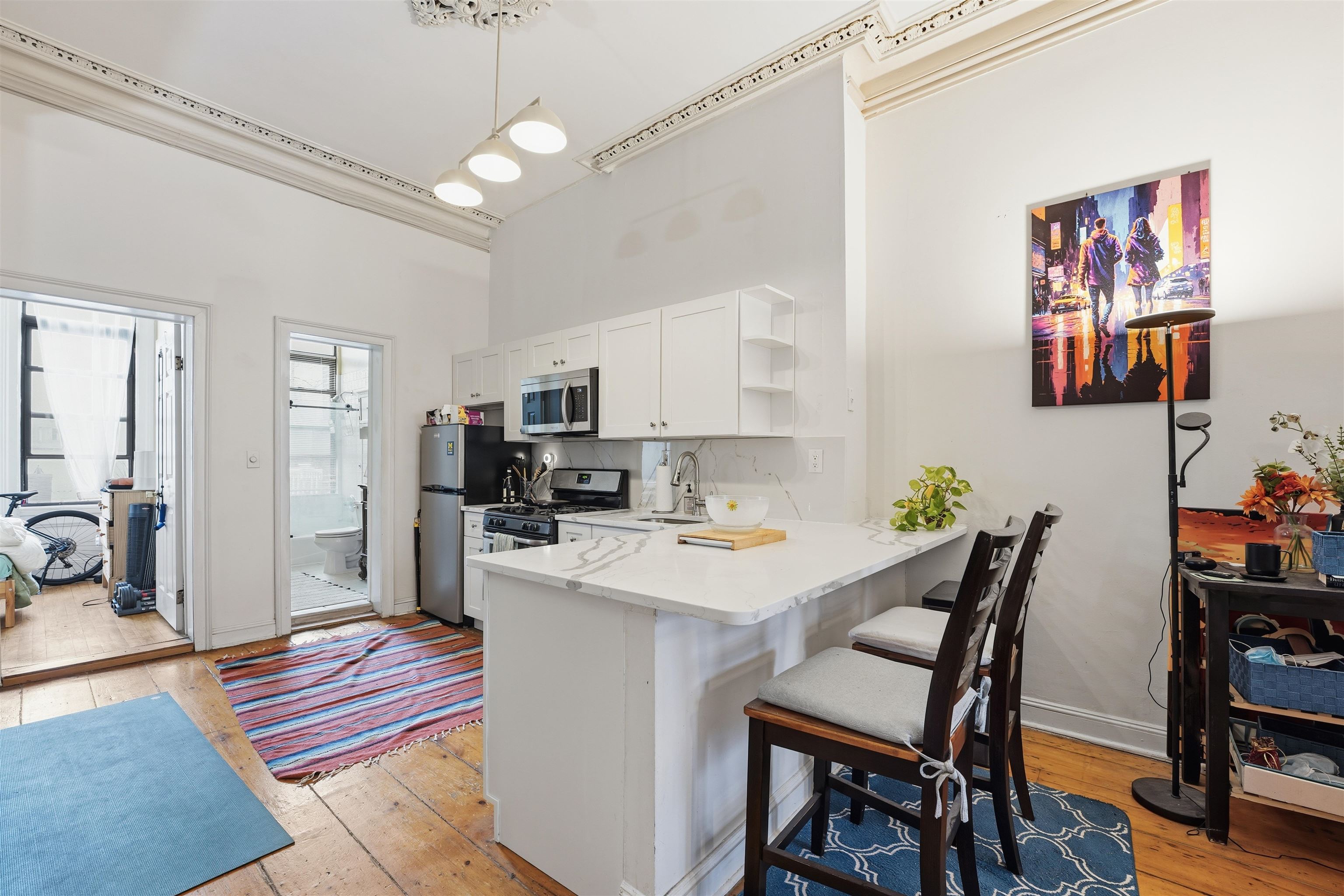 Welcome to this stunning parlor-level condo, where soaring ceilings and beautifully preserved old-world charm shine within a classic historic brick row house. Ideally situated on Park Avenue in downtown Hoboken, just a short distance to the PATH, this home is also blocks from Washington Street’s renowned dining and shopping, as well as the ferry, Light Rail, trains, and buses. The residence features an open, airy layout with generously sized rooms that feel even more expansive thanks to the impressive ceiling height. Original ceiling trim and detailed moldings have been impeccably maintained, highlighting rare and exquisite historic craftsmanship throughout. Additional highlights include wide-plank hardwood floors, exposed brick, a decorative fireplace, extra storage conveniently located outside the unit, and common laundry on the ground floor. The renovated kitchen is both stylish and functional, offering abundant cabinetry, a full suite of appliances, a breakfast bar, and a designated dining nook in the area where the current cabinetry stands—ideal for everyday living and entertaining. The bathroom is bright, inviting, and well-appointed. Currently configured as a one-bedroom, the home has been thoughtfully utilized as a highly functional two-bedroom, with the living room positioned in the former dining area and a second bedroom located at the front of the home—providing exceptional flexibility to suit your lifestyle needs. Rental parking may be available at nearby municipal garages, current owner easily finds parking in front of home.