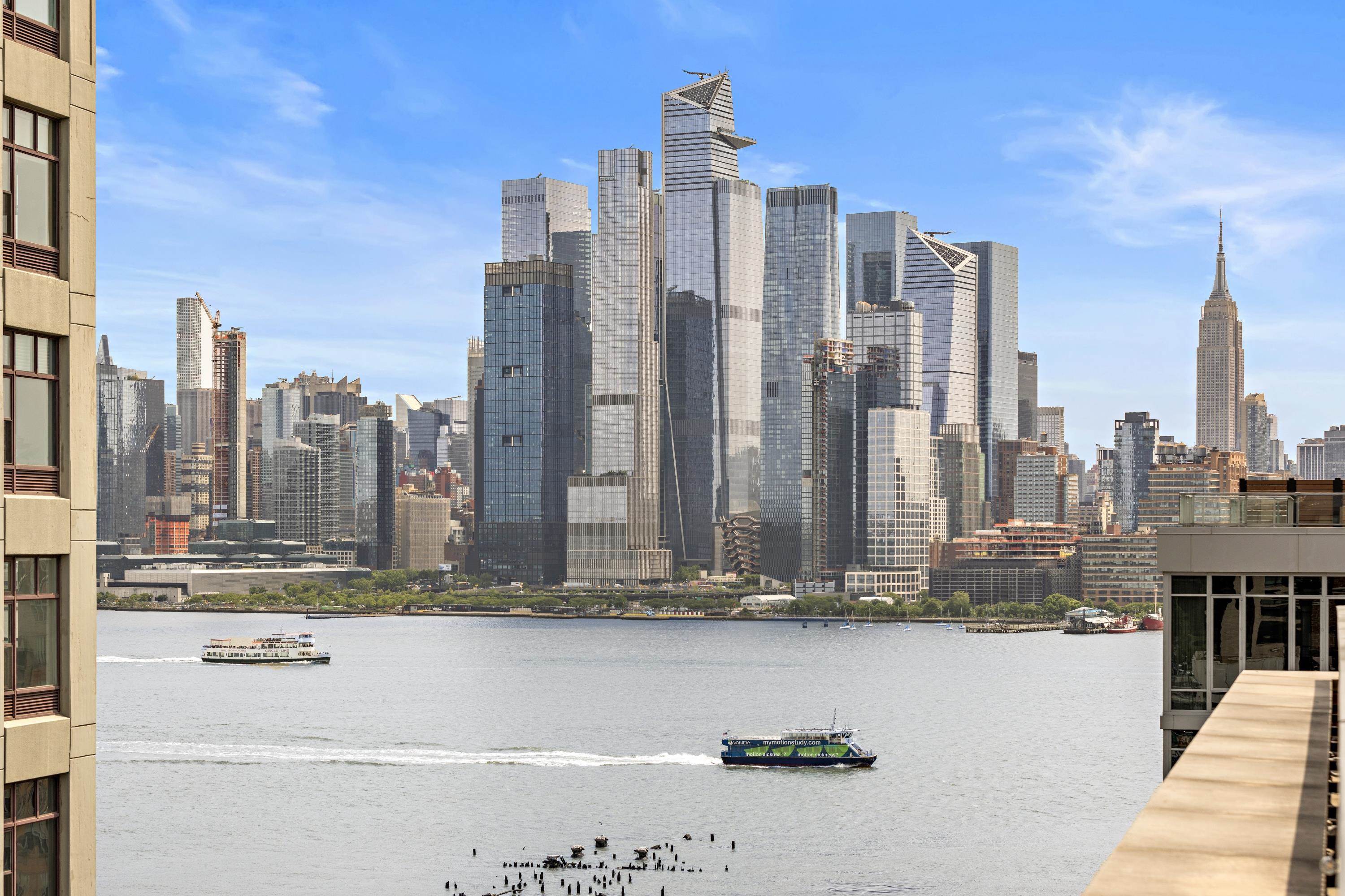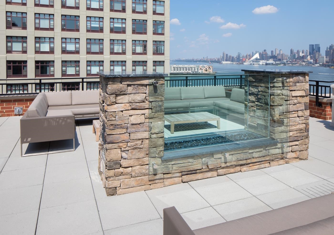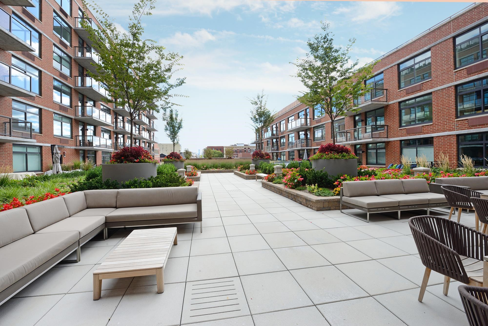 Move into this rare South-facing 900 sqft, 1 bedroom, 1.5 bathroom home in the Luxury Waterfront Building, 1400 Hudson! This home comes with a deeded private rooftop terrace featuring stunning NYC views. Home features oak hardwood floors throughout, tons of natural light, and ample closet space. Spacious open concept kitchen with quartz counter tops, Bosch ss microwave, Thermador refrigerator, & oven/range gas. Building has world-class amenities including two gyms, game room, pool, resident’s lounge, 24 hour concierge, children’s playroom, and rooftop terrace with outdoors BBQ and TV. Washer/Dryer included in the unit. Easy commute to NYC with shuttle service to the path and steps away from both the NJ Transit bus and NY Waterway Ferry. Close to Trader Joe’s located 3 blocks away. Move-in Date: 4/1/26
