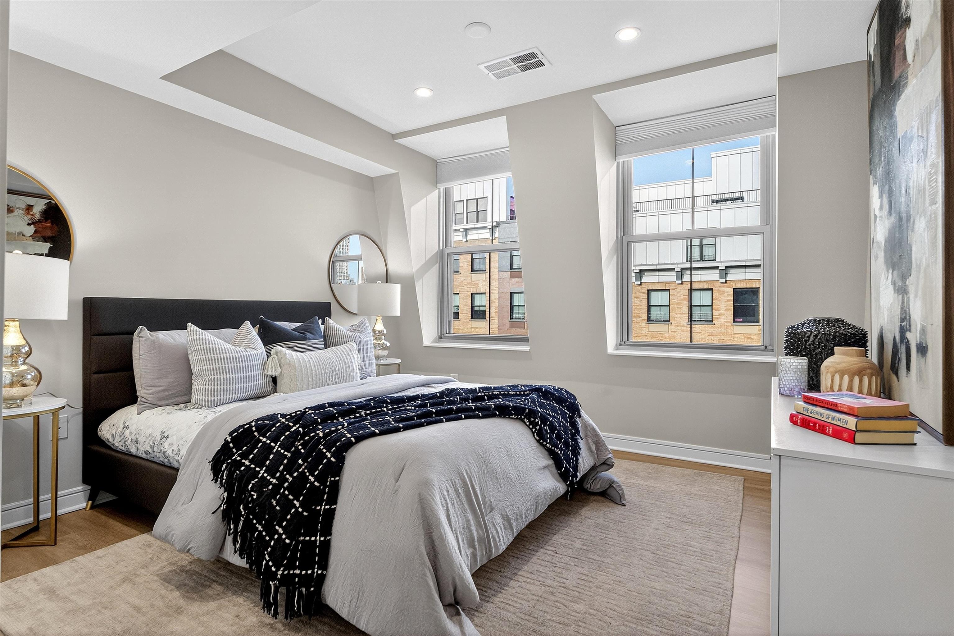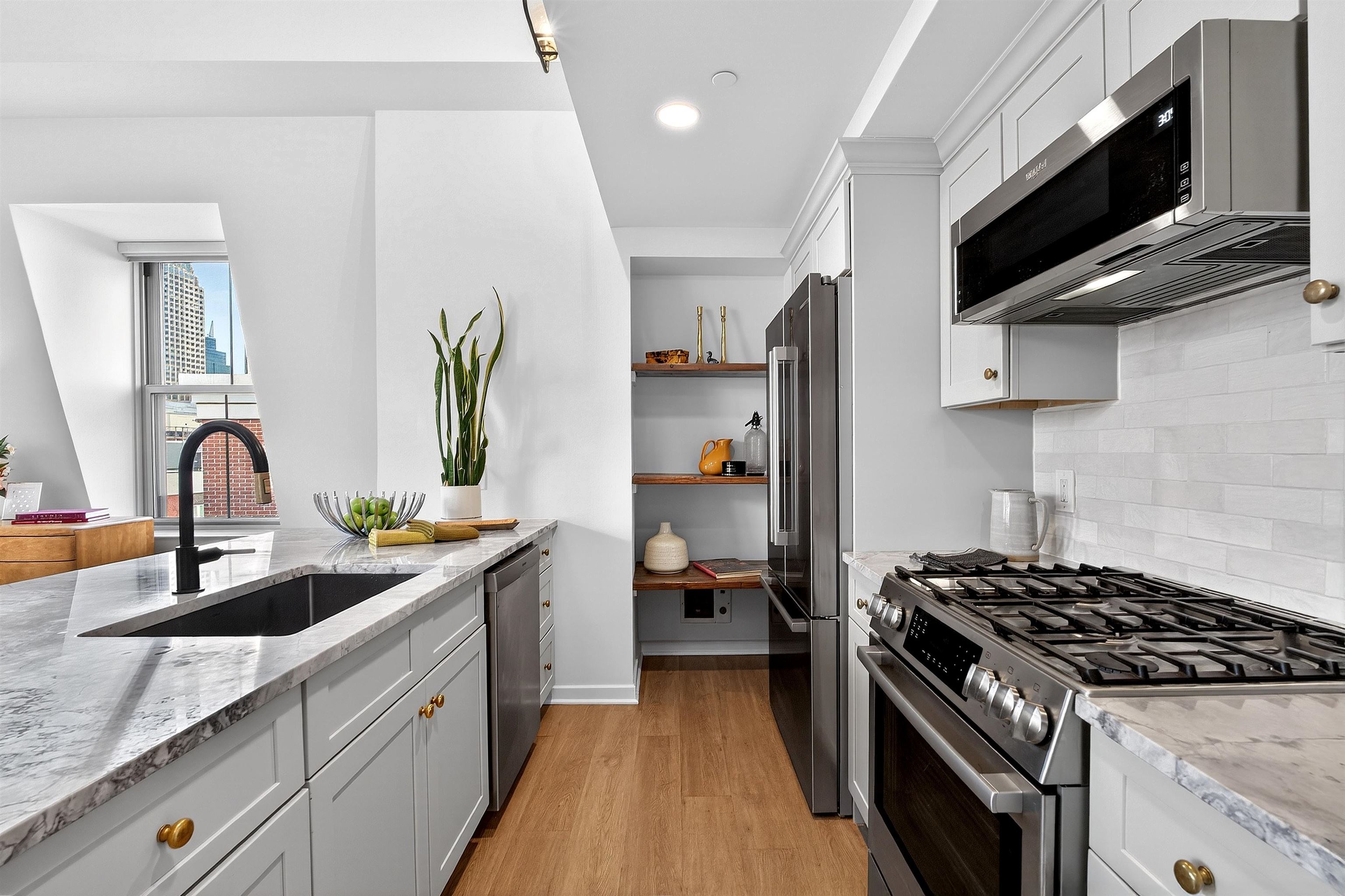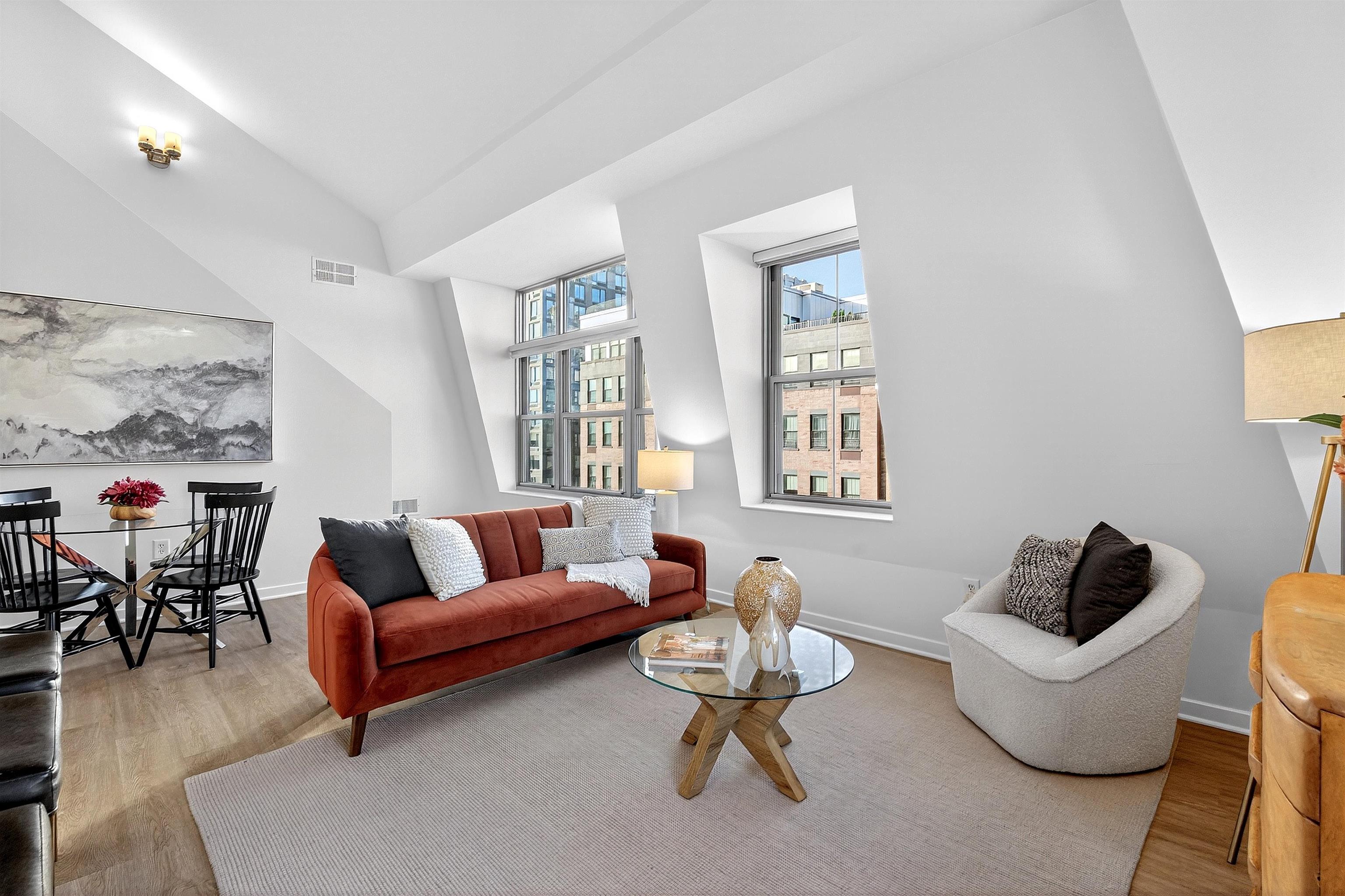 This recently renovated Paulus Hook penthouse duplex offers 1,453 square feet of luxurious space and is one of only a handful of true three-bedroom homes in the building. The 3 bed plus office/den, 3 bath residence is filled with light and volume, featuring soaring 18-foot vaulted ceilings and open skyline & partial city views. The main living level is situated on the corner of the building and offers a generous open-concept layout with a wall of windows. The impeccably designed kitchen features marble-like grey quartz countertops, new custom cabinets with aged brass hardware, stainless steel appliances, reclaimed wood shelving and ample storage plus a huge four-seater peninsula. This opens up to the spacious living and dining area. This level also includes two generously sized bedrooms (one ensuite), two full bathrooms (which have both been beautifully updated in similar style to the kitchen), and abundant closet space throughout, including a walk-in closet. Upstairs, the primary suite functions as a true private retreat with a large bedroom that easily accommodates a king-sized bed, another updated ensuite bathroom, a walk-in closet, and a separate den ideal for a home office or additional flex space. Additional features of the home include central air and heat, an in-unit washer and dryer, custom closet organizational systems throughout, and one-car garage parking. Fulton’s Landing is a 24-hour, full-service doorman building offering a beautifully landscaped common courtyard, reception lounge, and fitness center. Located in Paulus Hook, the neighborhood provides easy access to multiple transportation options including the Exchange Place and Grove Street PATH stations, Light Rail, ferry service, and Citibike. The area also features excellent public and private school options including PS 16, the River School, Waterfront Montessori, and St. Peters Prep.