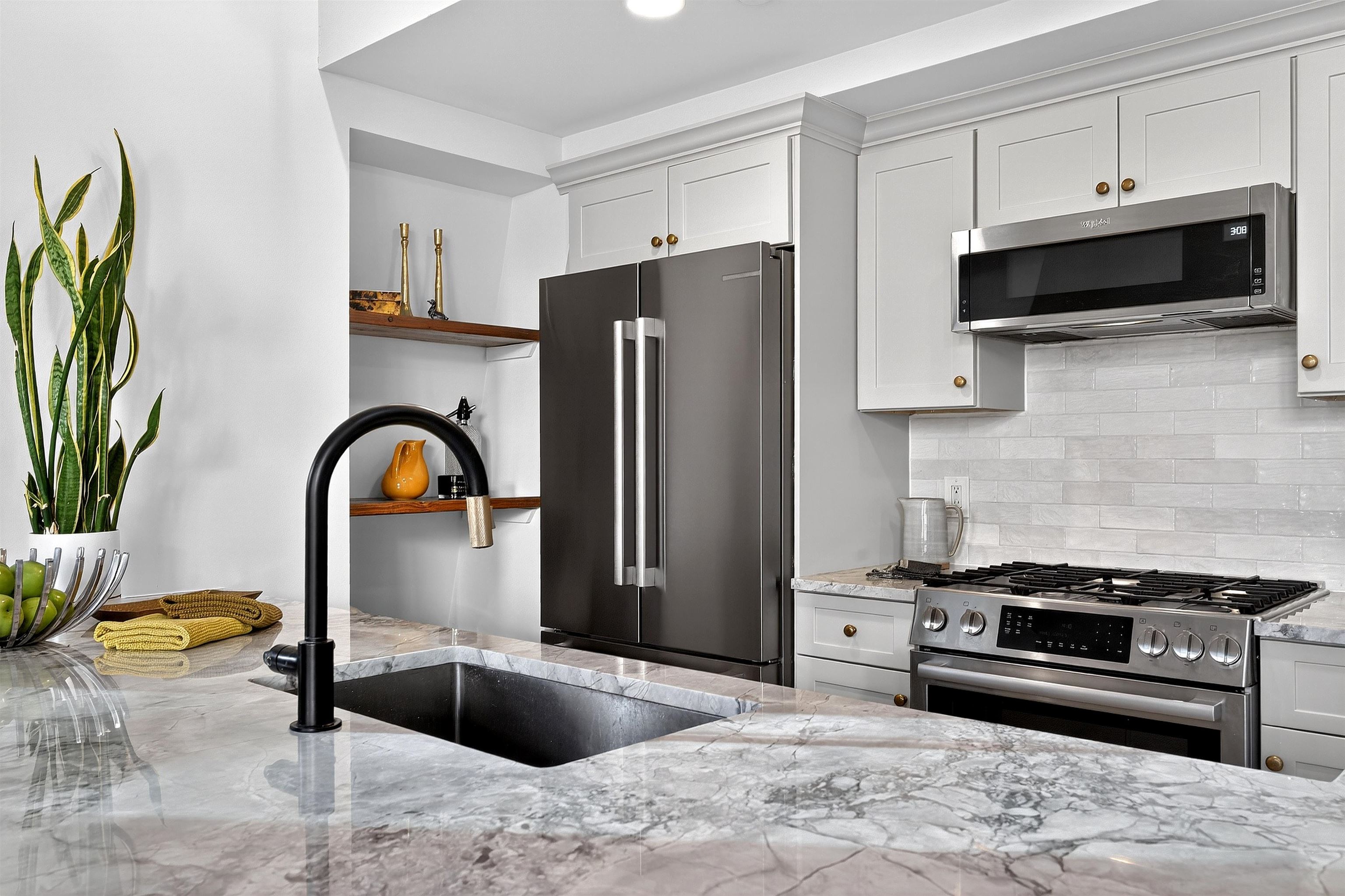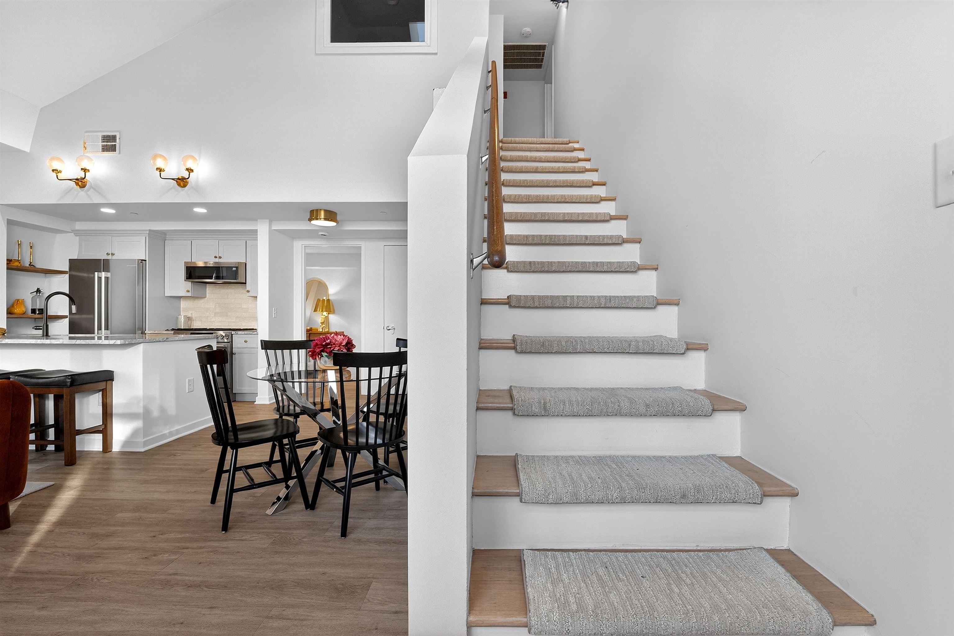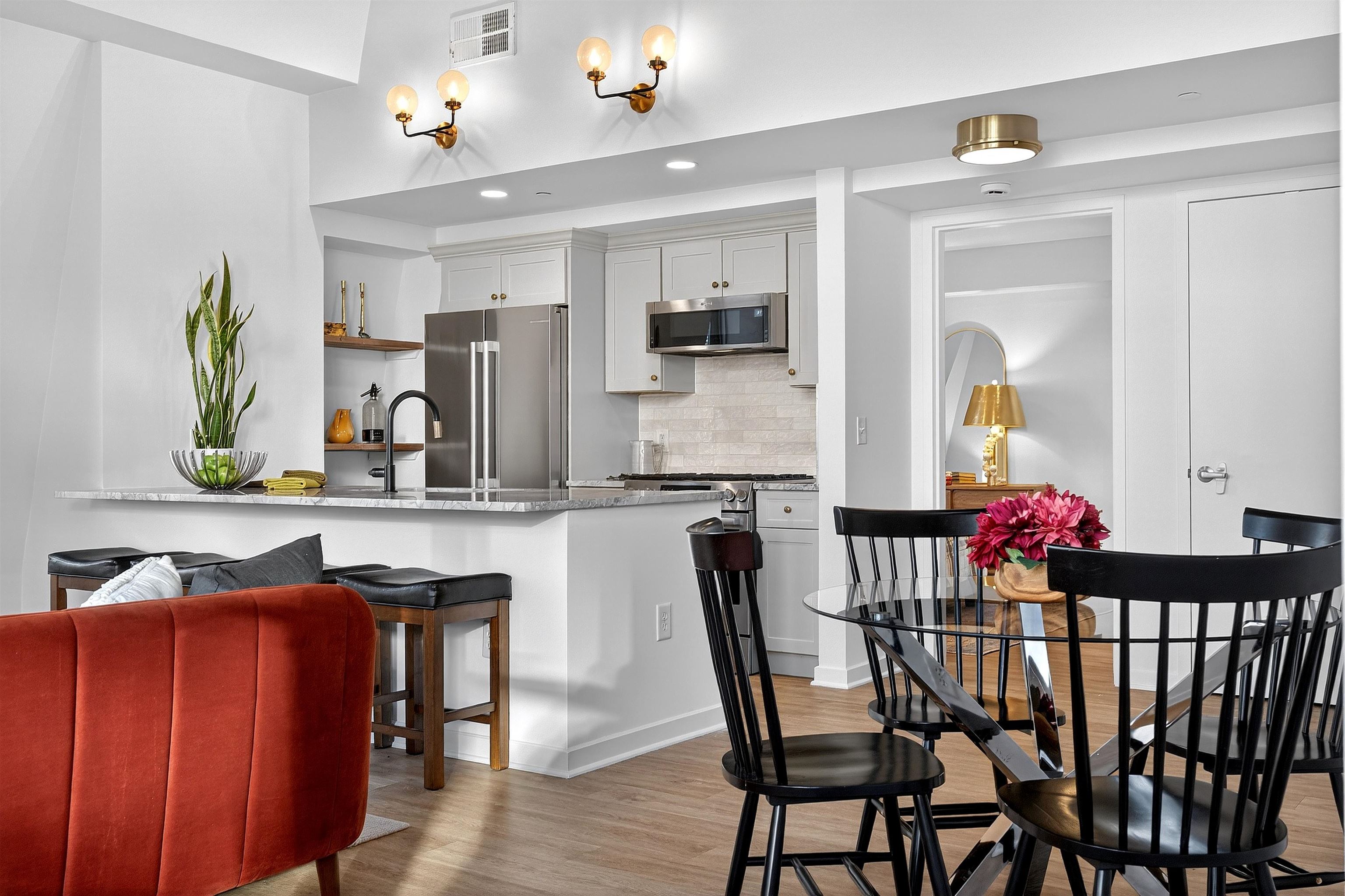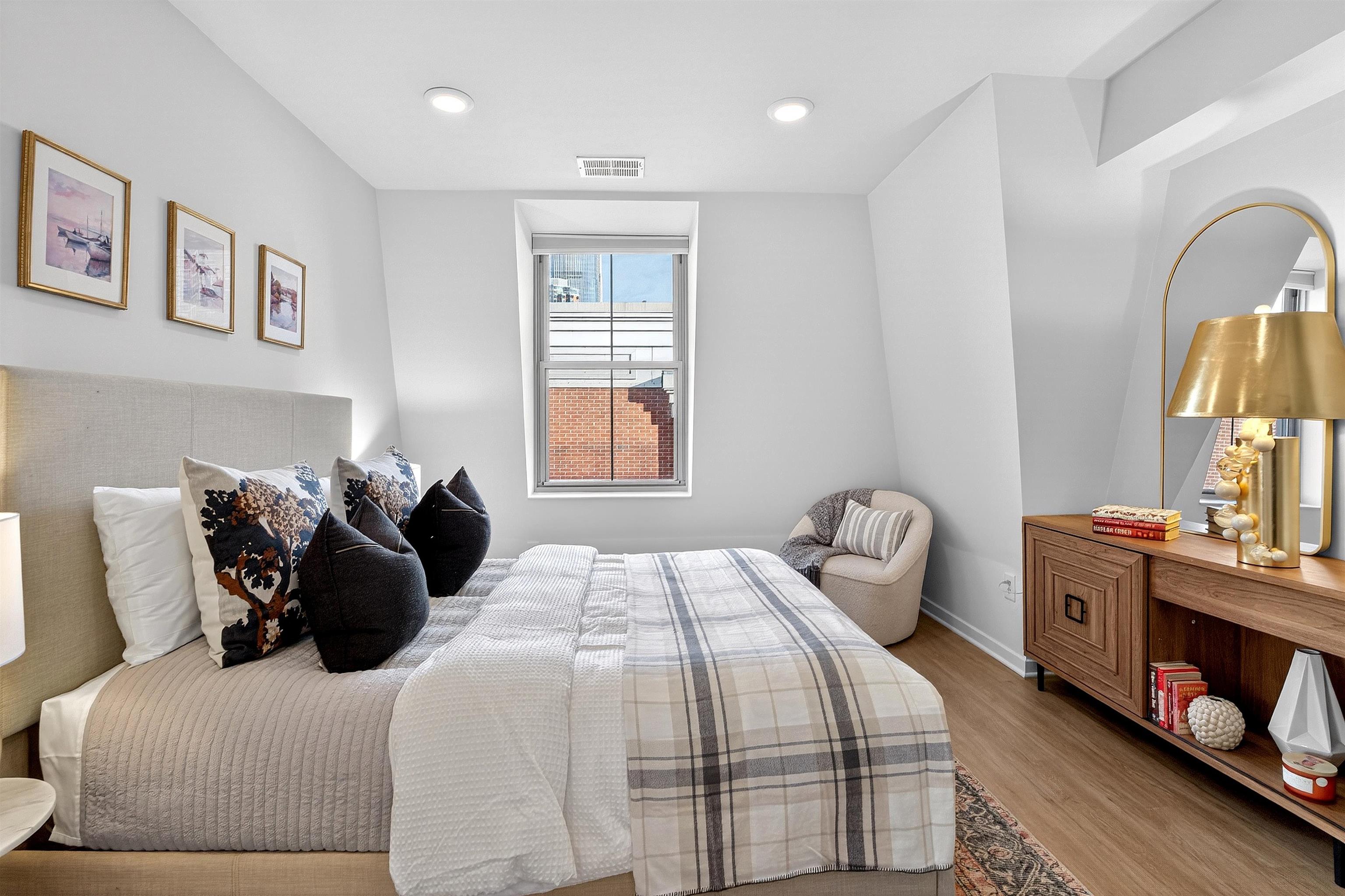 This recently renovated Paulus Hook penthouse duplex offers 1,453 square feet of luxurious space and is one of only a handful of true three-bedroom homes in the building. The 3 bed plus office/den, 3 bath residence is filled with light and volume, featuring soaring 18-foot vaulted ceilings and open skyline & partial city views. The main living level is situated on the corner of the building and offers a generous open-concept layout with a wall of windows. The impeccably designed kitchen features marble-like grey quartz countertops, new custom cabinets with aged brass hardware, stainless steel appliances, reclaimed wood shelving and ample storage plus a huge four-seater peninsula. This opens up to the spacious living and dining area. This level also includes two generously sized bedrooms (one ensuite), two full bathrooms (which have both been beautifully updated in similar style to the kitchen), and abundant closet space throughout, including a walk-in closet. Upstairs, the primary suite functions as a true private retreat with a large bedroom that easily accommodates a king-sized bed, another updated ensuite bathroom, a walk-in closet, and a separate den ideal for a home office or additional flex space. Additional features of the home include central air and heat, an in-unit washer and dryer, custom closet organizational systems throughout, and one-car garage parking. Fulton’s Landing is a 24-hour, full-service doorman building offering a beautifully landscaped common courtyard, reception lounge, and fitness center. Located in Paulus Hook, the neighborhood provides easy access to multiple transportation options including the Exchange Place and Grove Street PATH stations, Light Rail, ferry service, and Citibike. The area also features excellent public and private school options including PS 16, the River School, Waterfront Montessori, and St. Peters Prep.