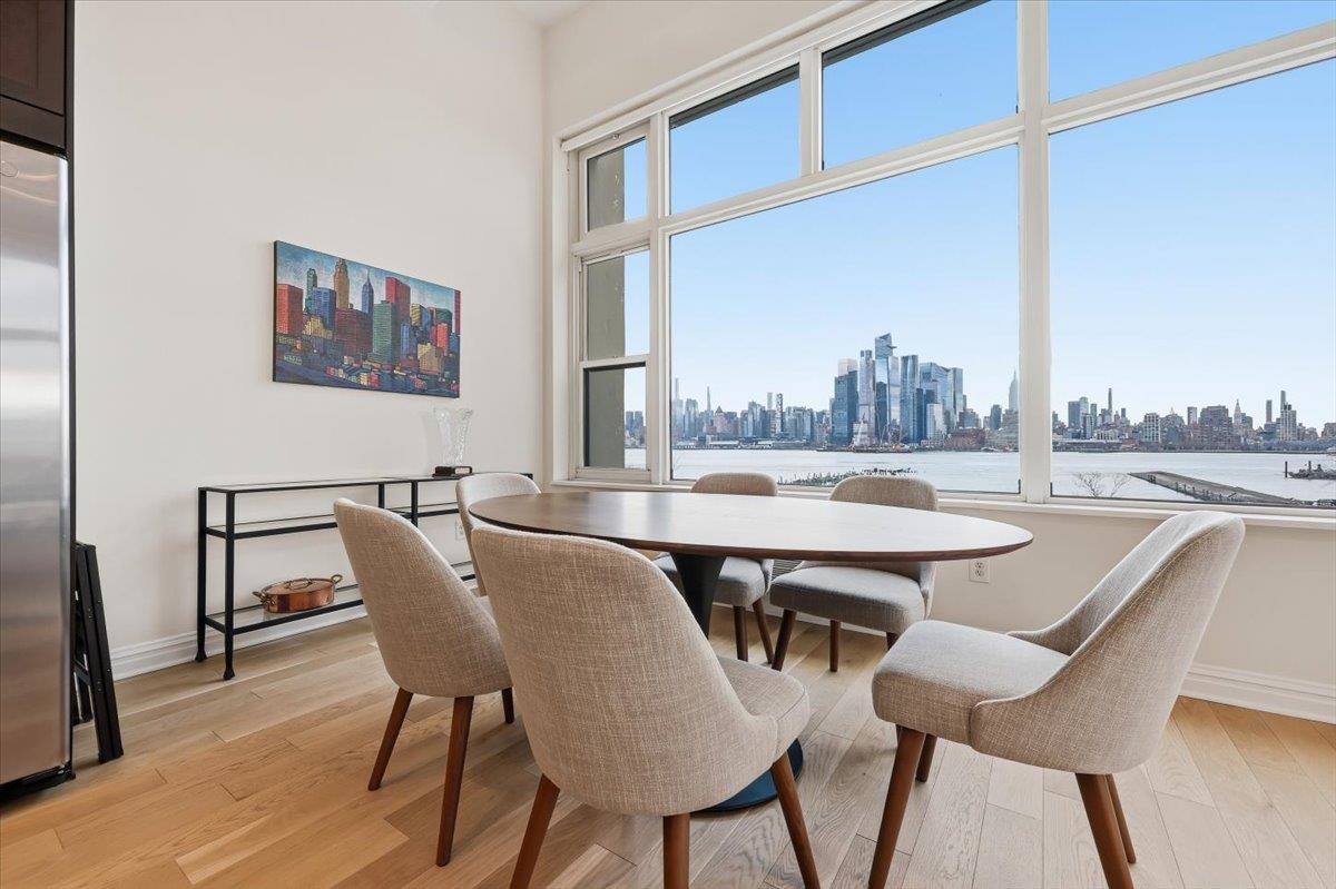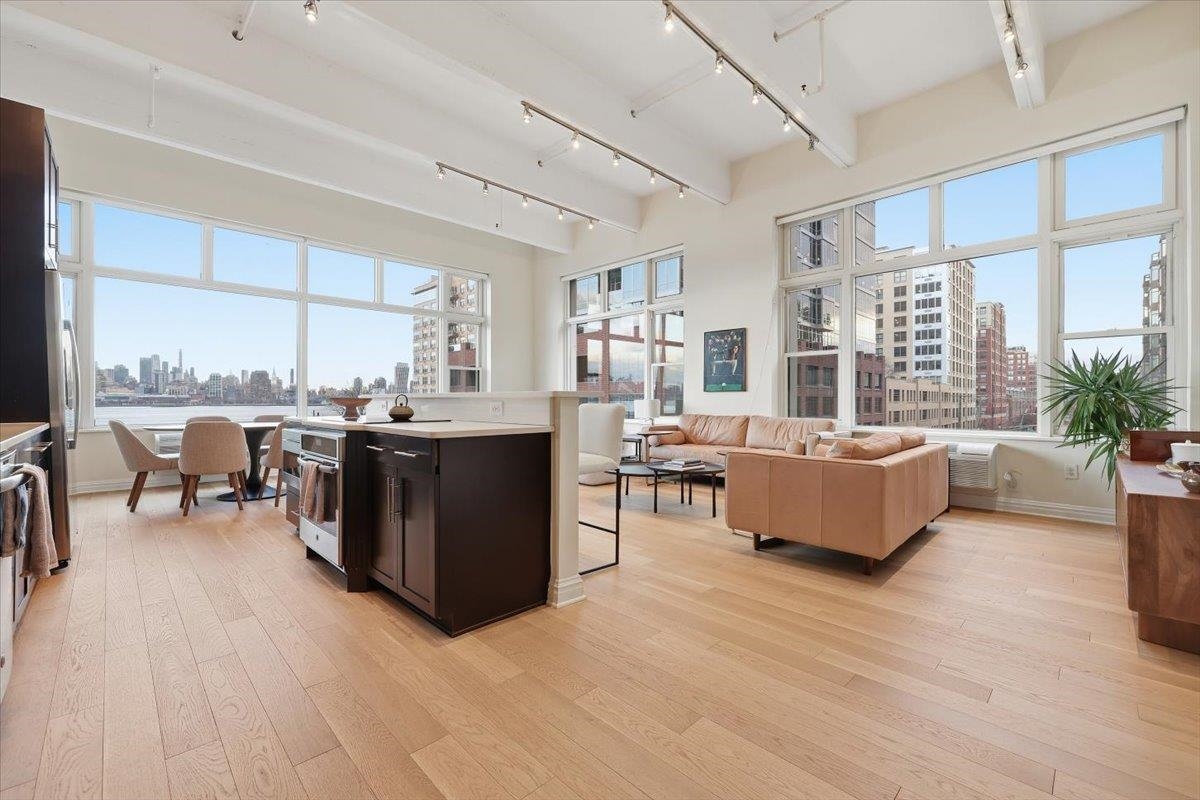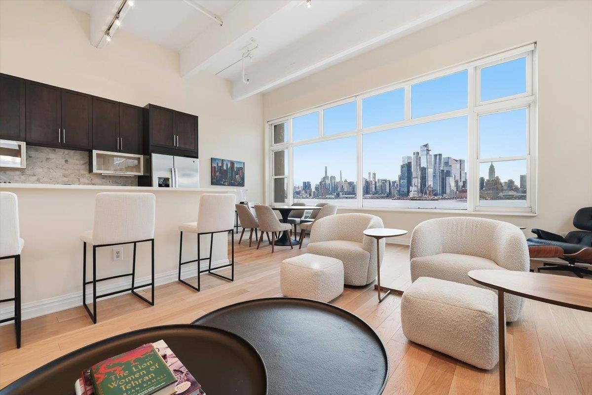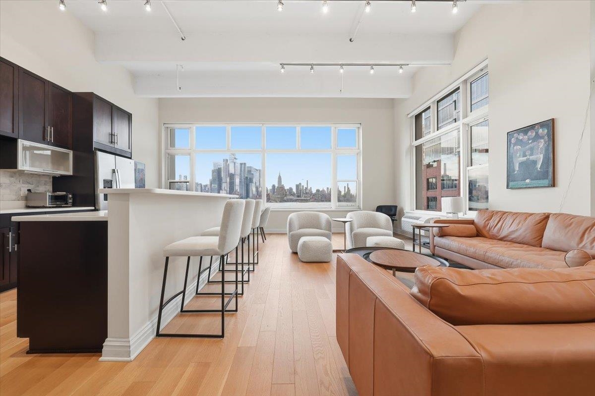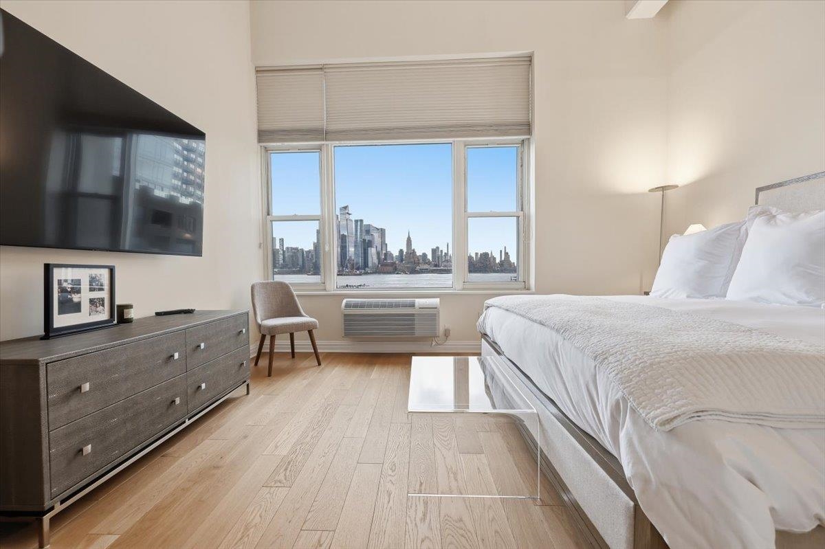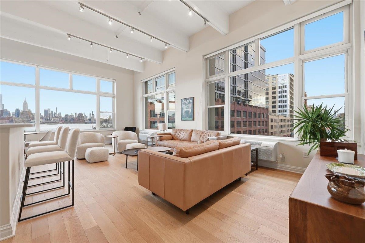Residence 3J, is a generously sized, sun-drenched direct East-facing 2 bed, 2 full bath corner unit home, with over 1500 sq ft of luxury living space at the iconic Hudson Tea Building on the banks of the Hudson River. With breathtaking NYC & tranquil river views from every room from your 10 foot picture windows outfitted with custom blinds you’ll instantly find rest and relaxation from the hustle and bustle of city living! Upon entry, you’ll immediately appreciate the proper entryway foyer making it feel more like a home than a condo, with multiple closet options for storage. Generously sized bedrooms are located on opposite ends of the home offering optimal privacy each with an en suite spa like bath and California Closet organizers. The pièce de ré·sis·tance is the chef’s kitchen with quartz countertops, center island, stainless steel appliances, pantry storage, and massive open floor plan, ideal for entertaining all of your guests and dining in style. Rounding out this generously sized loft are soaring 14′ ceilings, full-sized, front loading GE laundry in-unit, custom lighting fixtures, & stunning brand new 5″ wide plank white oak hardwood floors throughout. The luxe amenities of Hudson Tea, offering a full suite of services including a 24-hour concierge, nearly 3000 sqft gym with Pelotons and included fitness classes, stunning resident’s lounge with private dining room offering Midtown views, a new free WFH space, redesigned kid’s playroom, 3 high-speed elevators, free shuttle to/from PATH, dry cleaner, Choc O Pain French cafe onsite, and resident’s courtyard with fire pit perfect for alfresco dining. Additional amenities include bike & add’l on site resident’s storage. Located directly on the Uptown Hudson River waterfront, enjoy proximity to neighboring Harborside & Maxwell Parks, boutique shopping, outdoor eateries, Soul Cycle, Pilates, spas, wine shop, and easy access to transportation including the Direct 14th St Ferry to Midtown & WFC. With Trader Joe’s, Whole Foods, farmer’s market, and Urban Market groceries now open, every convenience is at your doorstep. All 3 TVs in unit offered at a massive discount to the new tenant. Parking options are available at Little Man or Laz across the street. 2/1 move in. Come and make the iconic Hudson Tea your new home in Hoboken!
