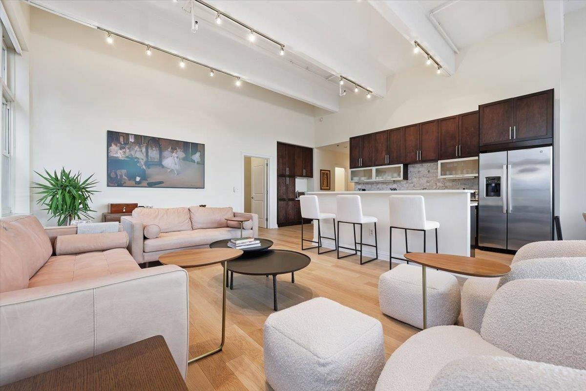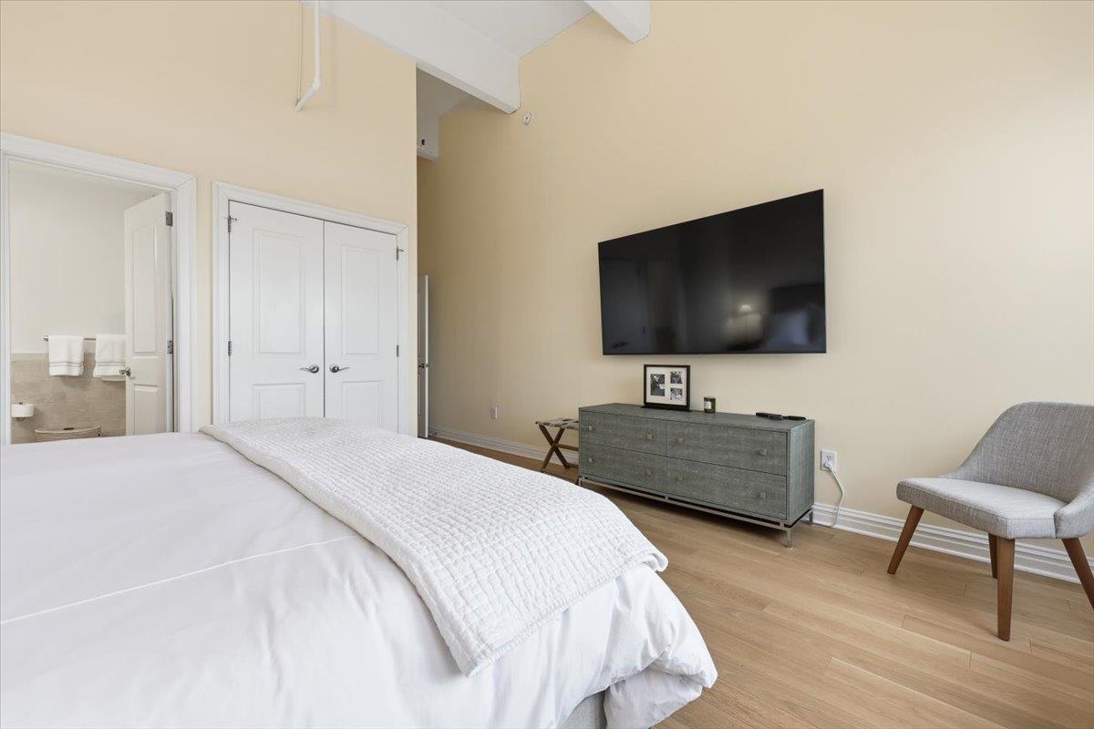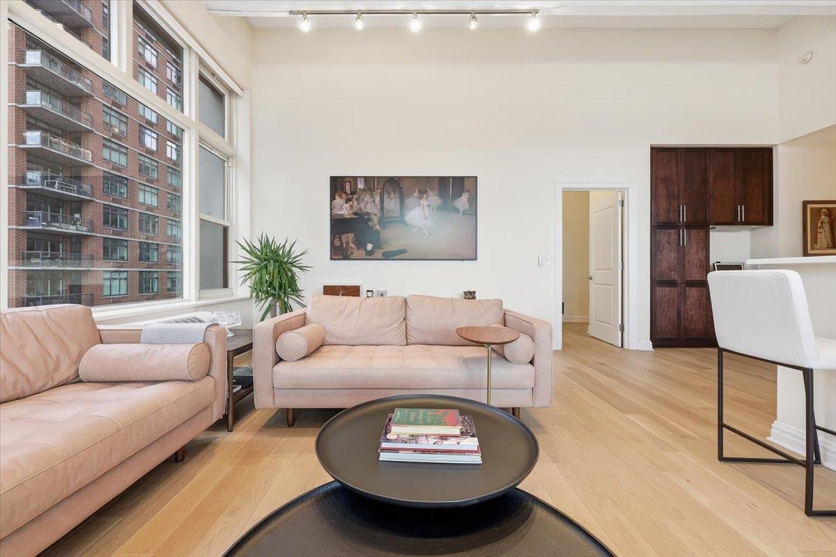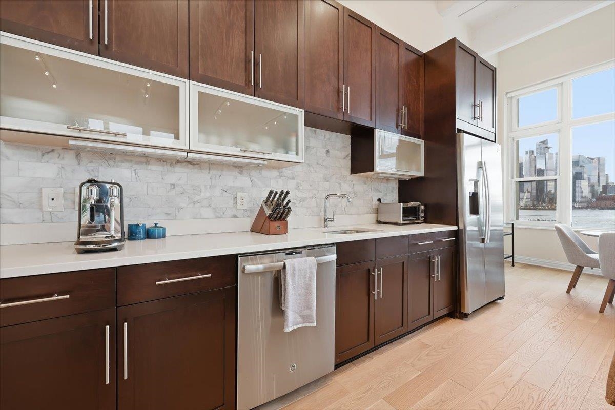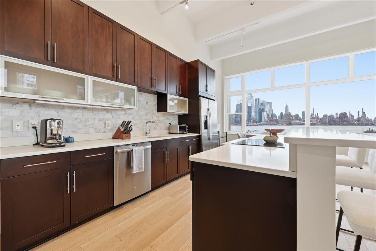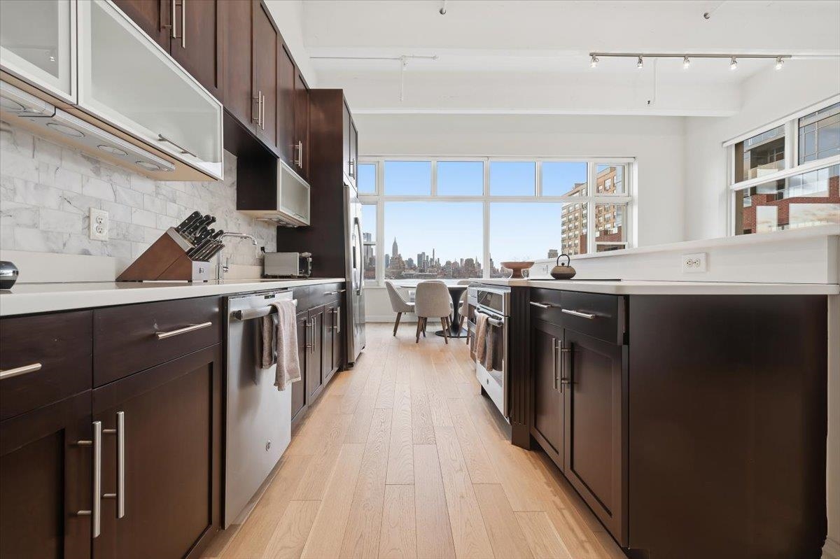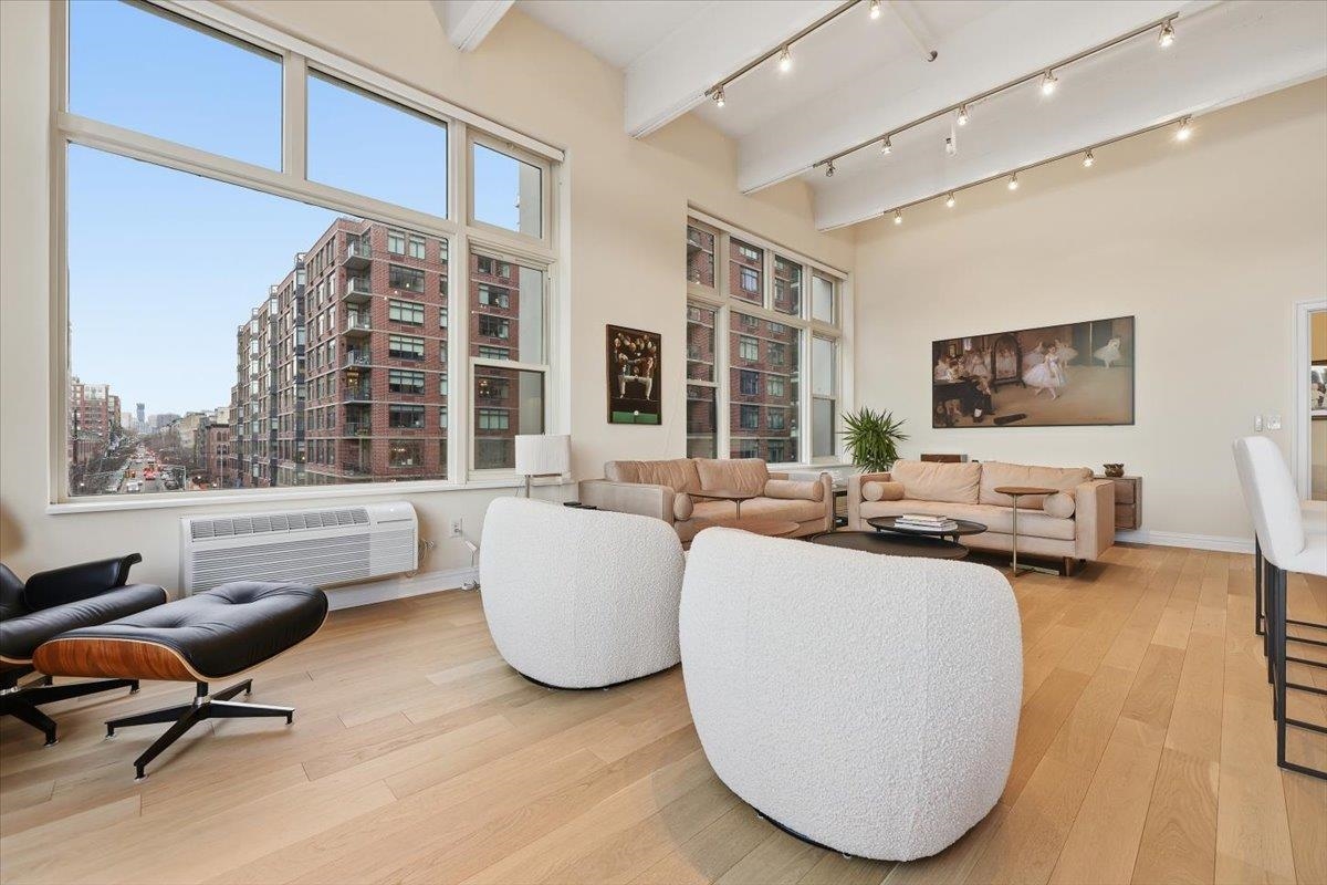 Residence 3J, is a generously sized, sun-drenched direct East-facing 2 bed, 2 full bath corner unit home, with over 1500 sq ft of luxury living space at the iconic Hudson Tea Building on the banks of the Hudson River. With breathtaking NYC & tranquil river views from every room from your 10 foot picture windows outfitted with custom blinds you’ll instantly find rest and relaxation from the hustle and bustle of city living! Upon entry, you’ll immediately appreciate the proper entryway foyer making it feel more like a home than a condo, with multiple closet options for storage. Generously sized bedrooms are located on opposite ends of the home offering optimal privacy each with an en suite spa like bath and California Closet organizers. The pièce de ré·sis·tance is the chef’s kitchen with quartz countertops, center island, stainless steel appliances, pantry storage, and massive open floor plan, ideal for entertaining all of your guests and dining in style. Rounding out this generously sized loft are soaring 14′ ceilings, full-sized, front loading GE laundry in-unit, custom lighting fixtures, & stunning brand new 5″ wide plank white oak hardwood floors throughout. The luxe amenities of Hudson Tea, offering a full suite of services including a 24-hour concierge, nearly 3000 sqft gym with Pelotons and included fitness classes, stunning resident’s lounge with private dining room offering Midtown views, a new free WFH space, redesigned kid’s playroom, 3 high-speed elevators, free shuttle to/from PATH, dry cleaner, Choc O Pain French cafe onsite, and resident’s courtyard with fire pit perfect for alfresco dining. Additional amenities include bike & add’l on site resident’s storage. Located directly on the Uptown Hudson River waterfront, enjoy proximity to neighboring Harborside & Maxwell Parks, boutique shopping, outdoor eateries, Soul Cycle, Pilates, spas, wine shop, and easy access to transportation including the Direct 14th St Ferry to Midtown & WFC. With Trader Joe’s, Whole Foods, farmer’s market, and Urban Market groceries now open, every convenience is at your doorstep. All 3 TVs in unit offered at a massive discount to the new tenant. Parking options are available at Little Man or Laz across the street. 2/1 move in. Come and make the iconic Hudson Tea your new home in Hoboken!
