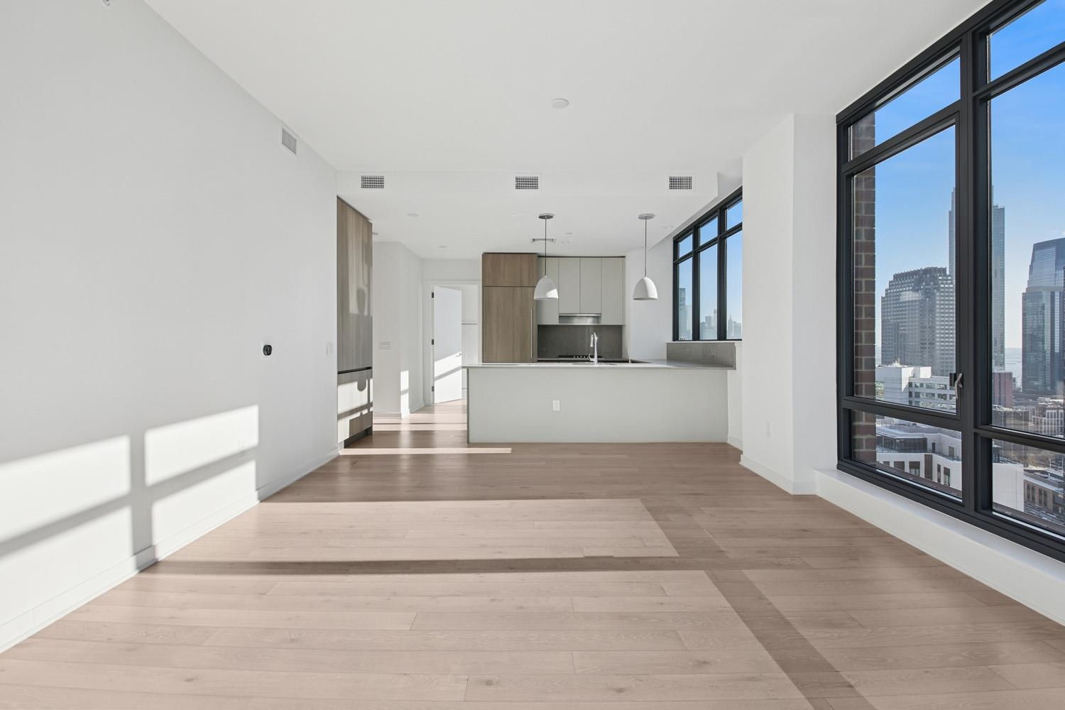 Limited-time seller incentive available: $15,000 toward closing costs or HOA fees for studios and one-bedroom residences; $25,000 toward closing costs or HOA fees for two and three-bedroom residences. Experience elevated urban living in Residence 2907, nestled in Jersey City’s vibrant Powerhouse Arts District. This thoughtfully designed 1199 sq. ft. corner, two-bedroom, two-bathroom home blends modern form with refined function. Floor to ceiling southwest-facing windows flood the space with natural light, enhancing the sleek, minimalist design and white oak flooring. This home offers 10ft. ceilings, large walk-in closet and plenty of kitchen storage and cabinet space with added custom pantry. The open-concept gourmet kitchen seamlessly integrates with the living area, featuring custom Italian walnut and dove gray cabinetry, quartz countertops, and Bosch and Thermador appliances. The kitchen is a true chef’s dream, designed to cater to both casual living and refined entertaining. The primary suite offers an unparalleled retreat, featuring a large walk-in closet and a spa-inspired ensuite with dual custom vanities, Kohler fixtures, and refined porcelain tile accents. The 2nd bathroom features a single custom vanity, Kohler fixtures, and a soaking tub with porcelain tile surround, offering a serene space. Additional highlights include a Whirlpool washer and vented dryer and 1 deeded parking space. Residents enjoy access to world-class amenities, including a sky lounge, rooftop terrace, fitness center, sundeck and pool, residents’ lounge, children’s playroom, dog run and spa, and a 24-hour attended lobby. Located just moments from the Grove Street PATH station, this residence offers unparalleled convenience and sophistication. This building features 259 residences distributed over 34 floors, offering an array of options, including studio, one-bedroom, two-bedroom, two-bedroom with den, and three-bedroom layouts.