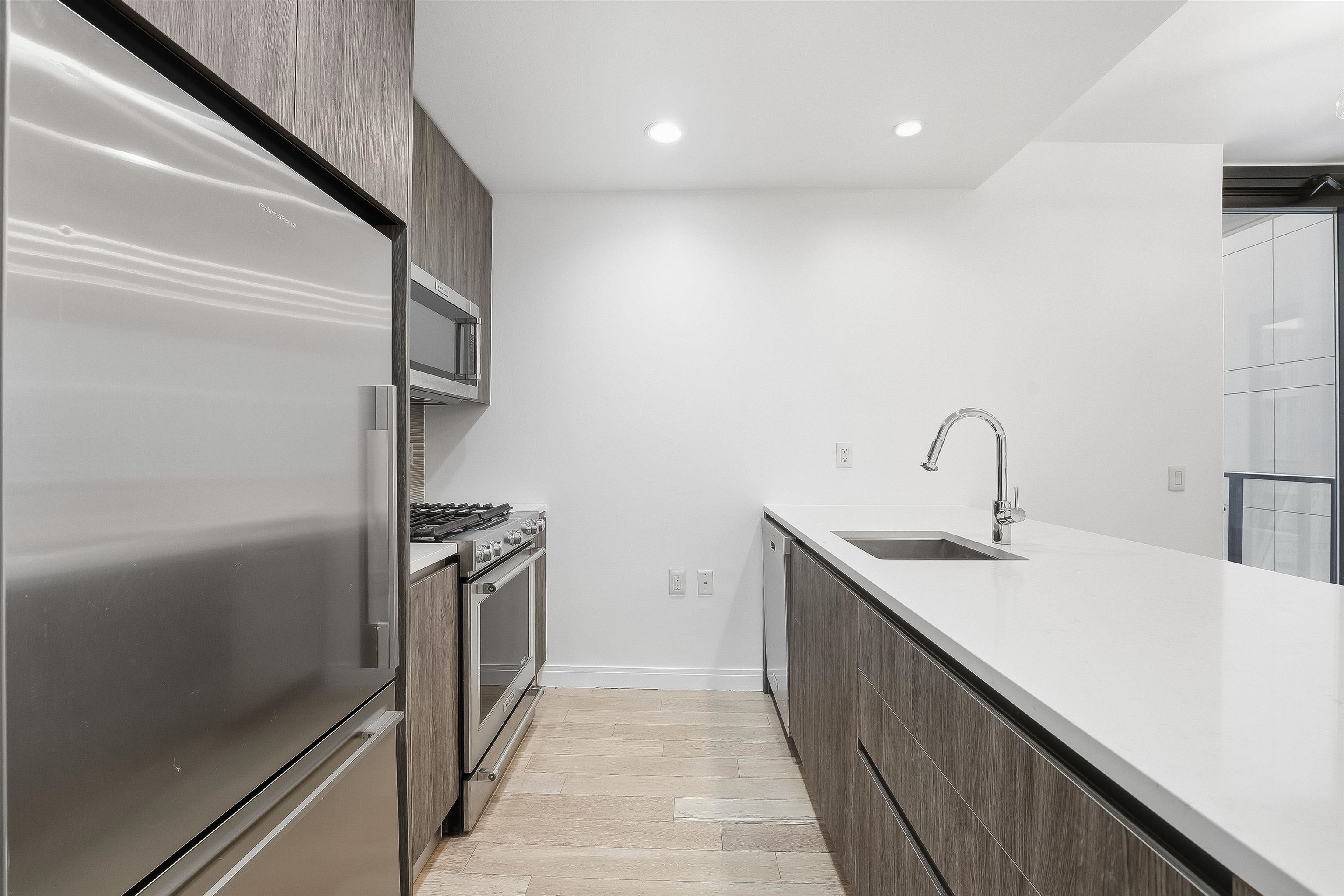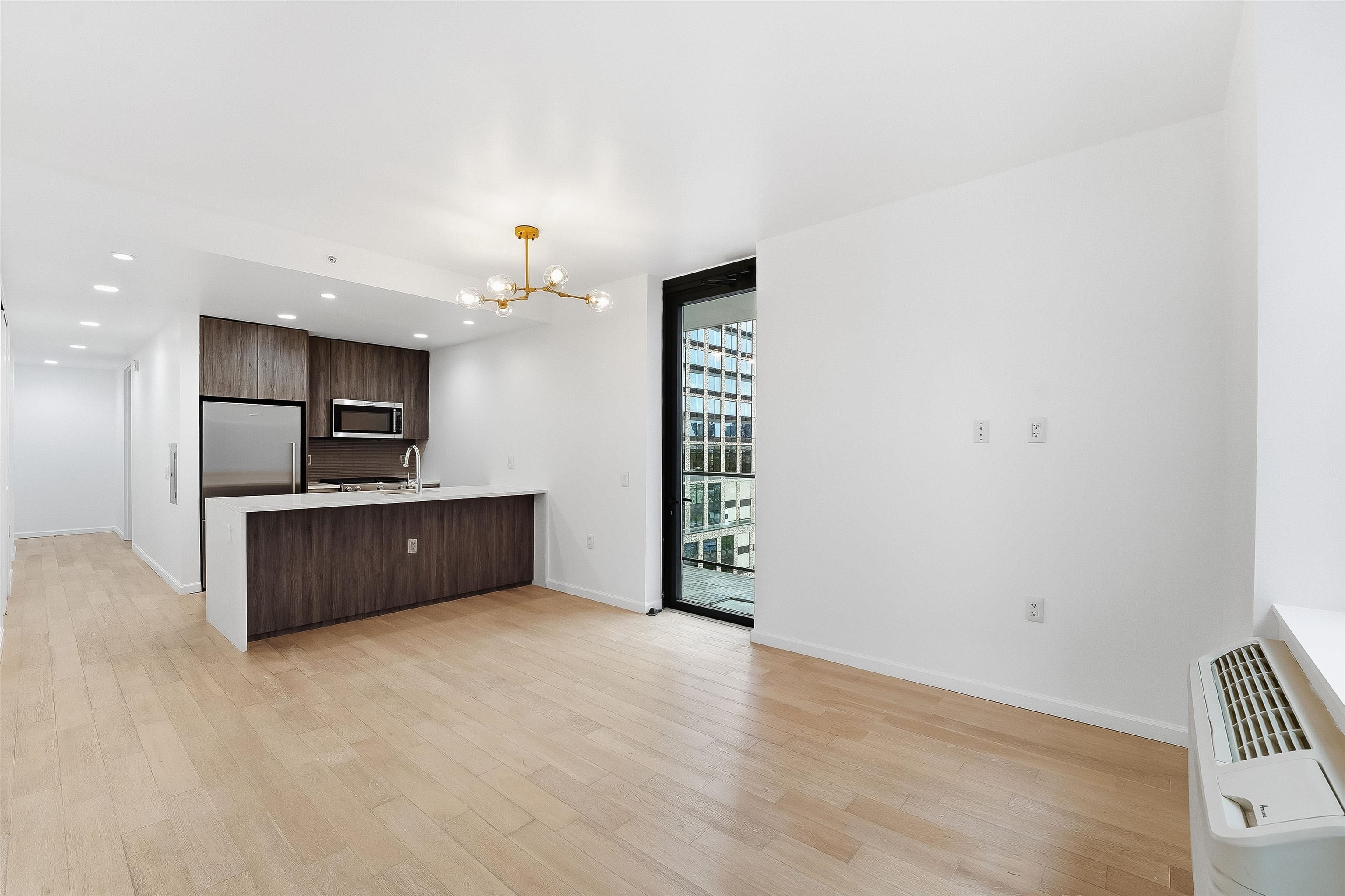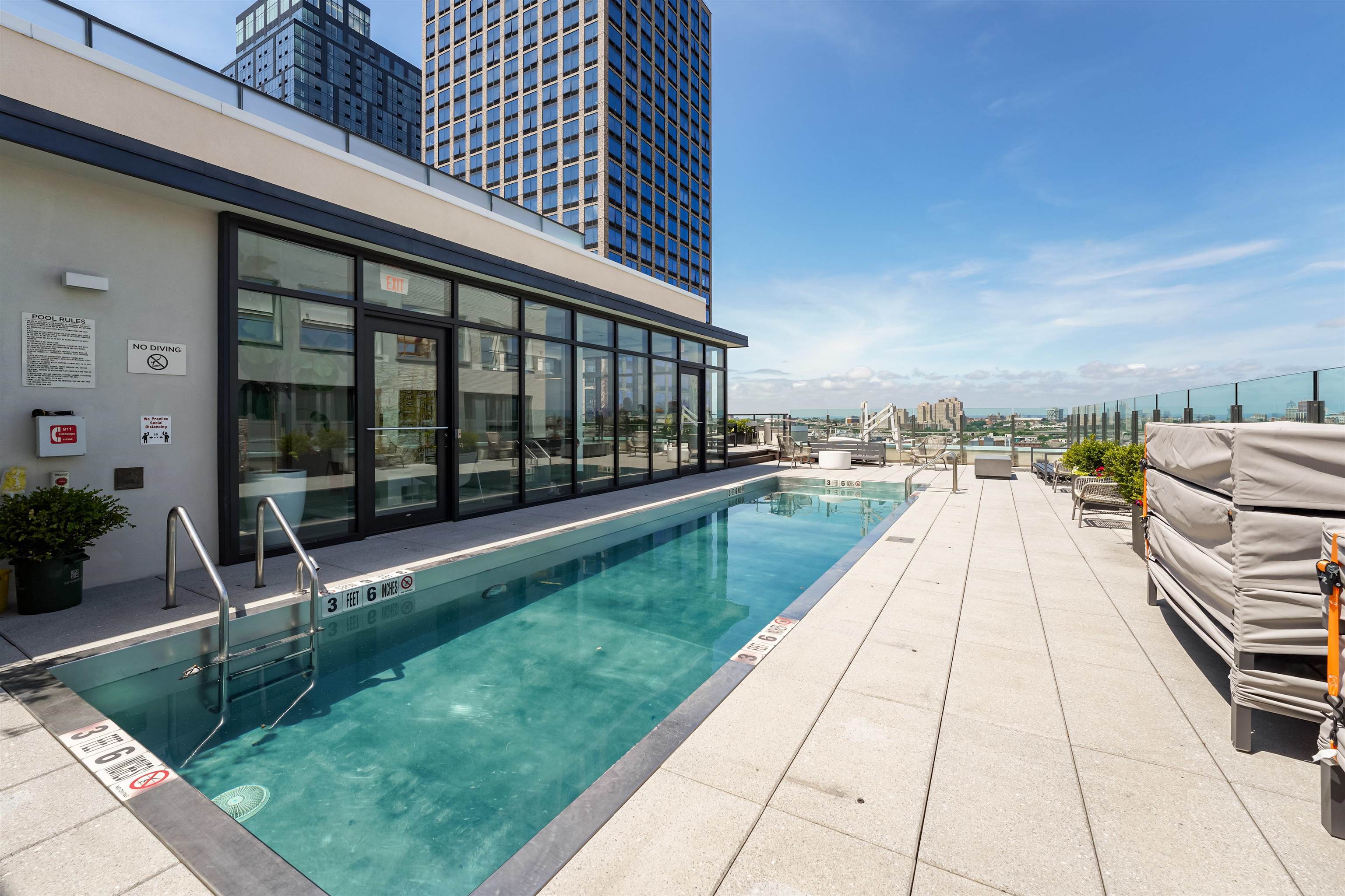 Experience refined urban living in this stunning NW corner home with the largest 1 bedroom layout with private terrace in The Oakman, one of Downtown Jersey City’s most sought-after full-service condominiums. Fully equipped Chef’s kitchen showcases Italian Pedini cabinetry, stone countertops, and premium appliances by Bosch, Miele, and Bertazzoni, complemented by luxurious Kohler and Hansgrohe fixtures.Thoughtfully designed, this home features 9’ ceilings, and 5” wide brushed white oak floors. Sunlight floods the space through oversized windows, highlighting the seamless blend of comfort and style. Step onto your expansive private terrace to take in scenic city views—perfect for relaxing or entertaining. Residents of The Oakman enjoy an exceptional suite of amenities, including a rooftop pool, BBQ grills, outdoor fireplace, fitness center, children’s playroom, resident lounge, library, pet spa, bike and cold storage, 24-hour concierge, and on-site rental garage parking (additional fee). Ideally located in the heart of Downtown Jersey City, The Oakman is just three blocks from the Grove Street PATH, providing a quick seven-minute commute to NYC, with premier dining, shopping, and entertainment right outside your door. This residence also benefits from one of Jersey City’s most favorable tax abatements through 2036, with exceptionally low carrying costs.