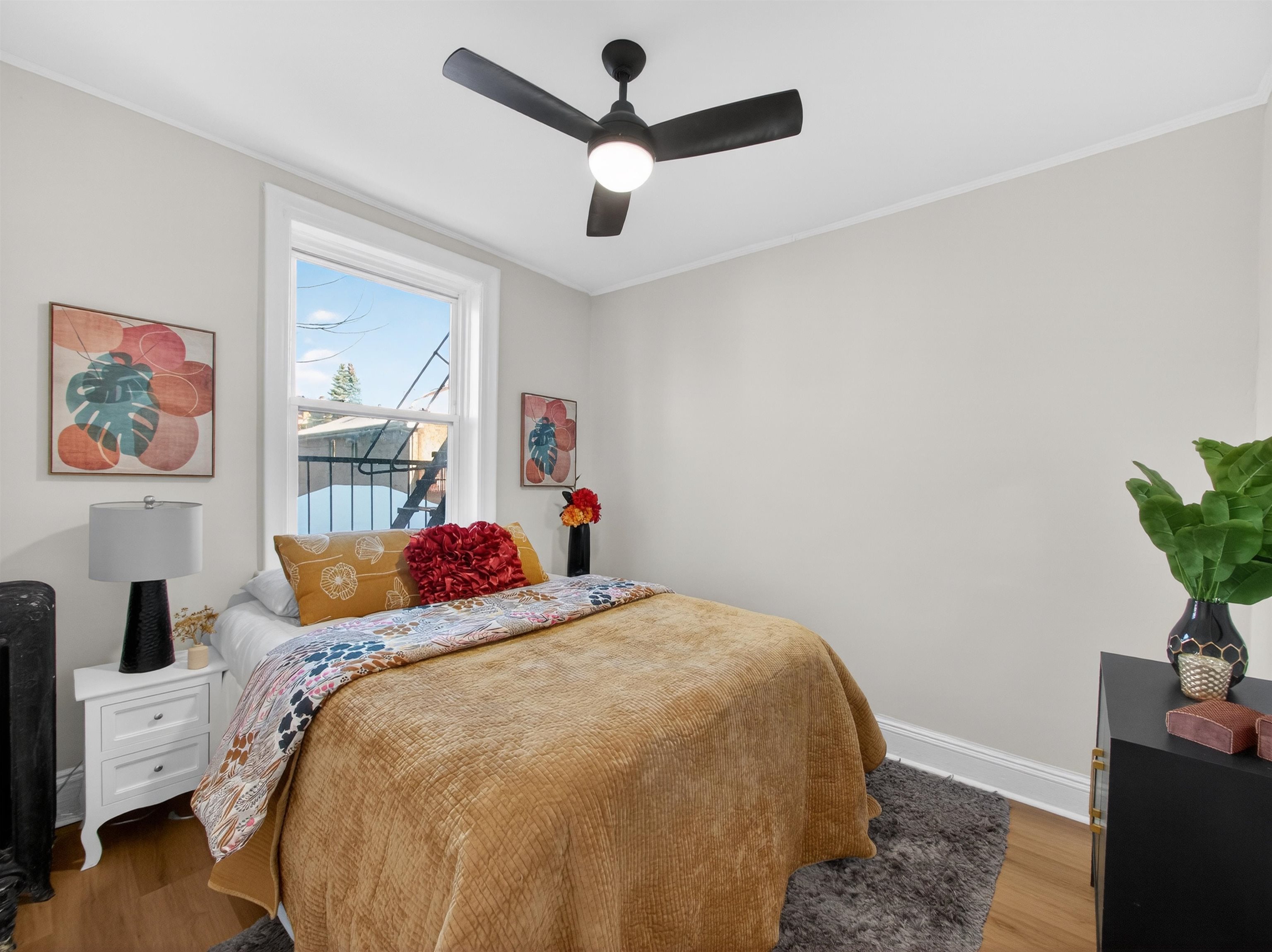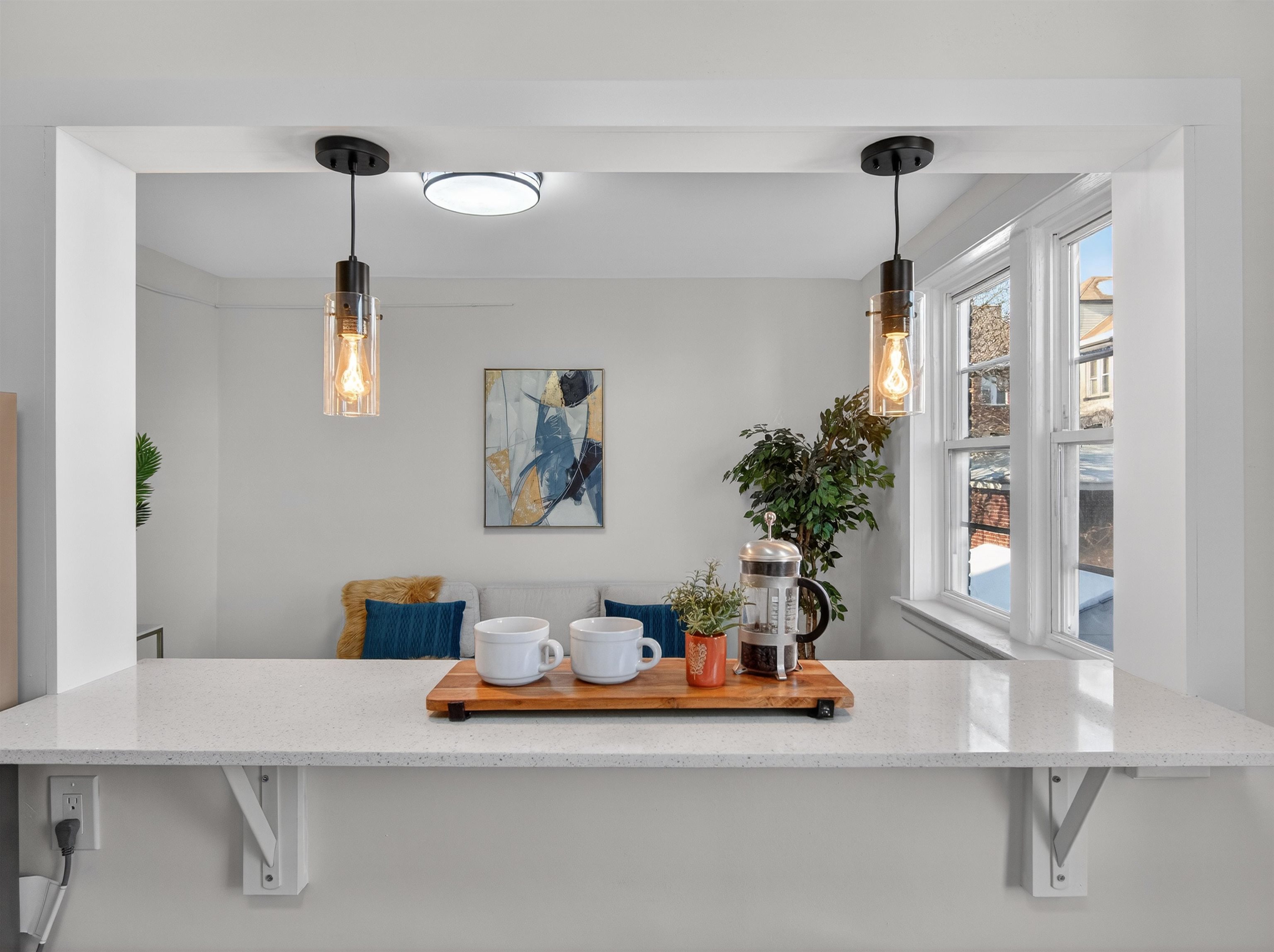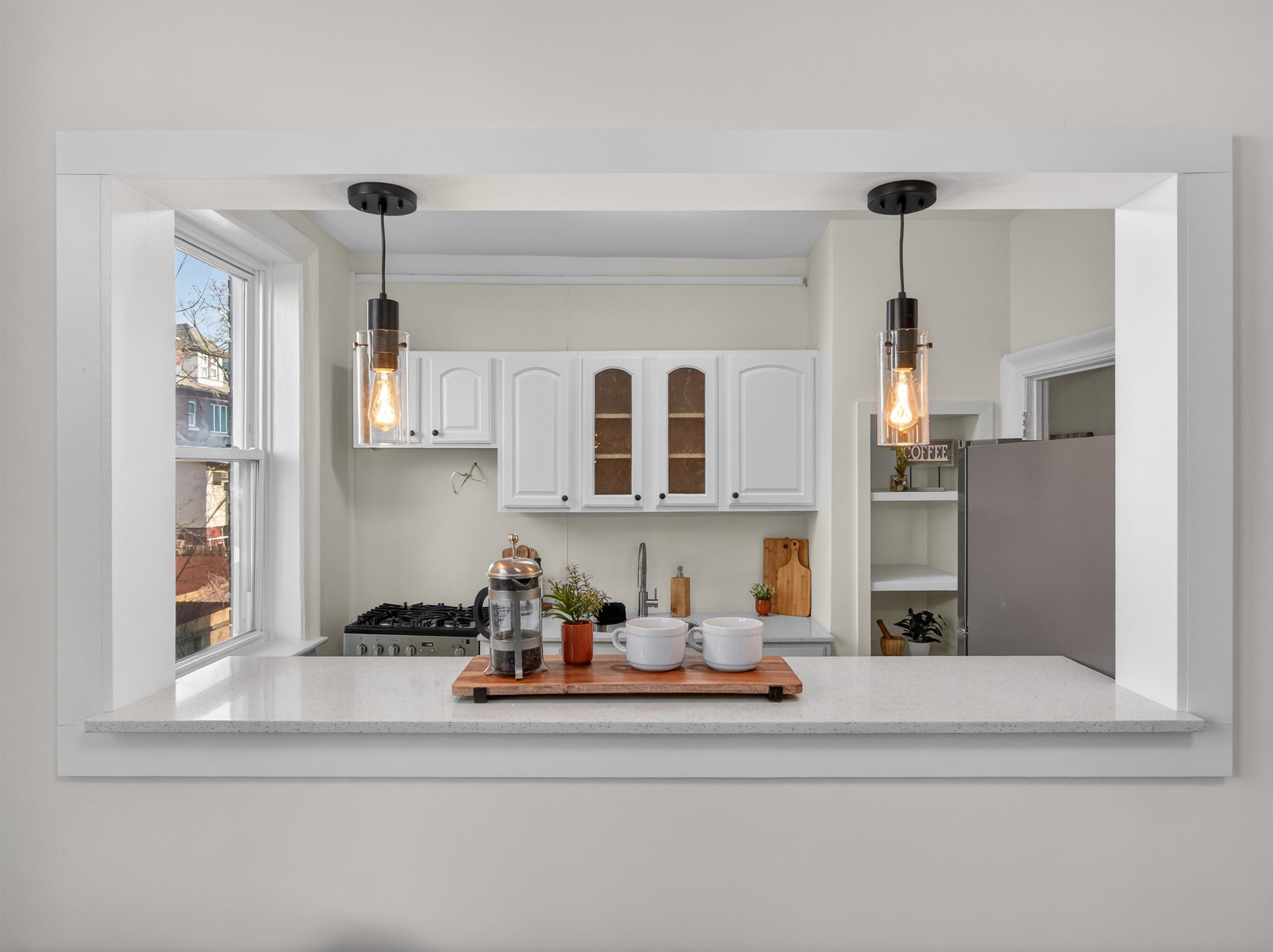 Incredible location, newly renovated unit, fantastic building with low HOAs – what more could you want? Welcome to your new home! This unit has been completely renovated with all new everything! Your bright and spacious living room features high ceilings, new LED light fixture, and a beautifully done pass-through to the kitchen for an open-concept feel. The kitchen has all new stainless steel appliances, new quartz countertops, and the pass-through doubles as a bar-height eating area with pendant lighting. Brand new flooring runs throughout the unit and into your generously-sized bedroom with large windows, new remote-controlled ceiling fan, and closet. The bathroom has also been renovated, featuring a new toilet, vanity, retiled shower, and a new window surround with quartz matching the kitchen countertops. Down the hallway you’ll find two closets for storage and a welcoming entryway with new, bright, LED lighting. The immaculately maintained building boasts a laundry room and storage area in the basement, bike rack in the coutyard, on-site super, and adorable park with playground directly next door. Plus the views of the NYC skyline just outside are absolutely stunning. The Bus stop, mere steps from the front door, is served by NJ Transit routes 23, 84, 89, 128, 165, 166, and 168. All this is just a short walk from the James J. Braddock North Hudson County Park. This condo has it all! Stop paying rent and call today about this phenomenal opportunity!