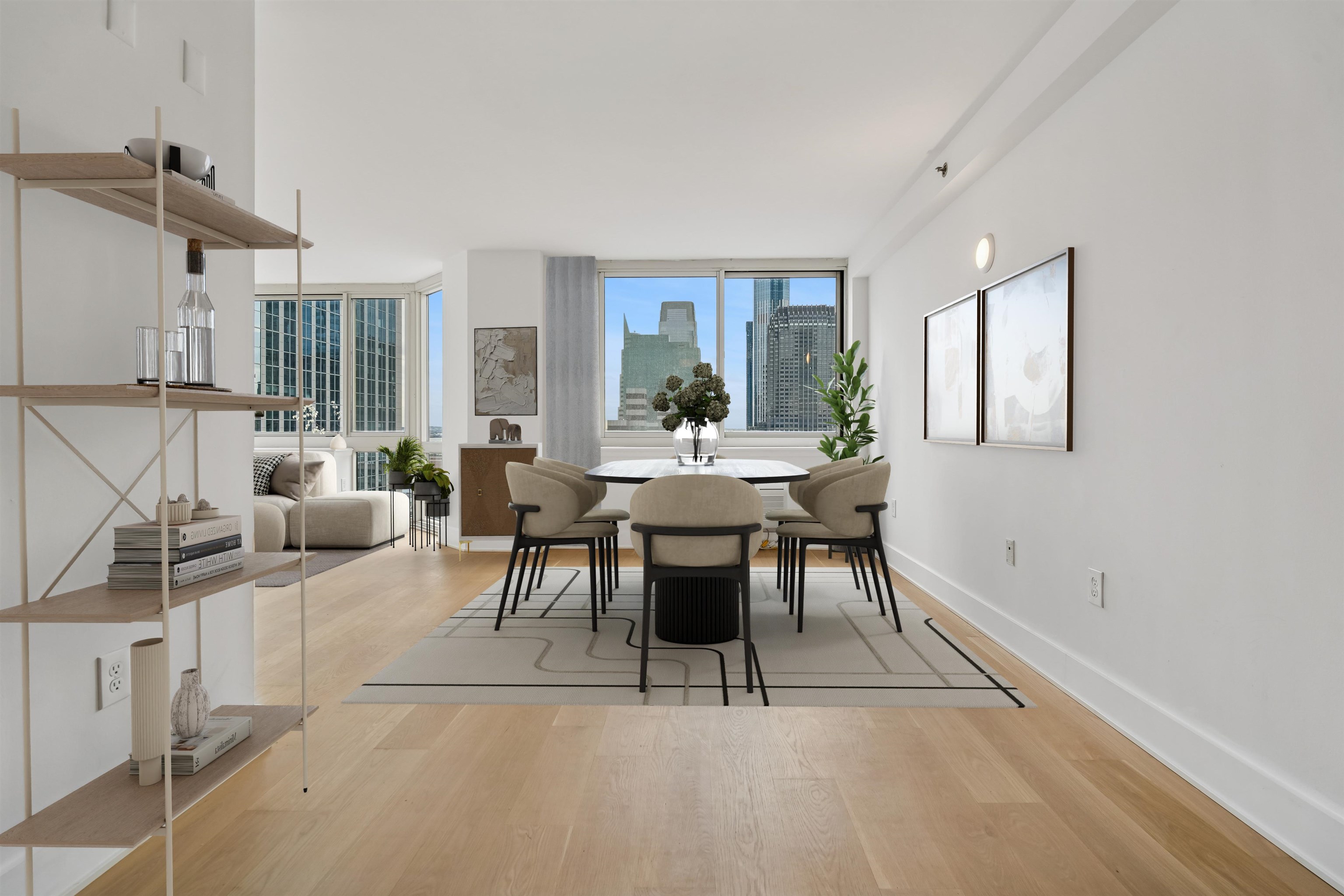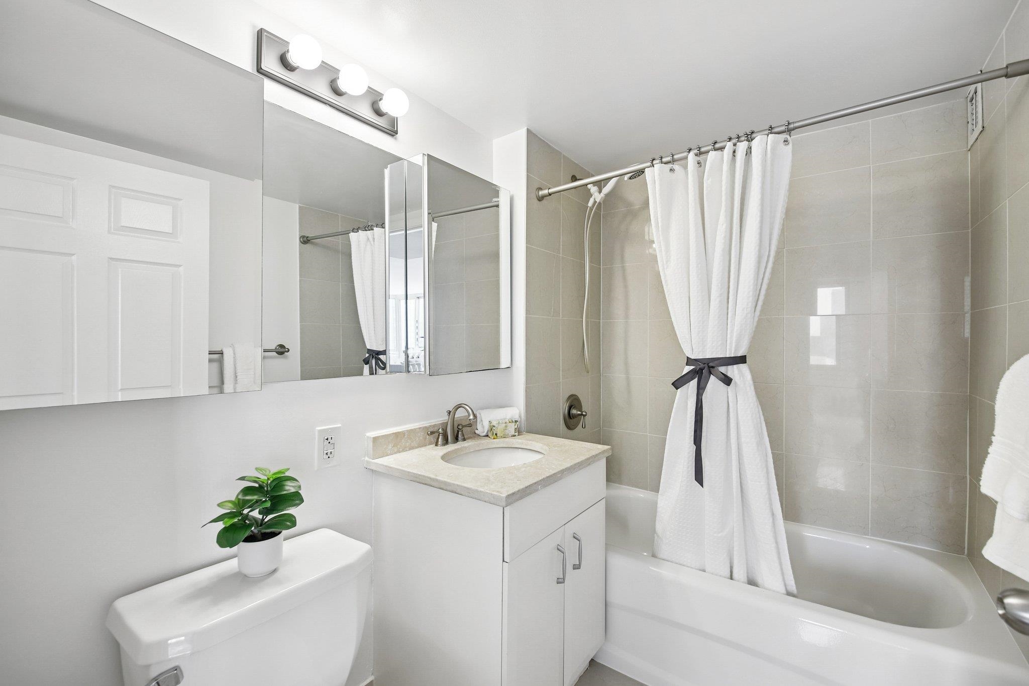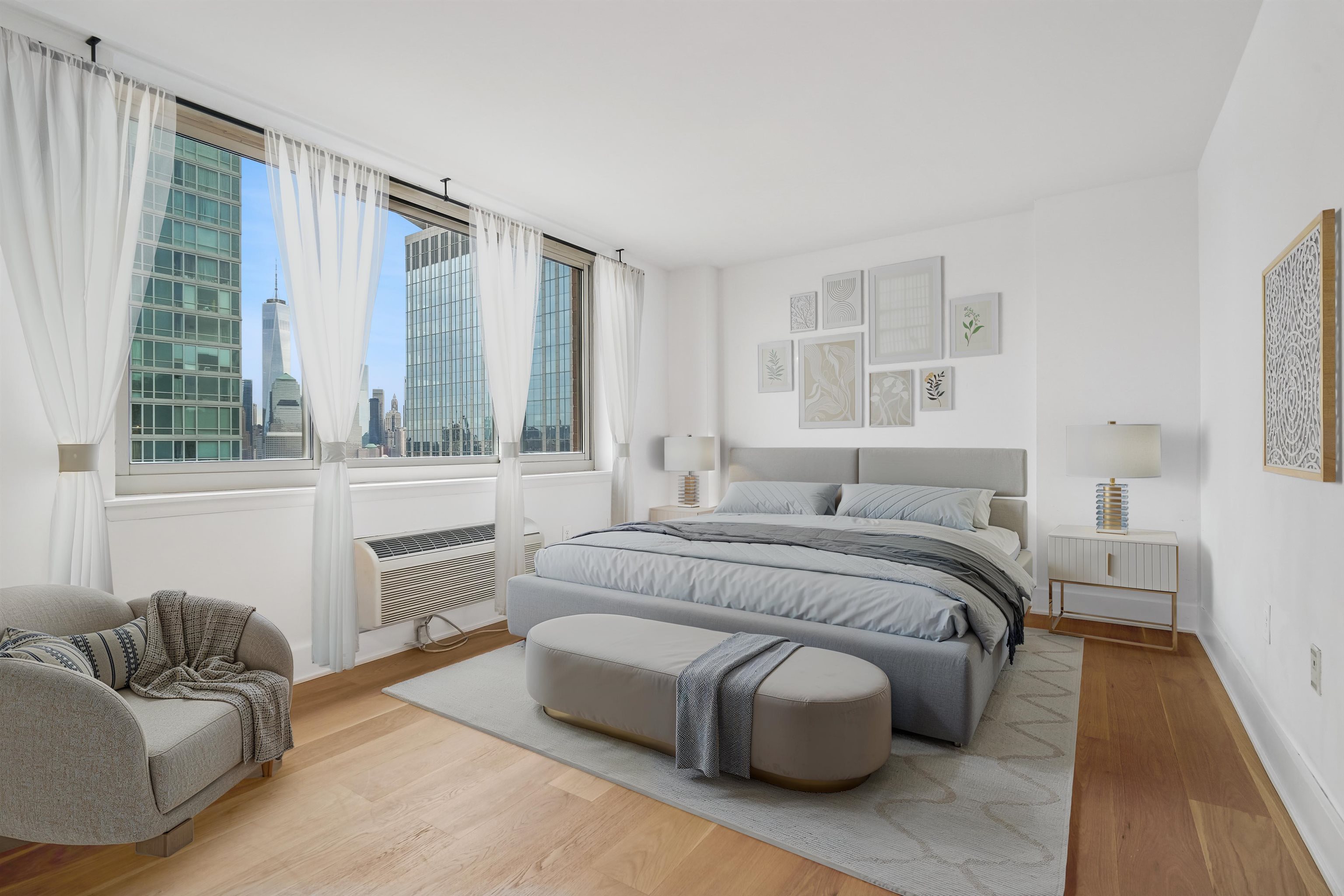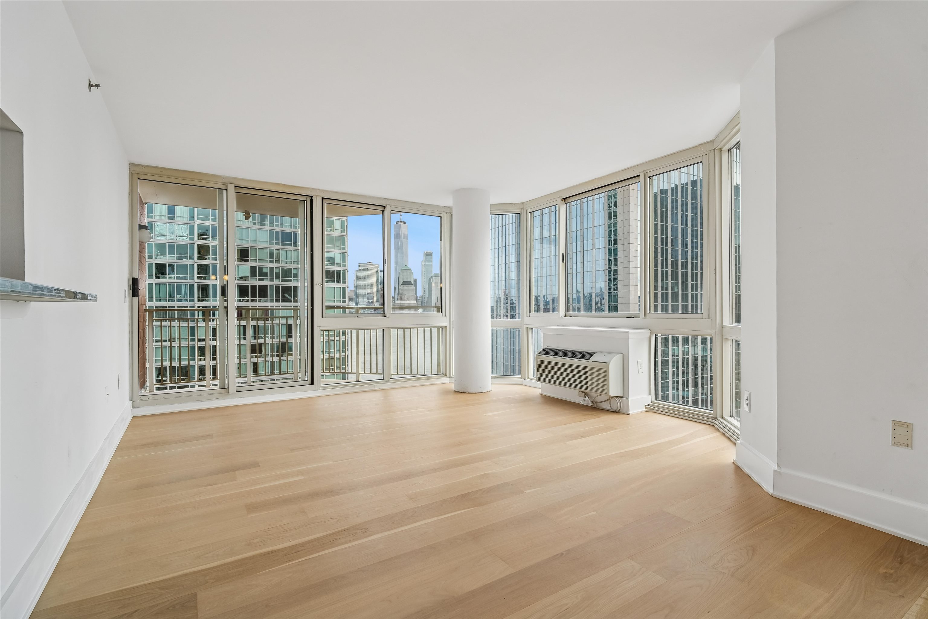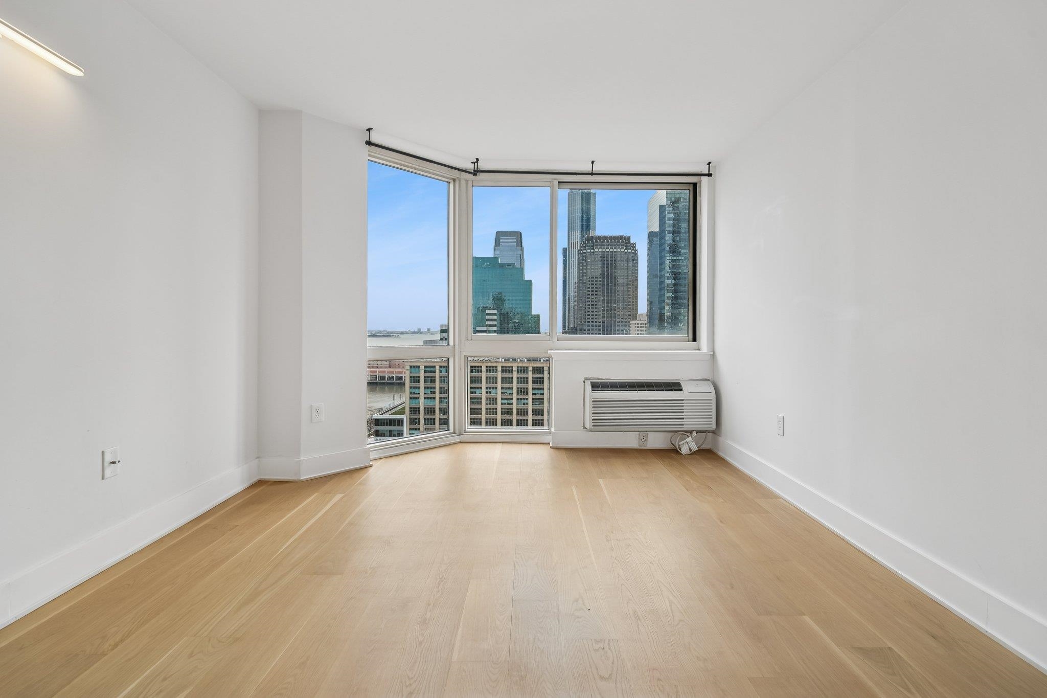 Live at the TOP! High floor, SE corner with unbelievable exposures directly on the Exchange Place Waterfront. This large 3-bedroom, 2 full bath home features a phenomenal floor plan and is engulfed in spectacular natural light. Brand new wide-plank, white oak flooring throughout, offset by square cut 6″ baseboard moldings, gives this residence a refined, luxurious finish. An expansive corner living/dining room, takes full advantage of the direct Freedom Tower and Hudson River views, and opens directly onto your private terrace with more astounding views stretching from lower Manhattan all the way up to the GWB! Wake each day in your primary suite with the Empire State building and Hudson Yards front and center. This king-sized sanctuary also features three custom built-in closets, and spa-like ensuite bathroom. Two additionally large, bright, and view forward bedrooms, along with another beautiful full bath, are smartly placed on the other side of the home for privacy and livability. Your Chef’s kitchen is complete with s/s appliances, abundant walnut cabinetry, stone countertops, and breakfast bar. Private entry foyer, in-home LG wash tower W/D, and an included on-site garage parking space complete the picture. The full service Mandalay features 24/7 doorman, gym, sparkling pool, community room, stunning new lobby (nearing completion), and children’s play area. Located directly on the Waterfront, you’re mere minutes from top dining, shopping, Whole Foods Market, Waterfront promenade, and the Newport/Grove/Exchange Place PATH stations, as well as the NY Waterway ferry. A remarkable Downtown opportunity.