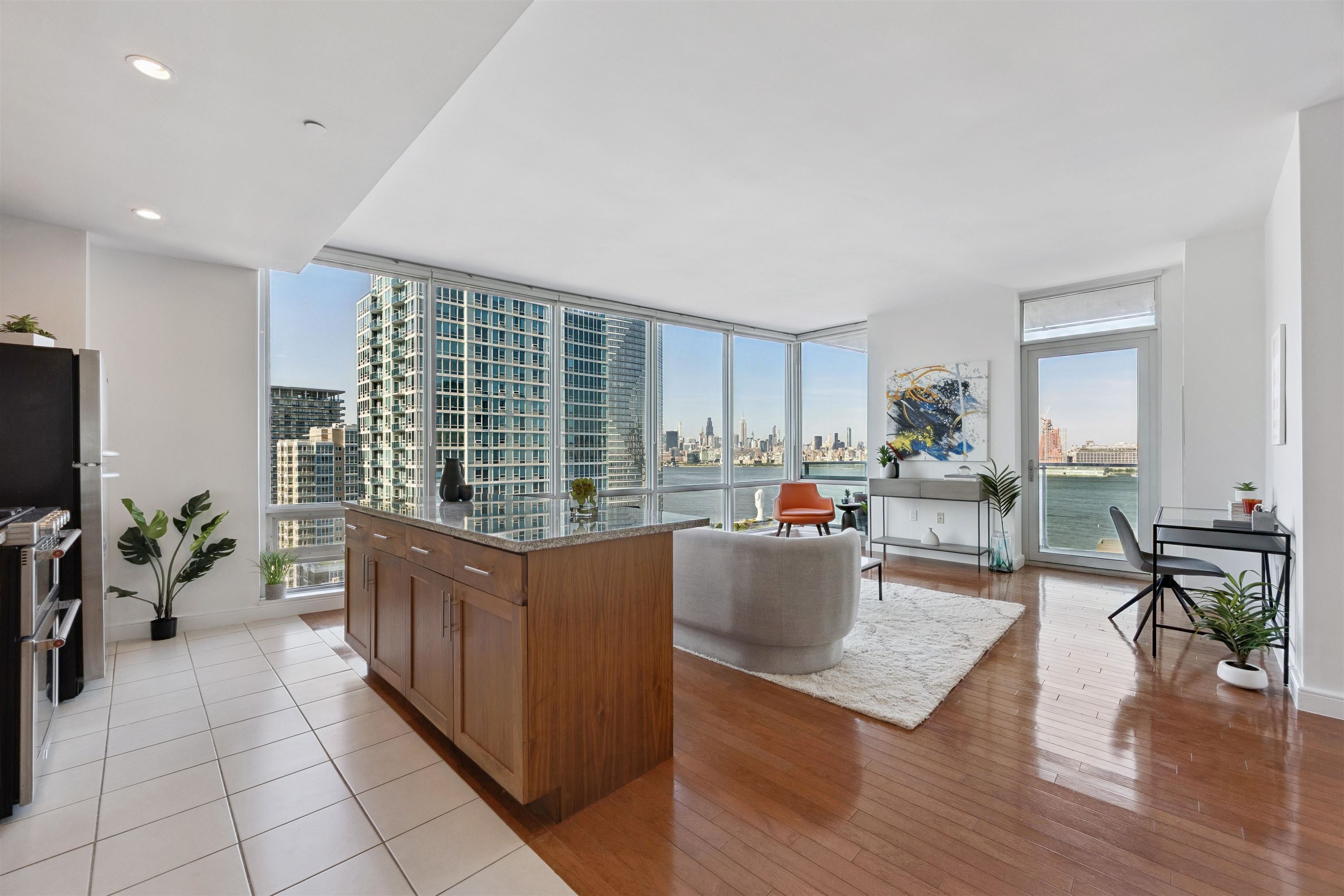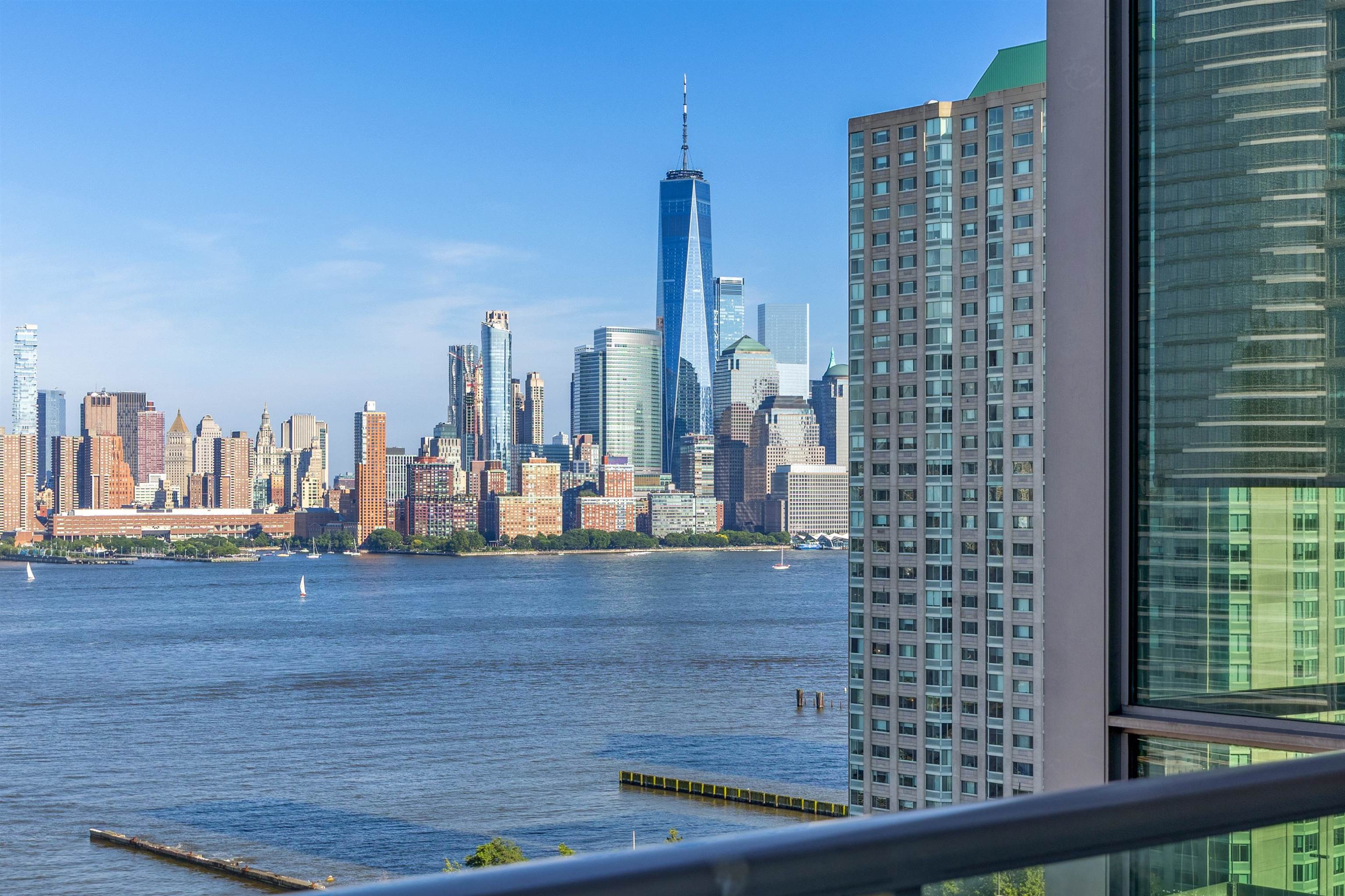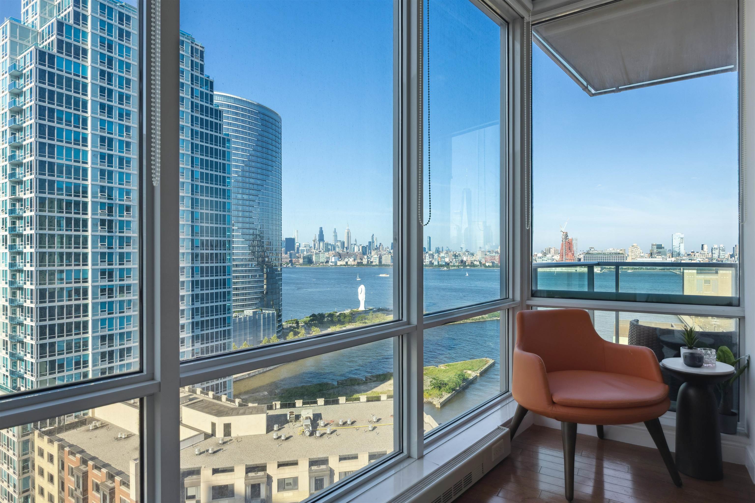 Rare Corner, East Facing, 1 Bed with a Private Balcony at The Shore! Experience breathtaking views of the Empire State Building, World Trade Center and the Hudson River through walls of floor-to-ceiling windows in this sun-drenched, corner-unit home. This unique layout has a nook that’s perfect for a dining area or a work space. The gourmet kitchen has plenty of cabinets for storage, granite countertops, stainless steel appliances and an island with a breakfast bar. The home features a large bathroom with double vanities, Central Heat/AC, hardwood floors throughout, in-unit washer/dryer. Building amenities include: 24/7 concierge, fitness center, jacuzzi, sauna, steam room, resident lounge, conference room, playroom and a roof deck with amazing NYC/River views! Experience the convenience of Newport! Located between the Newport & Hoboken PATH, Ferry, NJ Transit Train, Light Rail and Bus Terminal. Selection of several supermarkets, Target, Duane Reade, Newport Mall, Newport Green Park all minutes away.