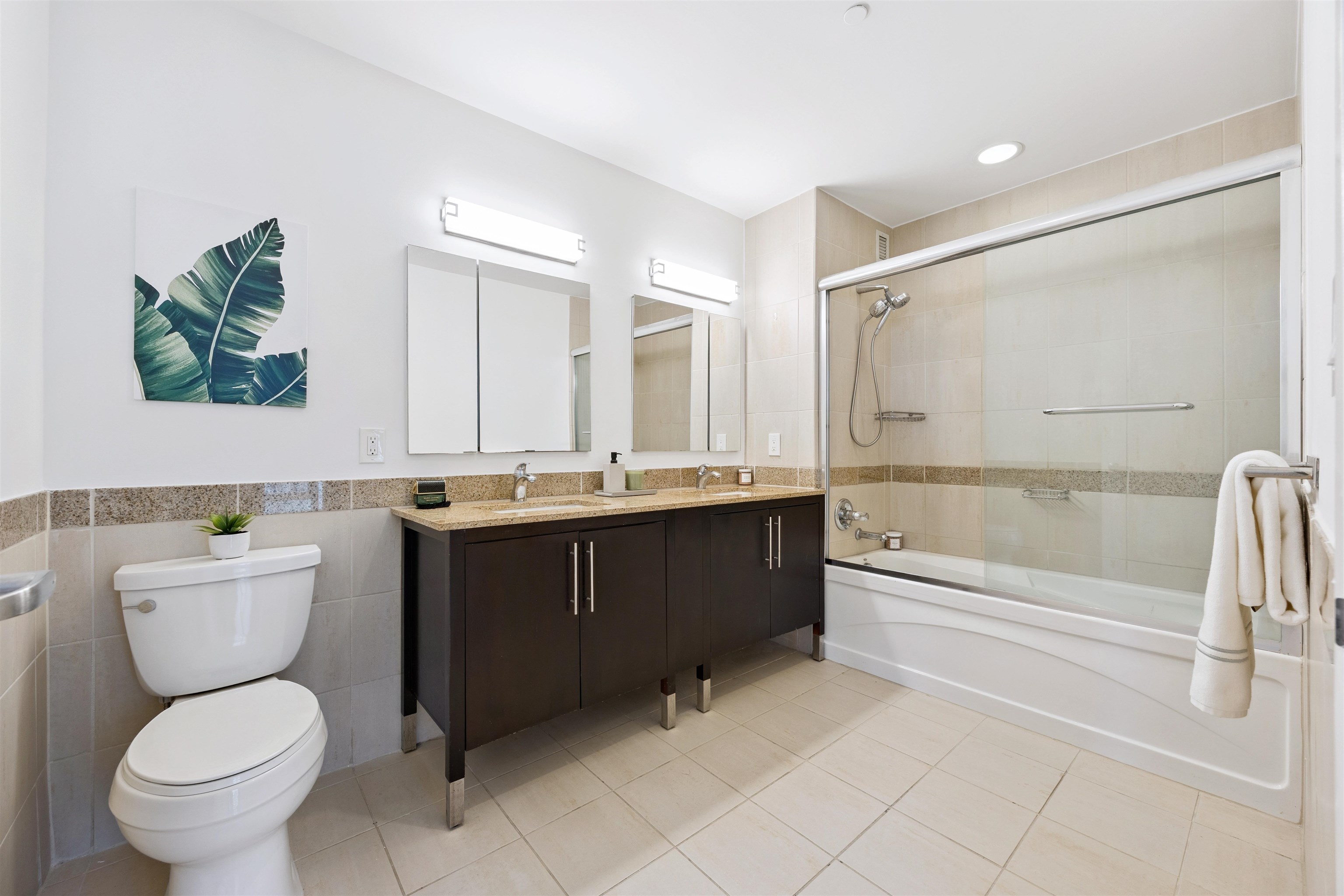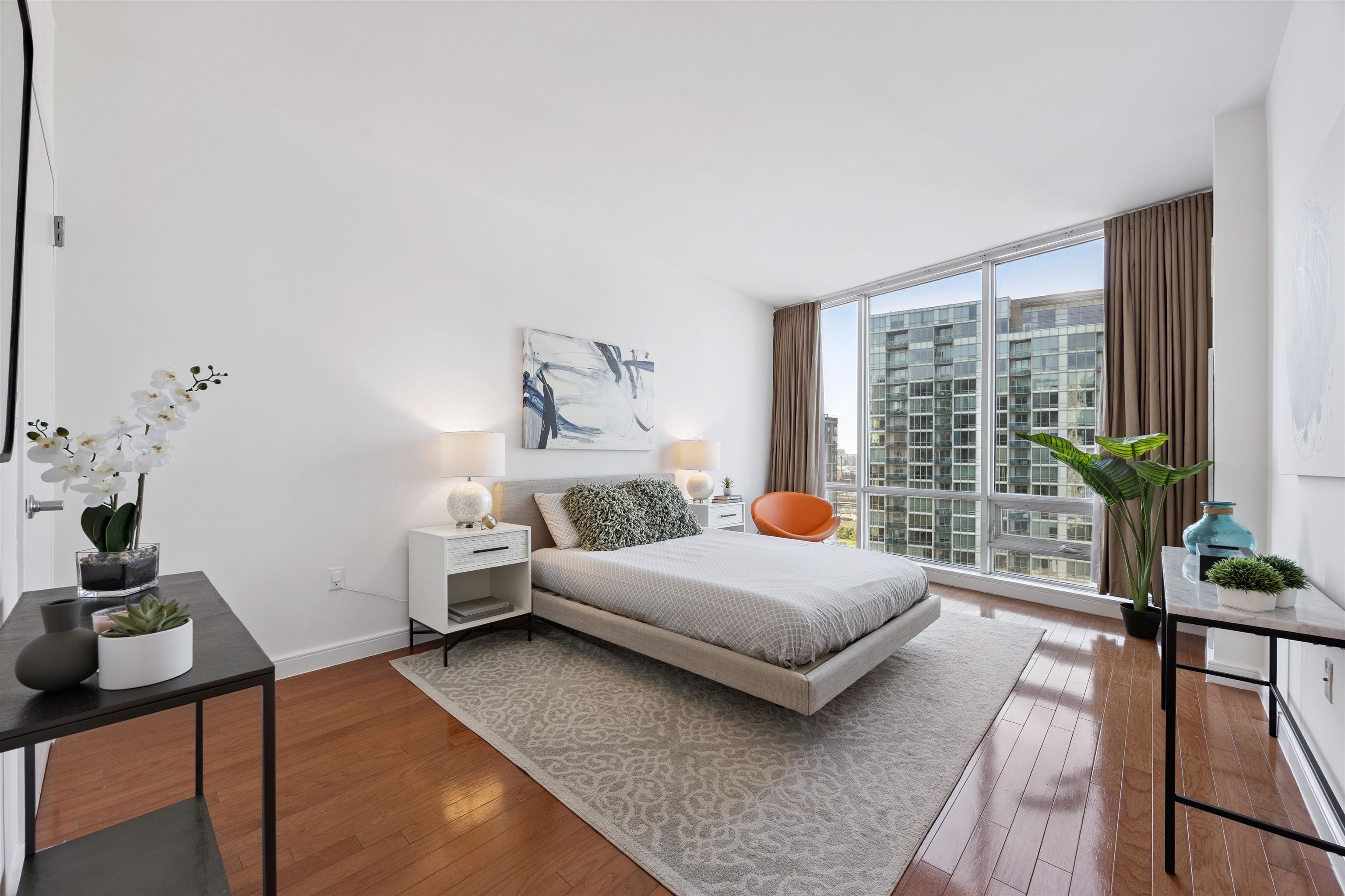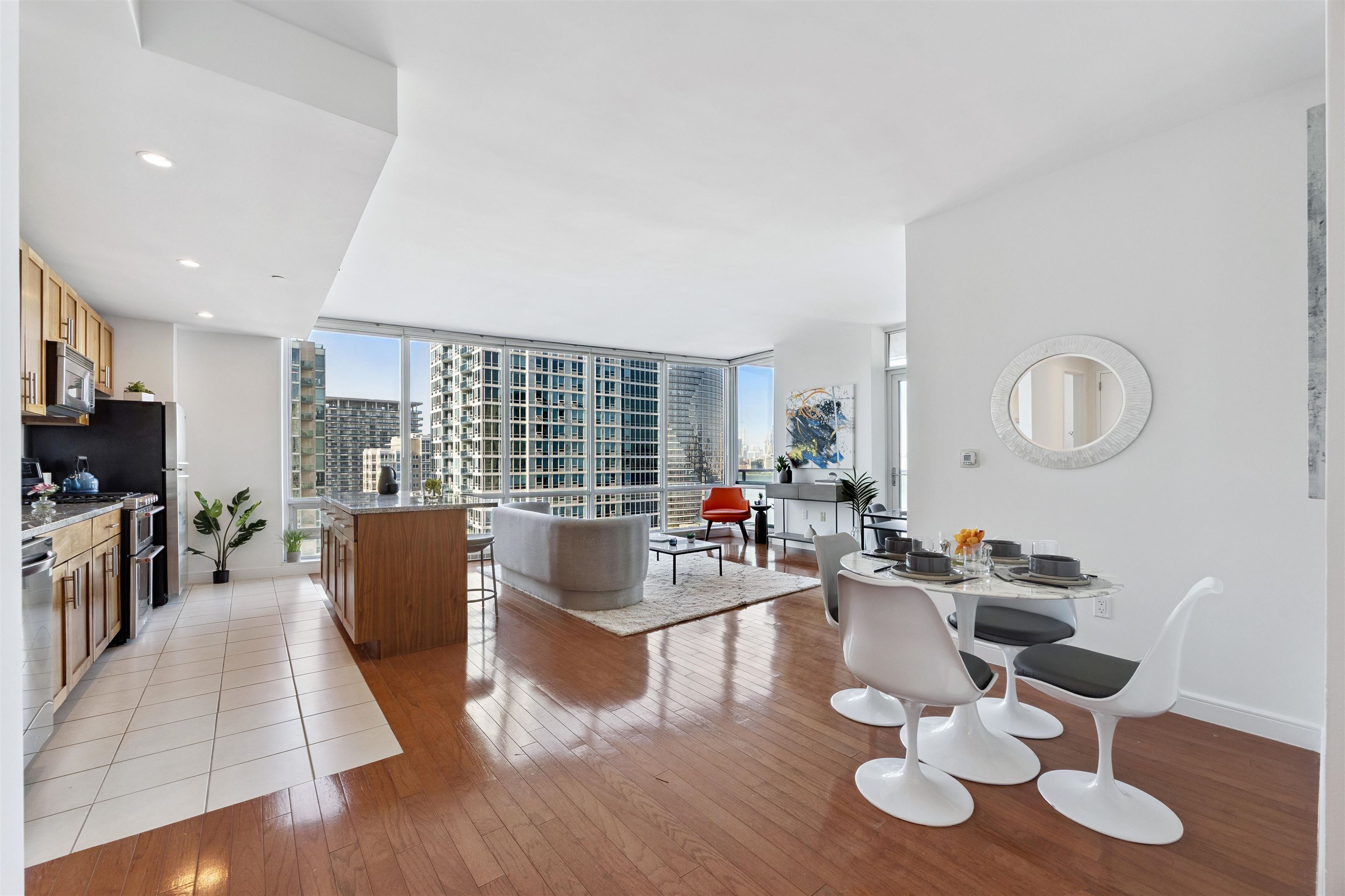 Rare Corner, East Facing, 1 Bed with a Private Balcony at The Shore! Experience breathtaking views of the Empire State Building, World Trade Center and the Hudson River through walls of floor-to-ceiling windows in this sun-drenched, corner-unit home. This unique layout has a nook that’s perfect for a dining area or a work space. The gourmet kitchen has plenty of cabinets for storage, granite countertops, stainless steel appliances and an island with a breakfast bar. The home features a large bathroom with double vanities, Central Heat/AC, hardwood floors throughout, in-unit washer/dryer. Building amenities include: 24/7 concierge, fitness center, jacuzzi, sauna, steam room, resident lounge, conference room, playroom and a roof deck with amazing NYC/River views! Experience the convenience of Newport! Located between the Newport & Hoboken PATH, Ferry, NJ Transit Train, Light Rail and Bus Terminal. Selection of several supermarkets, Target, Duane Reade, Newport Mall, Newport Green Park all minutes away.