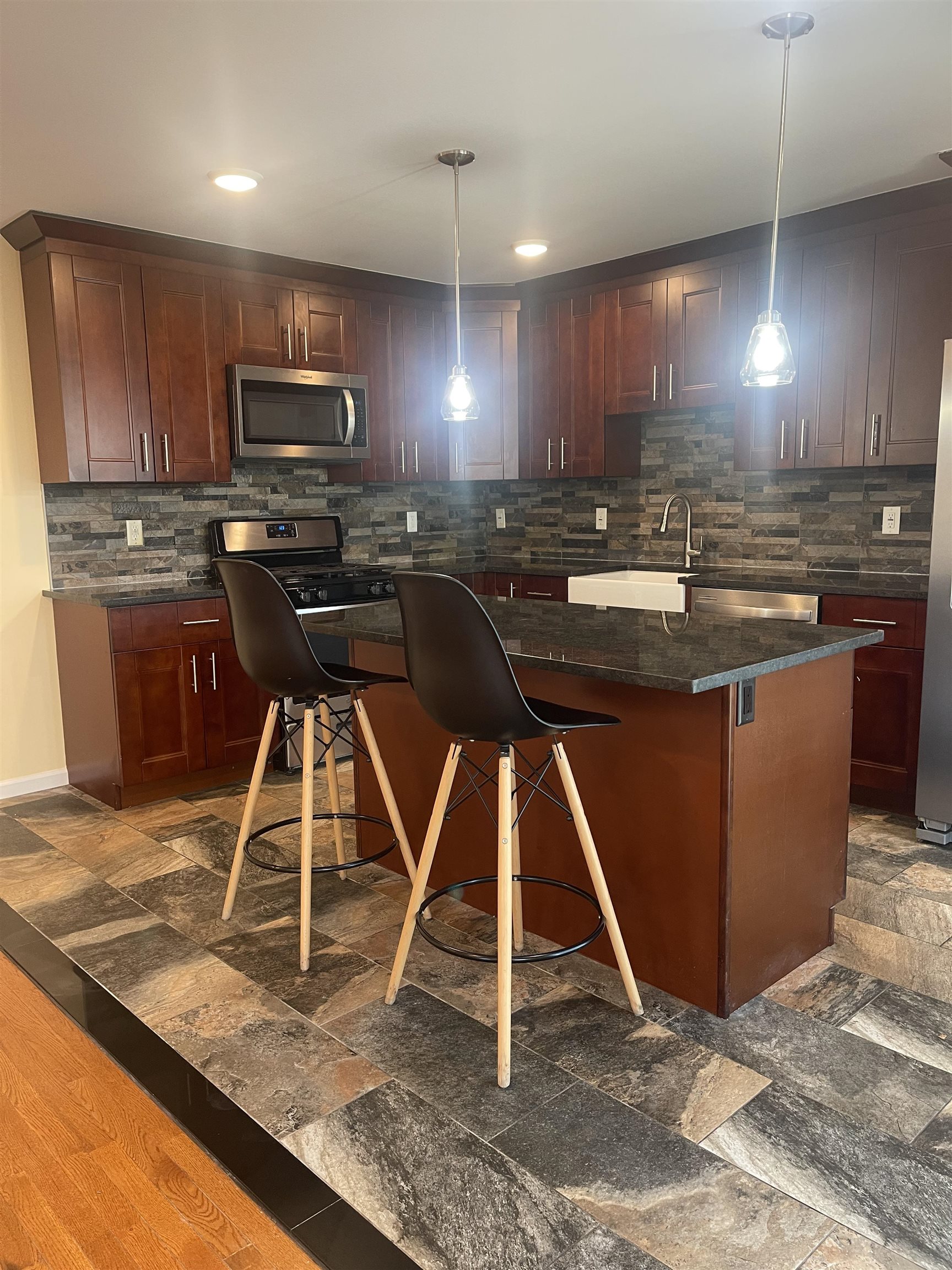 Luxury Rental in Bergen Point, freshly painted, newer construction (2023) w 3 bedrooms and 2 full baths w must see designer features. Oversized rooms w huge closets, sparkling hardwood floors plus ceiling fans. Ample storage 7 closets. Open floor plan Kitchen-Living room features a Juliet-style balcony w sundrenched views and splendid golden sunset exposures. Prime bedroom has river views, private full bath and walk-in closet. Fully loaded kitchen w granite counters, solid wood cabinets, a deep white porcelain Farmers sink. Free-standing counter island for serving and storage. All Stainless appliances plus a convenient Laundry closet w Washer-Dryer and sink. Ground level garage parking for one car w storage possibilities. Smart Apartment features include digital control of heat, AC, garage opener, EZ control from your phone app plus 24 hour security cameras. Convenient travel options at the 8th Street station, Manhattan bus plus Bergen Point Village w outdoor cafes, restaurants, salons and trendy boutiques. Henry Harris school district and the new Bayonne Bridge recreational walkway at your doorstep.