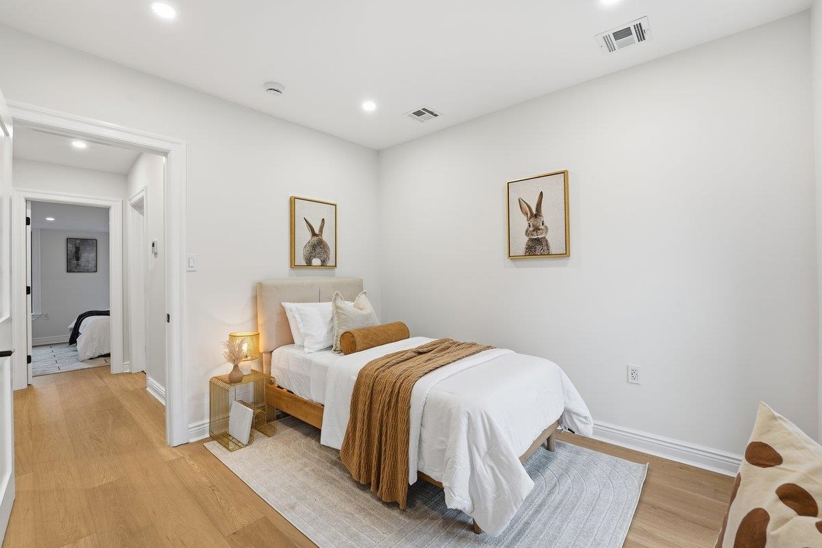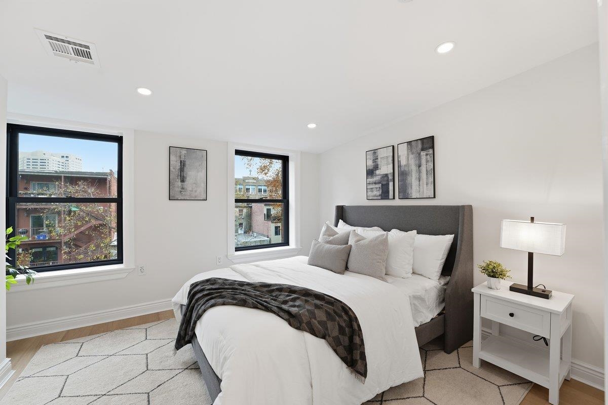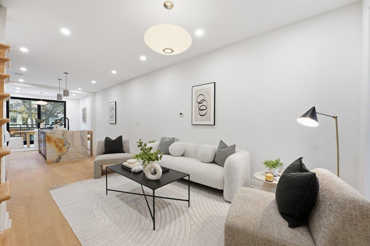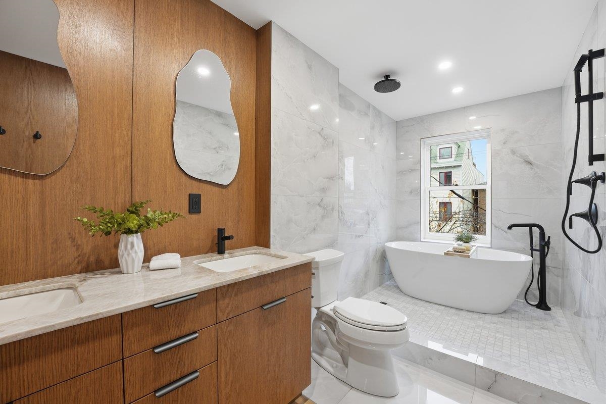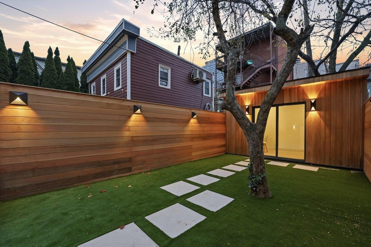 Nestled in one of Downtown Jersey City’s most coveted and convenient locations, this historic early 1900s townhouse has been masterfully reimagined through a top-to-bottom renovation that blends timeless architecture with modern luxury. Every element, from the facade to the fixtures, has been crafted with exceptional attention to detail and materials of the finest quality. This unique home stands out as one of the few houses in the Paulus Hook neighborhood featuring an authentic wooden Queen Anne style porch, a rare architectural gem that adds character and distinction to its beautifully restored exterior. Positioned on a rare full-size 100-foot-deep lot, the property includes a versatile annex structure perfect for a home office, gym, playroom, studio, or guest space. The home has been thoughtfully extended across the first two floors, offering generous interiors filled with abundant natural light, as well as two stunning terraces, one off the dining room on the parlor level and another extending from the primary suite above. From the rear of the house, enjoy striking views of the Jersey City skyline, where old-world charm meets the energy of modern urban life. Spanning four levels, the residence features three spacious bedrooms, with a recreation room that can easily be converted into a fourth bedroom if desired. The home also offers three lavishly appointed bathrooms with Kohler fixtures and imported European tiles, two cozy and inviting living areas, a dedicated home office, and a convenient laundry room. The showpiece kitchen showcases custom oak cabinetry, exquisite Fantasy Macabus Quartzite countertops and backsplash, and premium Bertazzoni stainless-steel appliances, making it both a culinary and design centerpiece. Occupying the entire second floor, the serene primary suite feels like a private retreat, complete with its own terrace, a custom oak-paneled closet system, and a spa-inspired bathroom featuring a soaking tub and luxurious wet shower. The renovation also includes a full facade restoration by ZHI, complemented by significant mechanical upgrades including upgraded electrical system, two HVAC systems, Marvin windows, top-of-the-line EPDM roof, and Navien tankless water heaters. Throughout the home, solid wood doors, white oak floors, recessed lighting, and elegant Herman Miller fixtures enhance the atmosphere of modern refinement and natural warmth. Moments from the PATH station, Grove Street’s vibrant shops and restaurants, the scenic waterfront, and Hamilton Park, this newly restored townhouse, complete with its private backyard annex offers an unparalleled combination of historic charm, superb craftsmanship, and contemporary comfort.