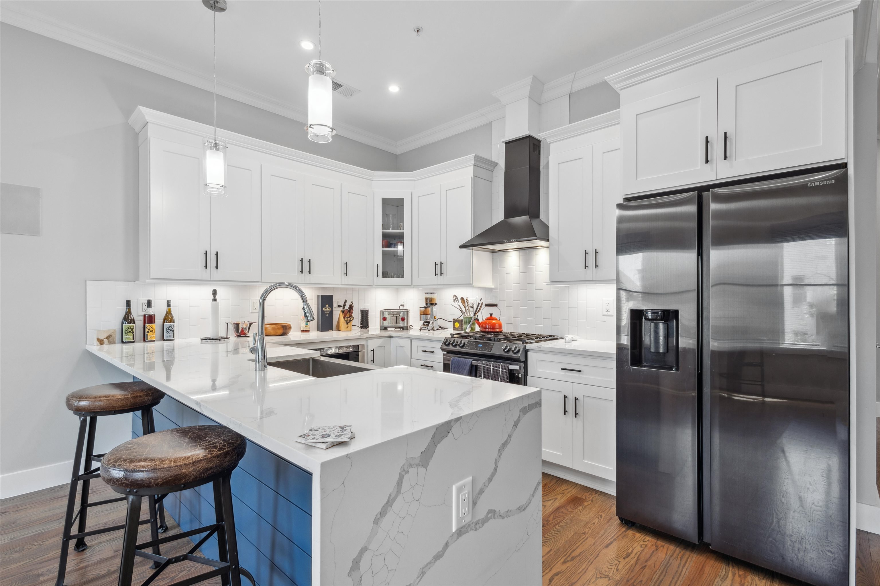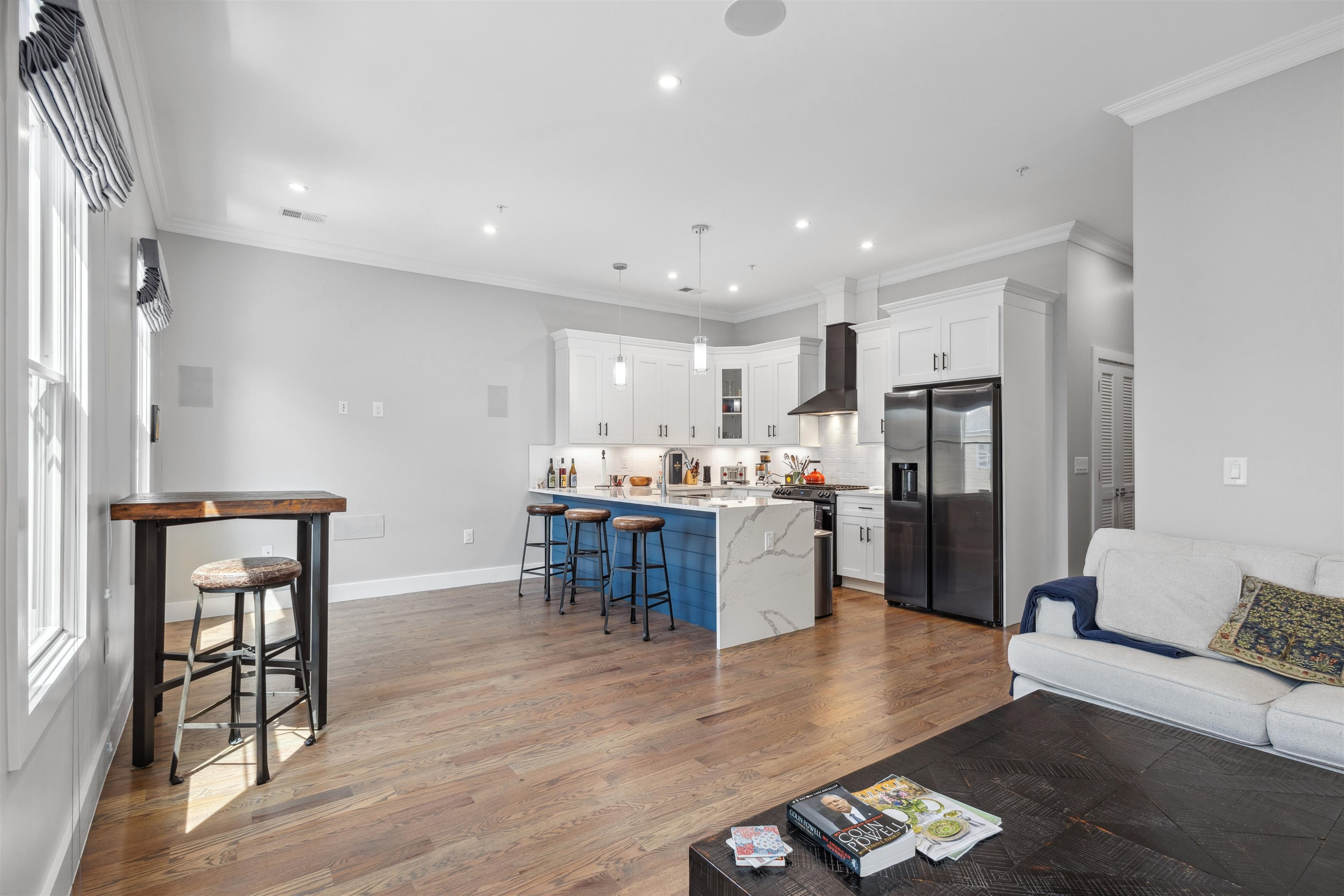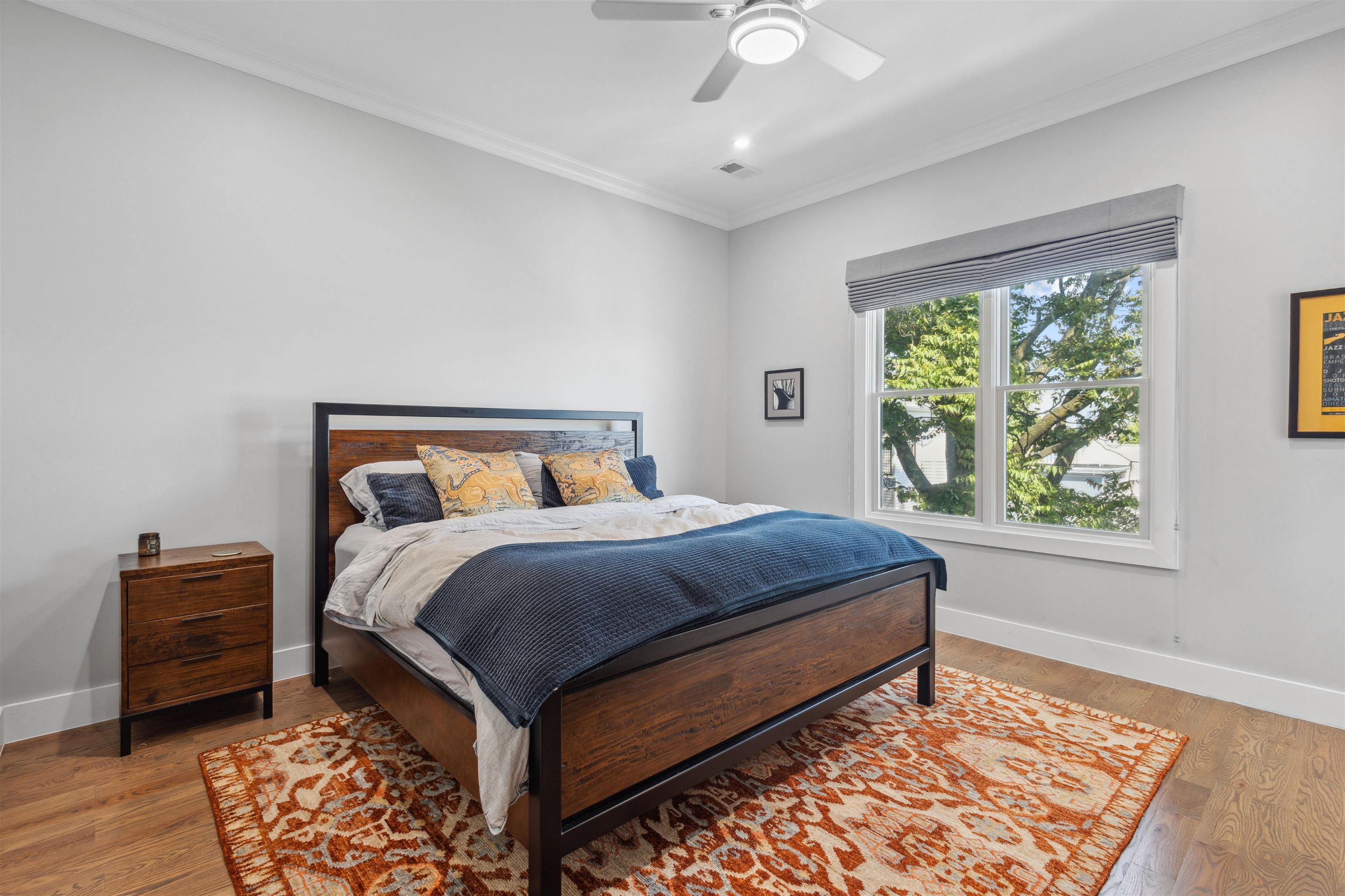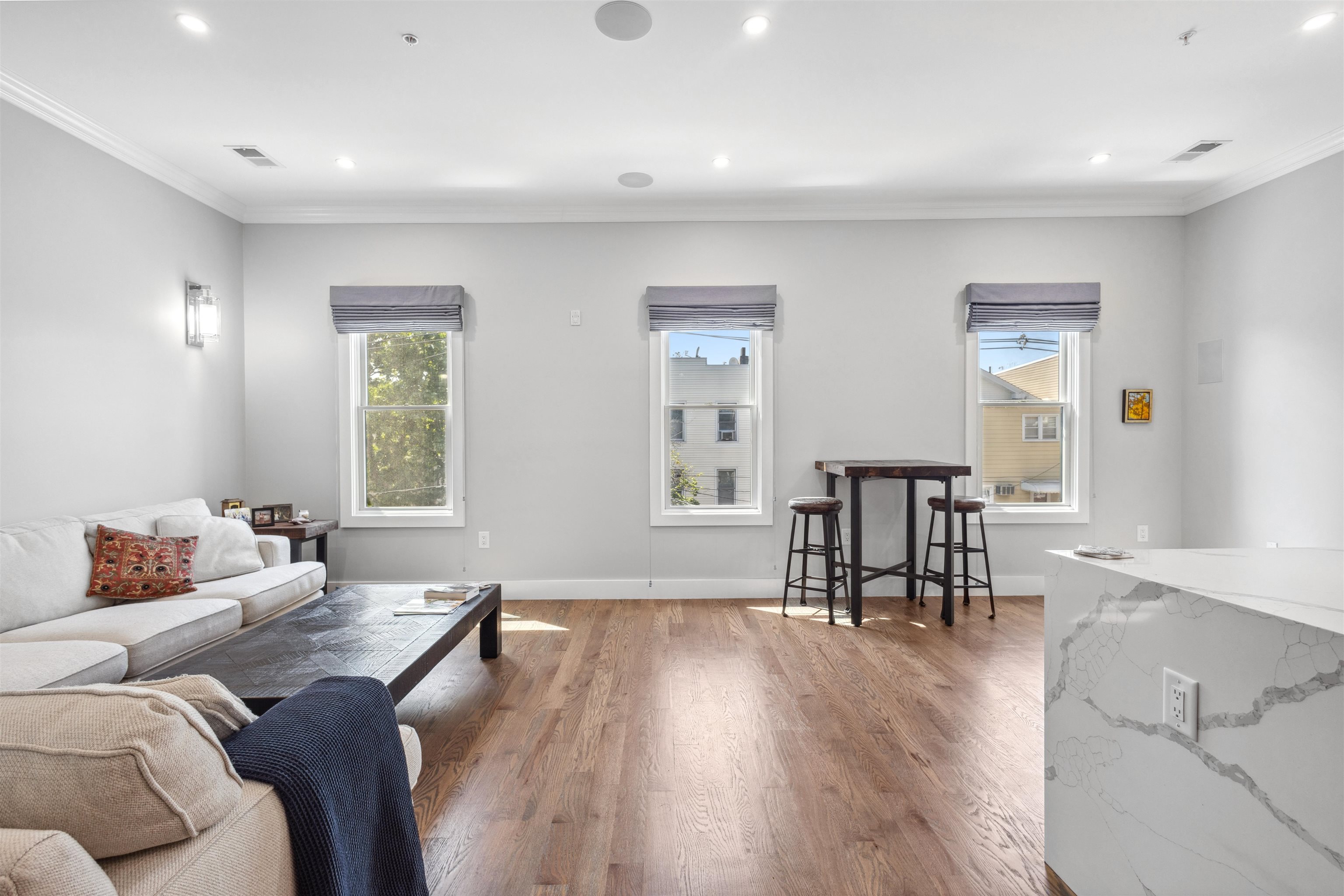 Move into the most desirable neighborhood in the Jersey City Heights, Mt. Pleasant, with over 1,300+ ft 2 of living space in this 3rd-floor penthouse 3/2 condo. This beautiful home was gut-renovated in 2022 with spacious open floor plan, roof deck, 100 ft basement storage unit, central air and heat, EV charger, and parking for one compact vehicle. The unit is classically finished with crown molding framing tall 10 ft ceilings, red oak hardwood floors, and large Pella windows. The modern white kitchen shines with sparkling waterfall quartz counters, stainless steel farm sink, shaker cabinets, blue accent shiplap, Summit wine fridge, garbage disposal, built-in drawer microwave, and black Samsung smart appliances. Additional smart home features include a ring doorbell and camera, Samsung stackable washer and dryer, and built-in premium speakers for the living room and roof deck. The unit is bathed in natural light with large windows on all sides covered with custom Top-Down-Bottom-Up Roman blackout shades. All bedrooms have ample closet space and built-in shelving. Spacious 300 ft master bedroom with en-suite bathroom and large walk-in closet. Gaze at the Manhattan skyline and One World Trade from your California King bed. Bathrooms boast stylish Blossom vanities, glass shower or bathtub combo, and polished chrome fixtures. Soak in additional scenery with a 500 ft private roof deck showcasing incredible cityscape views, just waiting to become your outdoor living room. Minutes walk to Washington and Riverview-Fisk parks, hip eateries and coffee shops, grocery stores, schools and daycare, and the 9th/Congress Street Hoboken Light Rail Station which quickly transports you to NJ Path Train and NYC MTA. Pets allowed with some conditions and pet deposit.