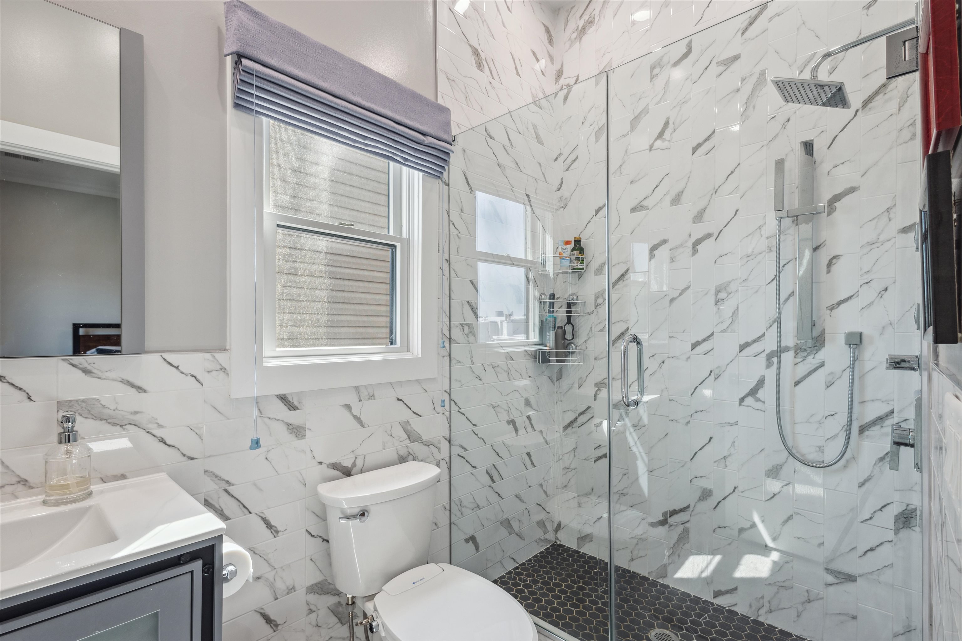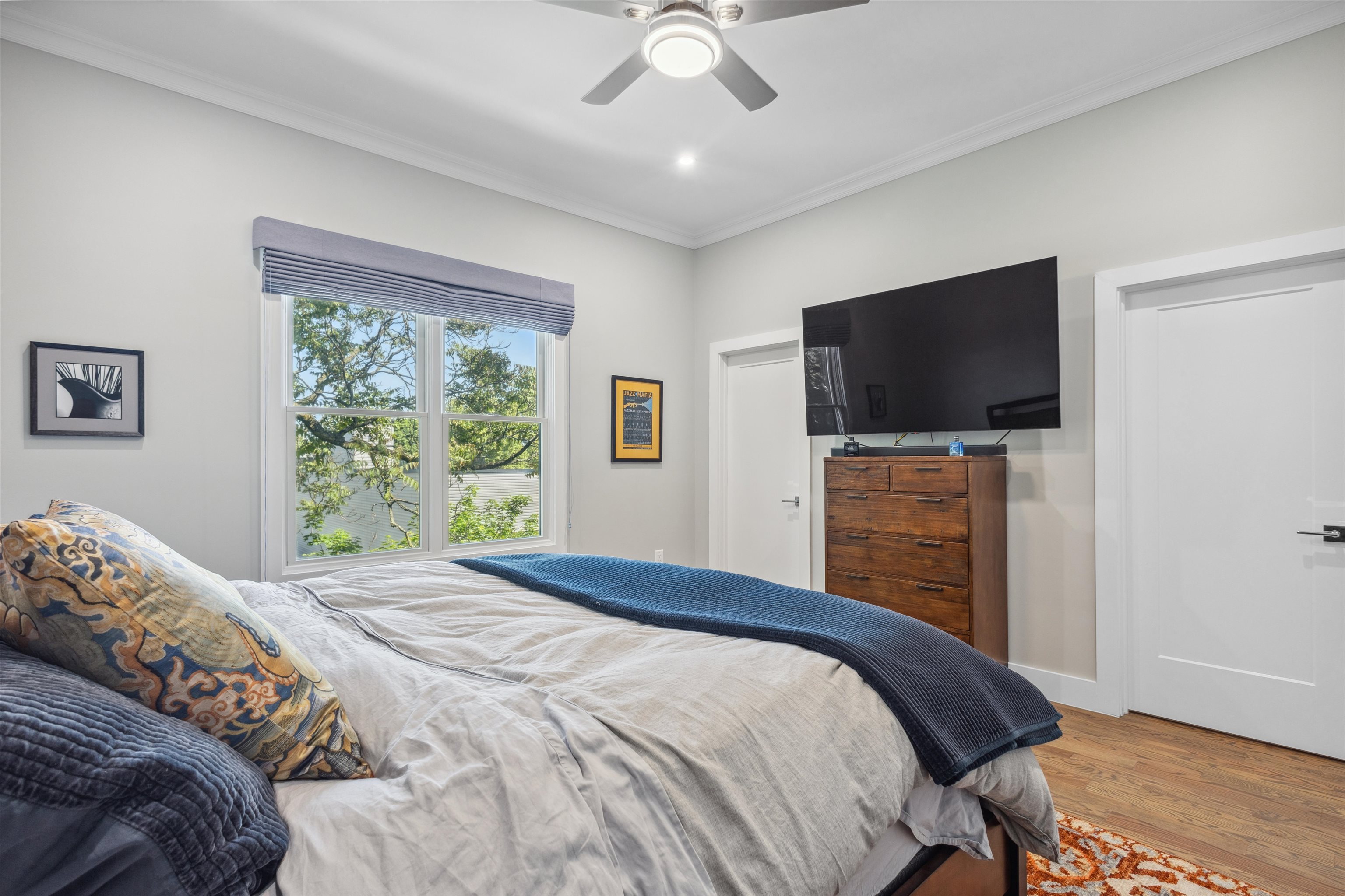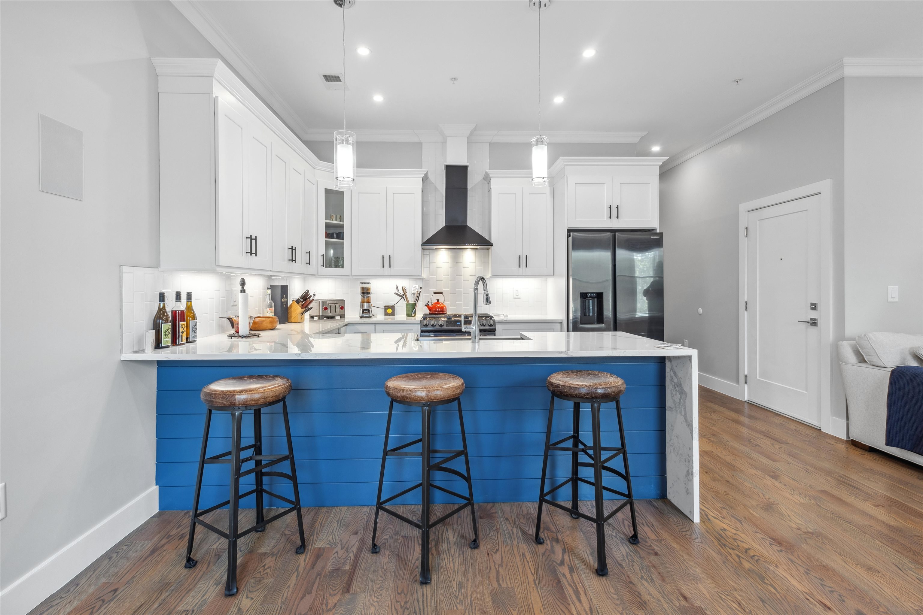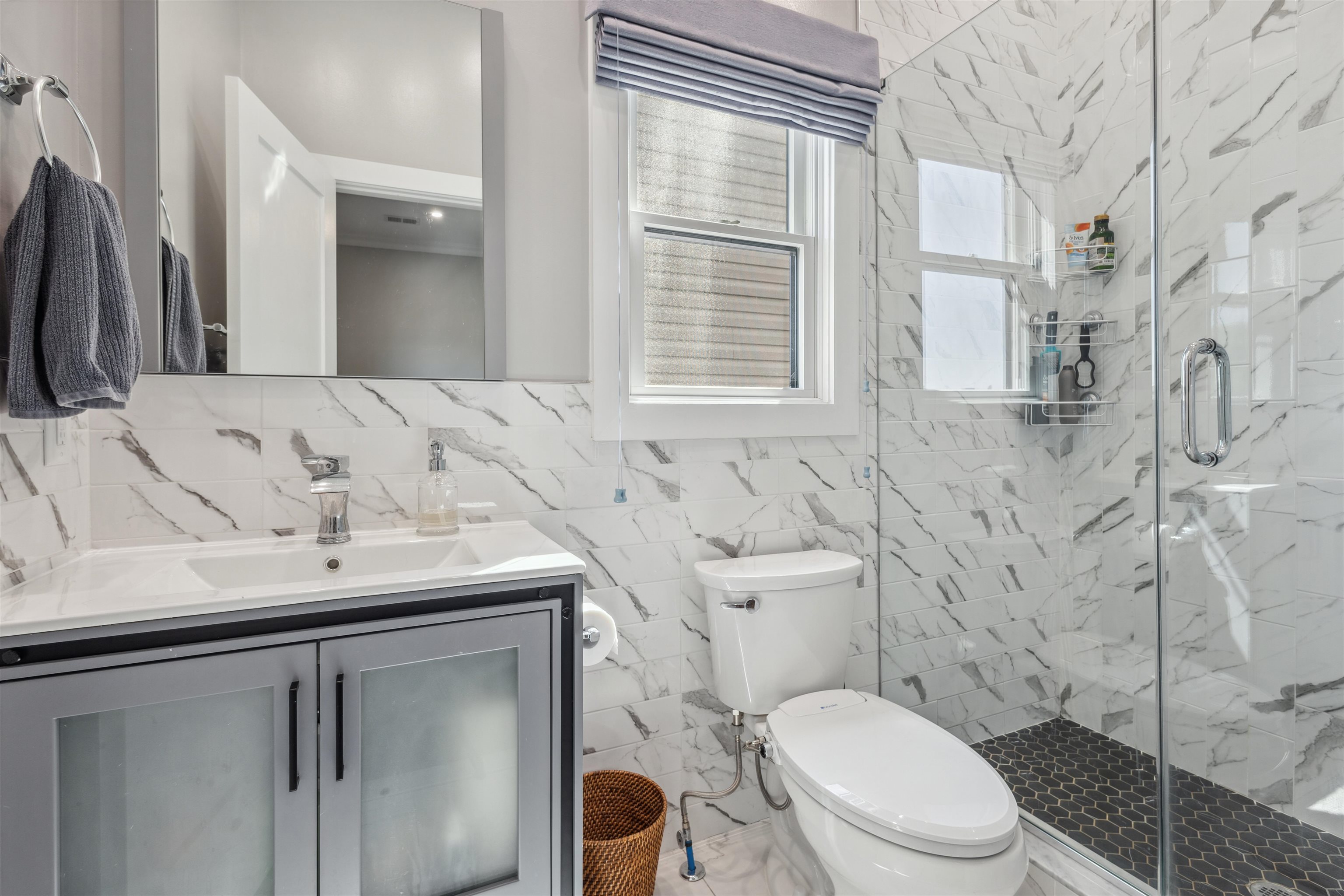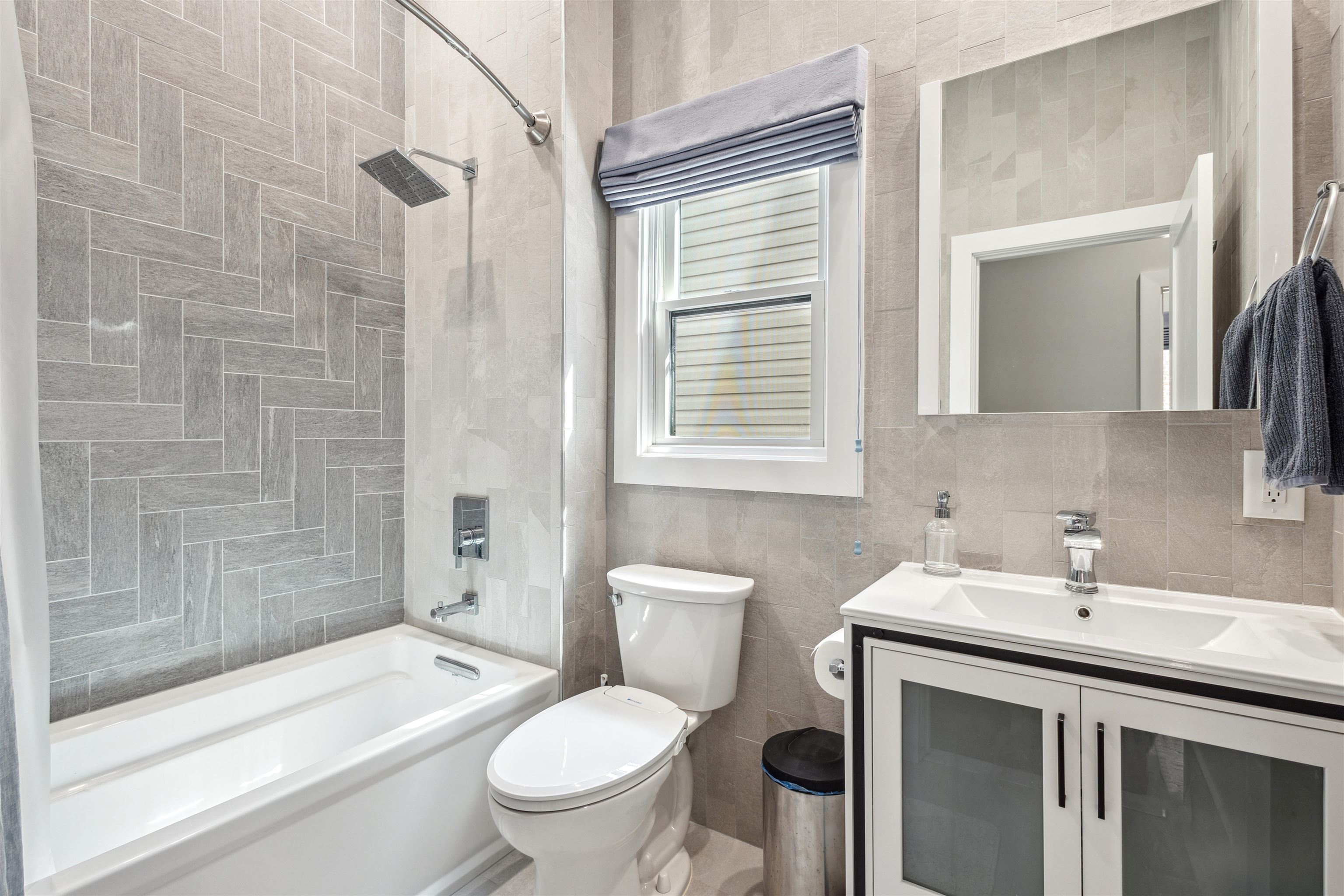 Move into the most desirable neighborhood in the Jersey City Heights, Mt. Pleasant, with over 1,300+ ft 2 of living space in this 3rd-floor penthouse 3/2 condo. This beautiful home was gut-renovated in 2022 with spacious open floor plan, roof deck, 100 ft basement storage unit, central air and heat, EV charger, and parking for one compact vehicle. The unit is classically finished with crown molding framing tall 10 ft ceilings, red oak hardwood floors, and large Pella windows. The modern white kitchen shines with sparkling waterfall quartz counters, stainless steel farm sink, shaker cabinets, blue accent shiplap, Summit wine fridge, garbage disposal, built-in drawer microwave, and black Samsung smart appliances. Additional smart home features include a ring doorbell and camera, Samsung stackable washer and dryer, and built-in premium speakers for the living room and roof deck. The unit is bathed in natural light with large windows on all sides covered with custom Top-Down-Bottom-Up Roman blackout shades. All bedrooms have ample closet space and built-in shelving. Spacious 300 ft master bedroom with en-suite bathroom and large walk-in closet. Gaze at the Manhattan skyline and One World Trade from your California King bed. Bathrooms boast stylish Blossom vanities, glass shower or bathtub combo, and polished chrome fixtures. Soak in additional scenery with a 500 ft private roof deck showcasing incredible cityscape views, just waiting to become your outdoor living room. Minutes walk to Washington and Riverview-Fisk parks, hip eateries and coffee shops, grocery stores, schools and daycare, and the 9th/Congress Street Hoboken Light Rail Station which quickly transports you to NJ Path Train and NYC MTA. Pets allowed with some conditions and pet deposit.