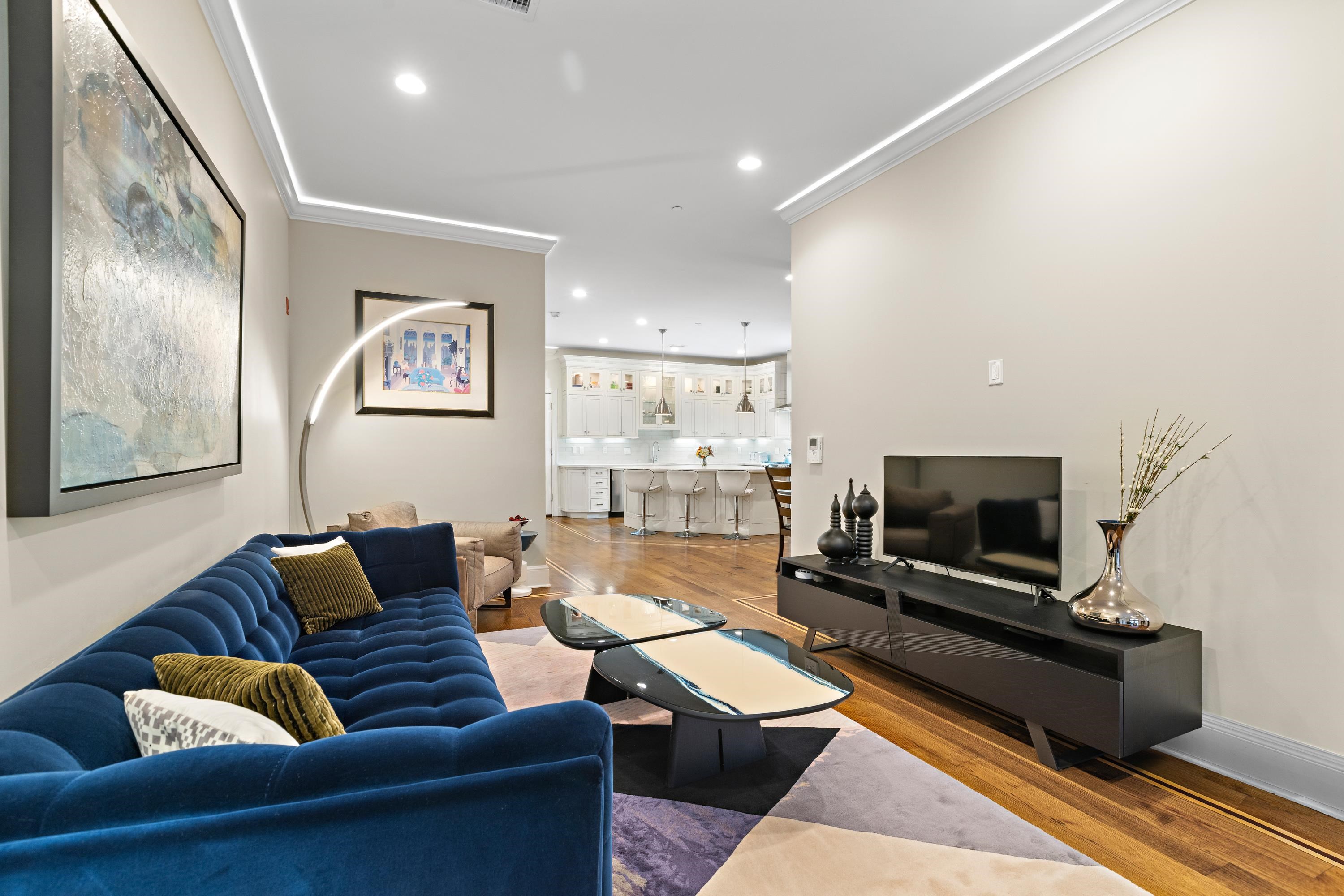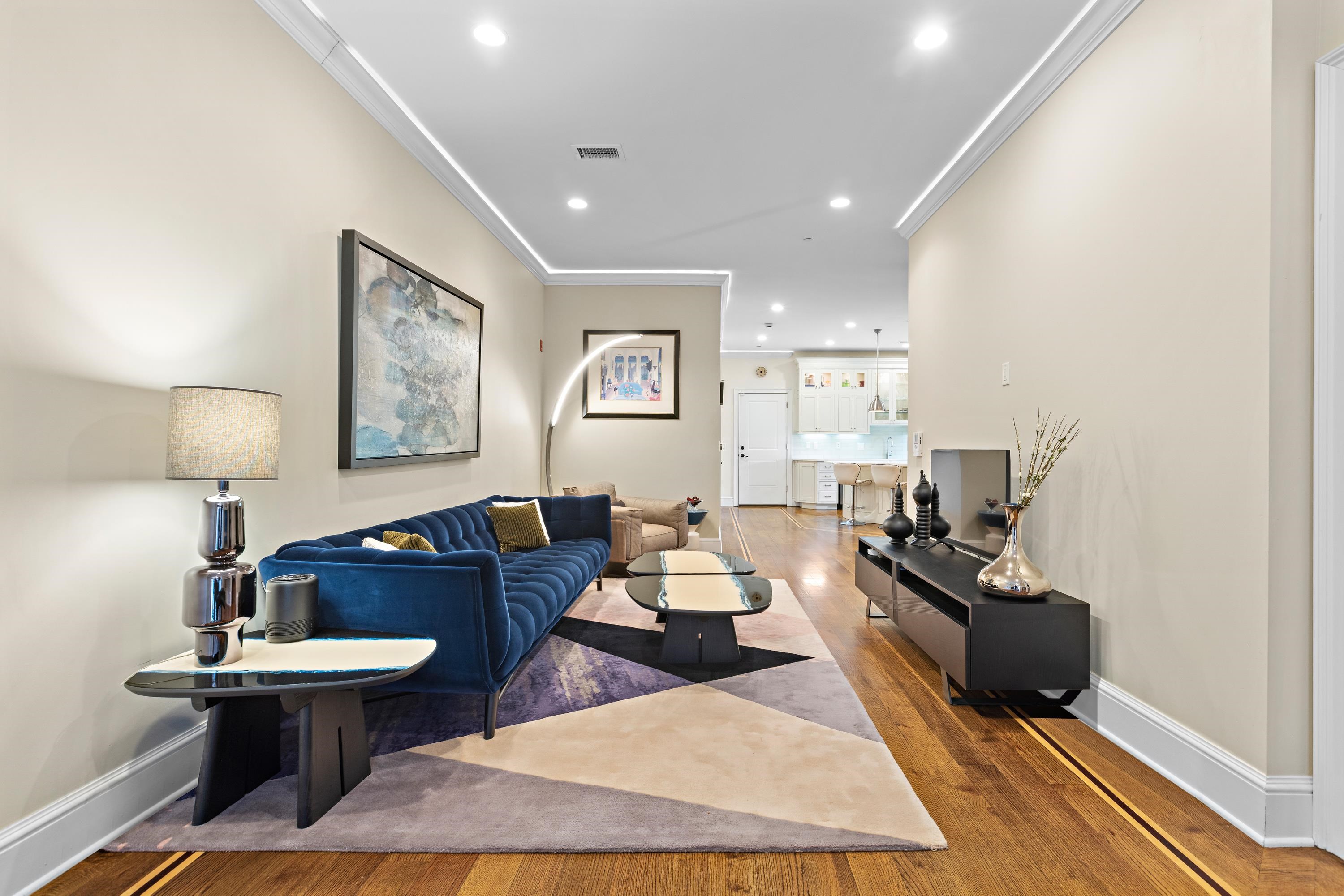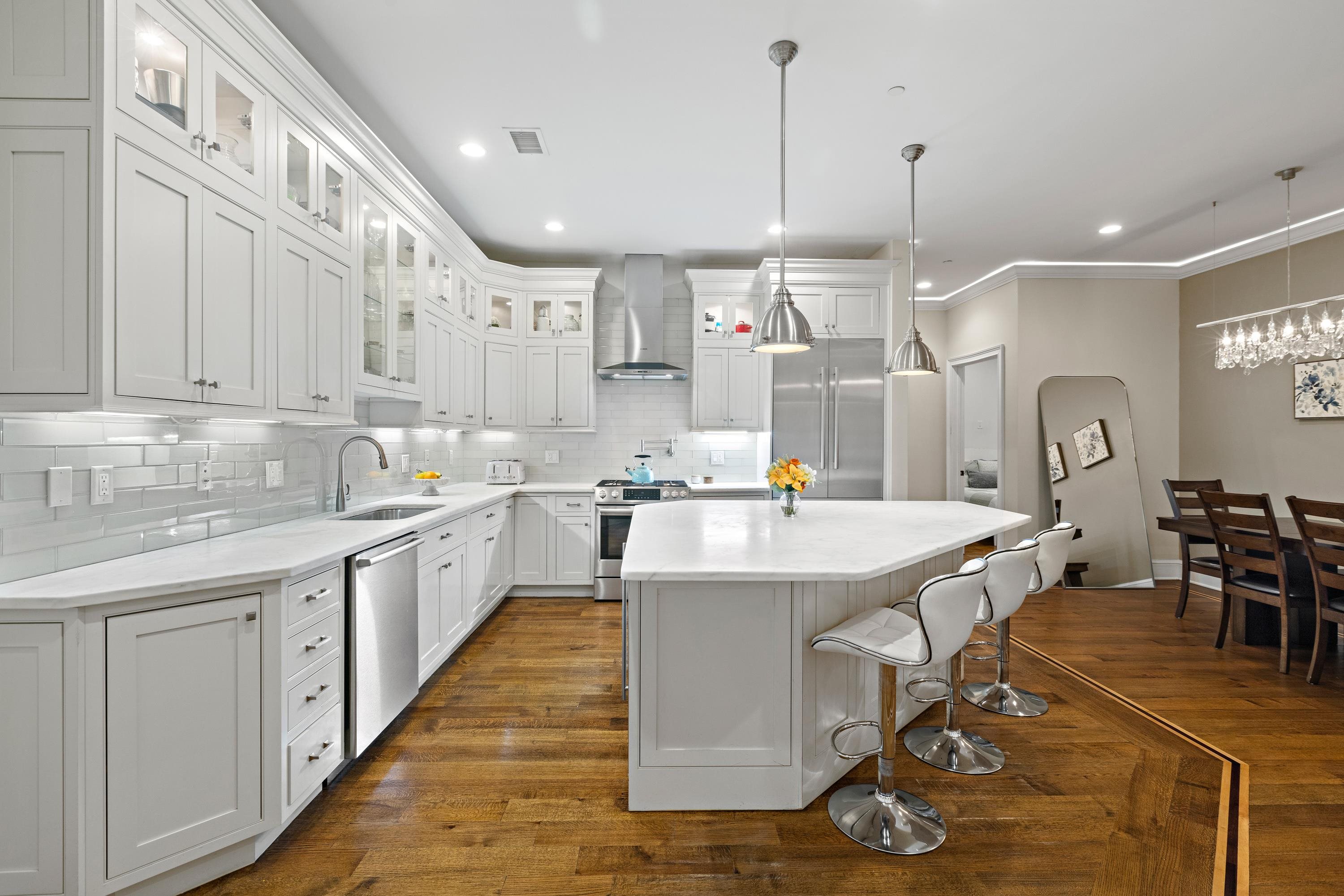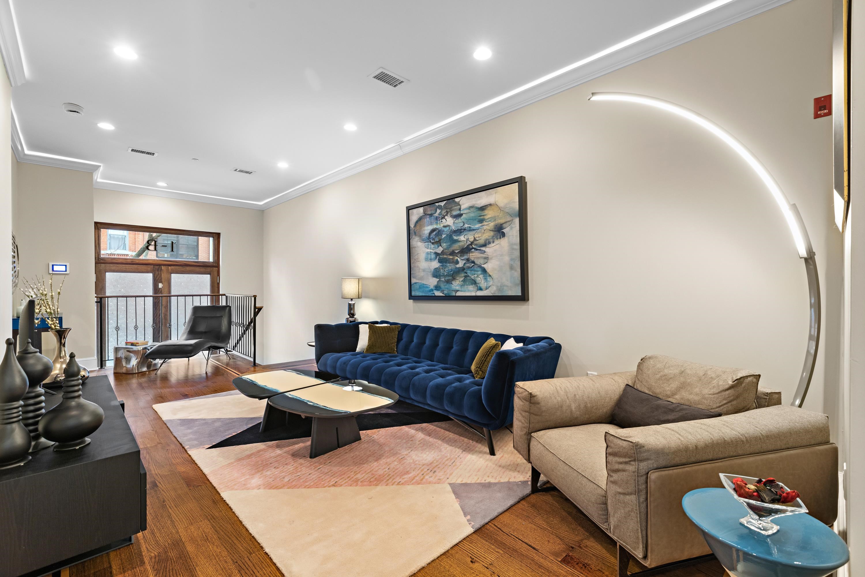 The extraordinary Downtown JC Condo that lives like a Townhome! A private 1st Street entrance defines the experience of this beautifully differentiated 3 bedroom (2 bedroom and large den) superior condominium floor plan that offers the feel, breadth, and dimension of a townhome at The Gannon. A perfectly placed super-sized parking spot with a wall of custom made storage units that will wow you all becomes urban perfection! From the minute you enter into its unique and elegant private double door entrance you are moved by the special qualities of this fabulous one of a kind residence. Step up from its entry hall into its living area and feel the sprawl and the symmetry of the floor plan move in on you as you approach the home’s show stopping gourmet kitchen and dining area. A kitchen of extraordinary proportion and attractiveness with a large and splendid showcase island is the sensational focal point of the living area, and will certainly be the gathering place of many friendly and social gatherings you will be proud to host. You may never want to leave it! Outstanding kitchen also features Bosch appliances, solid white maple Decora cabinets, Italian Calacatta Gold marble counters, white subway tiling, vented hood oven/range, and wine refrigerator. Also features an impressively sized main suite with spa-like bath featuring double vanities, Kohler fixtures, sumptuous walk-in shower, and customized walk-in closet. The home boasts a striking and unique 2nd bedroom as well with dimensions that can easily provide designated spaces for kids with their own play area, or as a bedroom with a separate office or work area. The third bedroom/large den is also well proportioned with a tucked away comfort, both bedrooms feature custom closets. Other highlights include 10’ ceilings, red oak wide plank floors with decorative inlay, crown molding accented with LED lighting, central A/C and heat, and washer/dryer utility room in unit. The Gannon is also pre-wired for smart home automation and security system. This sensational DTJC residence on 1st and Grove is elegantly poised with an individual style, quality, and design that will satisfy you aesthetically, as well as fulfilling all your utilitarian needs with its very special convenient parking and storage area in building attached garage, just outside your door. Common amenities include a spectacular roof deck with complete outdoor kitchen with grilling entertaining deck with lounging areas; large green pet friendly residents’ yard, bicycle storage, and striking lobby with herringbone floors and mail package room. Superbly poised with the Grove Street PATH practically at your doorstep, and nestled between Hamilton and Van Vorst Parks, the Gannon is poised among restaurants, coffee shops, grocery stores, parks, eateries, nightlife, day care, pet care and Light Rail. A home of unique dimension, quality, and character awaits you in the heart of DTJC! A dream come true! Viewings by appointment only.