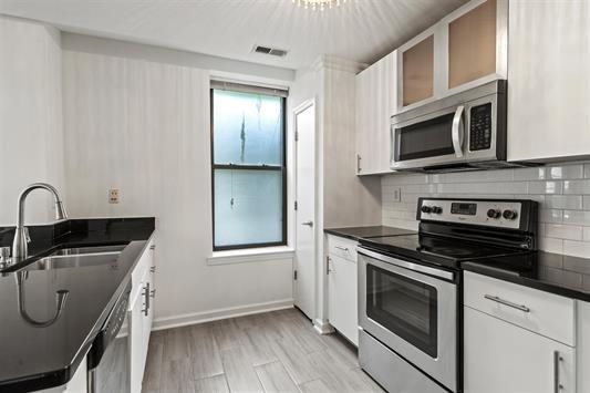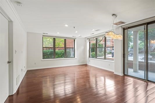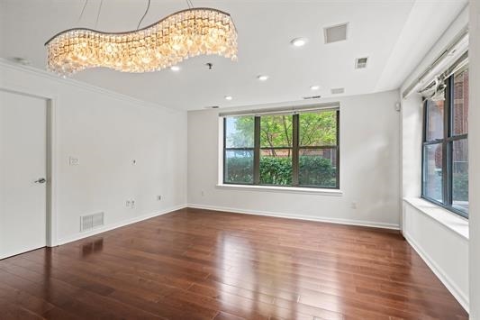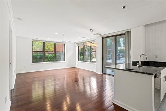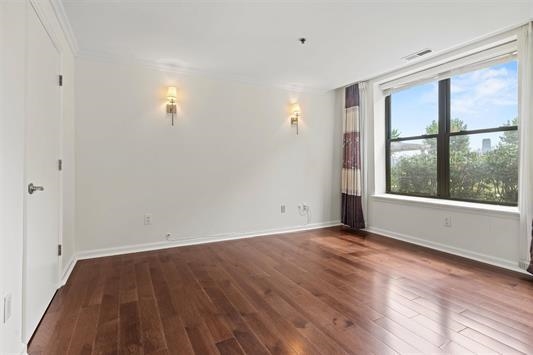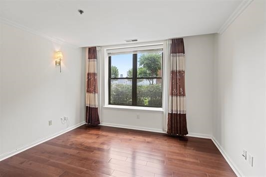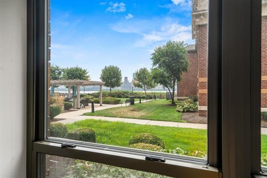 This beautiful 2 bed 2 bath home with 1222 sqft offers an open, sun-drenched layout with hardwood floors throughout. It features recessed lighting in the spacious living room, custom light fixtures, and custom blinds with a blackout shade in the primary bedroom. Both bedrooms include walk-in closets, providing generous storage. The kitchen boasts stainless steel appliances and granite countertops. Step out onto your large private patio and enjoy a semi-private entrance with only two units per floor. Located just steps from the pool and clubhouse, which features a fitness center, indoor basketball court, pool, wet bar and billiards room, business center, and theater. Enjoy resort-style amenities including, a children’s playground, 24/7 concierge service, and a premier Hudson River location. Commuter-friendly with walking access to the Light Rail, bus, and ferry to NYC. Conveniently close to shopping, dining, and entertainment. Utilities included: water, gas, sewer, cable, internet, parking, access to amenities. Tenant only pays electric and renter’s insurance.