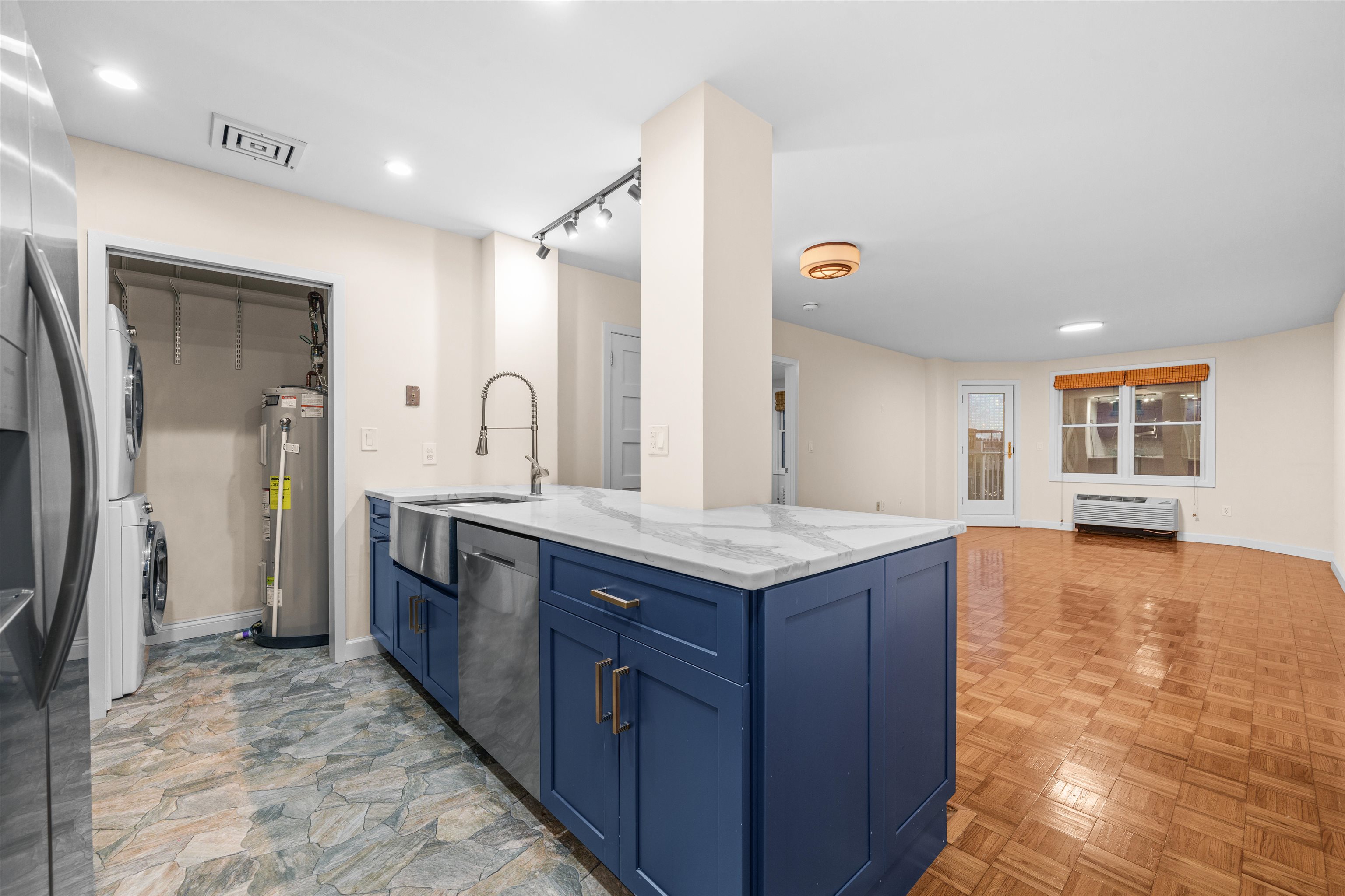 Welcome home to this beautifully renovated one-bedroom, one-and-a-half-bath residence set on a charming, tree-lined block in the heart of Van Vorst Park. Thoughtfully designed with both style and functionality in mind, this home offers a rare combination of modern finishes and classic neighborhood charm. The open eat-in kitchen is outfitted with a full suite of stainless steel appliances, sleek cabinetry, and ample space for dining or entertaining. Hardwood floors run throughout, complemented by in-unit washer and dryer for everyday convenience. The spacious bedroom features a custom-designed closet that leads seamlessly into the ensuite bath, creating a private and well-appointed retreat. A separate half bath adds flexibility for guests—an uncommon and highly desirable touch in a one-bedroom home. Step out onto your private balcony and enjoy eastern-facing views over Downtown Jersey City, perfect for morning light and city skyline ambiance. Located moments from neighborhood cafés, restaurants, and bars, this home offers the perfect blend of tranquility and access—providing an easy commute to NYC while enjoying one of Jersey City’s most desirable residential neighborhoods.