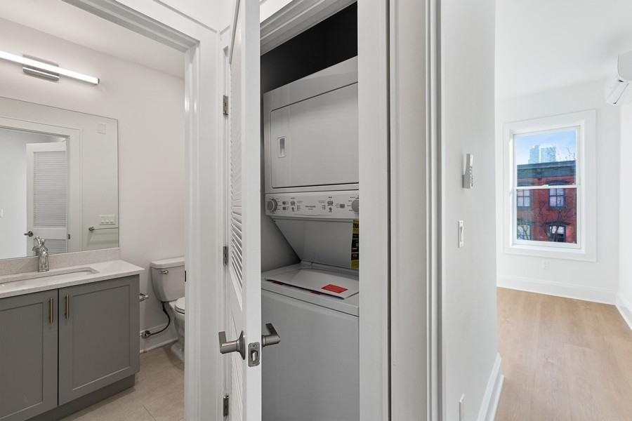 It is the historical building which has Just finished the renovation. Brand new modern apartment with a shared backyard near Grove Street path station. Consist of living room/dining room and kitchen equipped with stainless-steel major appliances. The apartment has two bedrooms on North facing and South facing with the living quarter in the middle. The in-unit washer/dryer and hardwood floor throughout. Located in the heart of JC downtown near parks and various trending restaurants and cafés. Some photos are from reverse side unit.