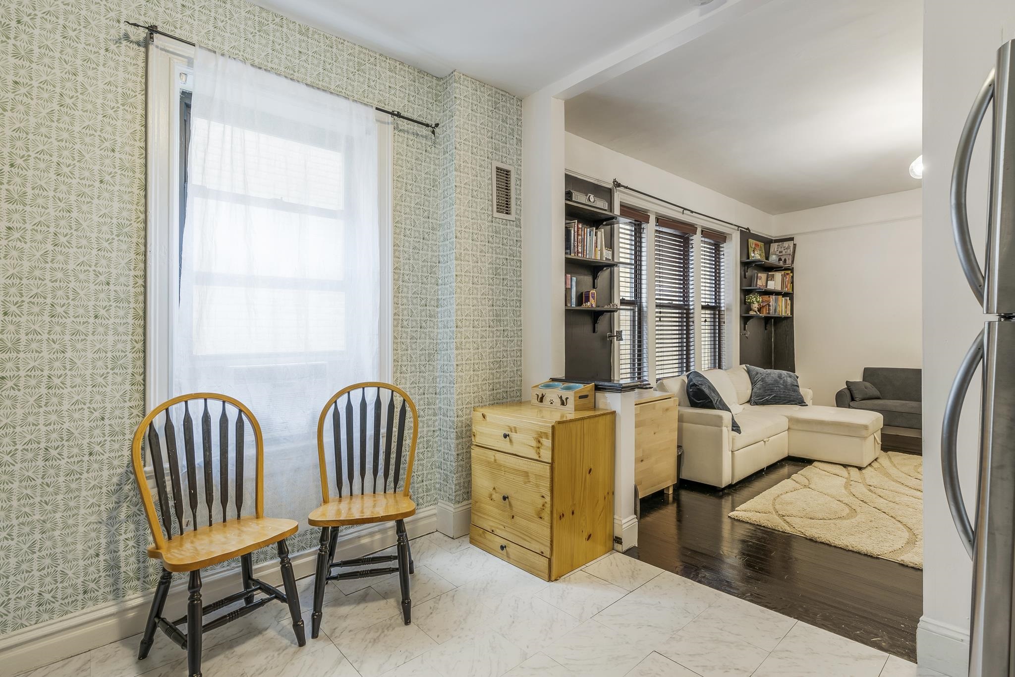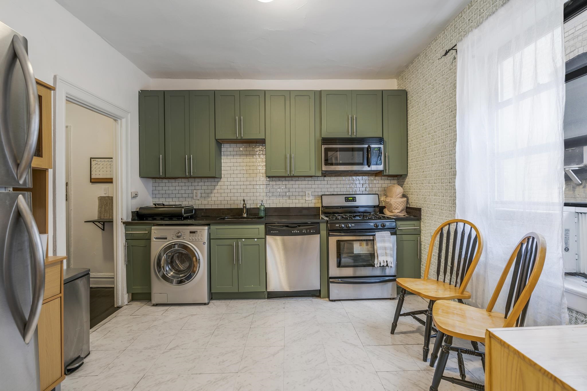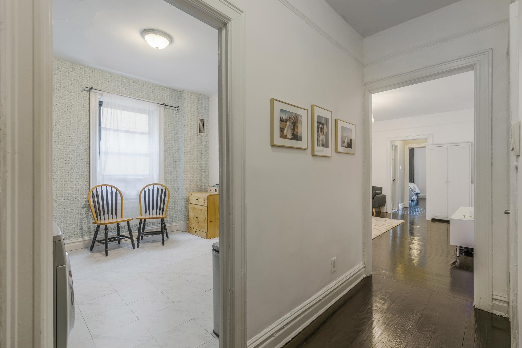 Welcome to this gorgeous mid-century condo in the heart of Jersey City! This spacious 1-bedroom, 1-bath end-unit has been beautifully updated, featuring a modern renovated kitchen and bathroom while maintaining its timeless charm. Inside, you’ll find hardwood floors, a dishwasher, and the convenience of an in-unit washer & dryer. The monthly maintenance fee includes heat and hot water, making this home both stylish and practical. Perfectly located just steps from Lincoln Park, one of Jersey City’s largest and most vibrant parks. You’ll be within walking distance to the Light Rail, St. Peter’s University, 24-hour Walgreens, restaurants, grocery stores, and shopping. For commuters, buses to the PATH and a direct route to Midtown Manhattan are right at the end of the street