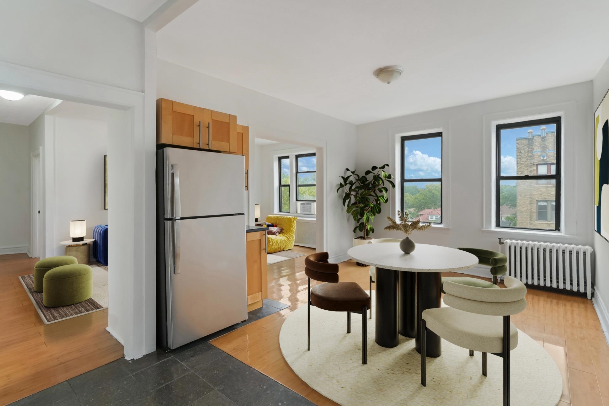 Rent your new home for the New Year!. Welcome to 277 Harrison Avenue, Unit E7, a bright top-floor gem nestled in the heart of Jersey City’s historic West Side. This charming 2-bedroom, 1-bath home includes a formal dining room that can be easily converted into a third bedroom, offering both style and flexibility. Located on the top floor, the residence boasts abundant natural light, multiple exposures, and delightful views over the treetops and Lincoln Park Historic District, offering protected views. Inside, you’ll find a spacious layout, from the cozy living room to the expansive dining area, perfect for entertaining or setting up a personal work-from-home space. The prewar allure is evident in the plaster moldings and ample proportions. Situated within a friendly prewar condominium, you’ll enjoy the charm and elegance of Arts and Crafts style architecture and peaceful, tree-lined streets. Right outside your door, the neighborhood buzzes with weekend farmers’ markets, summer concerts at the Lincoln Park fountain, outdoor movie nights, jazz cafés, local dining spots, and boutique shops. For outdoor enthusiasts, nearby Skyway Golf Course and serene birdwatching trails offer great escapes. With convenient access to JFK Boulevard commuter buses, the Journal Square PATH, and the Light Rail, traveling to New York City is a breeze. This is more than just a home; it’s your opportunity to create a top-floor haven in one of Jersey City’s most beloved neighborhoods.
