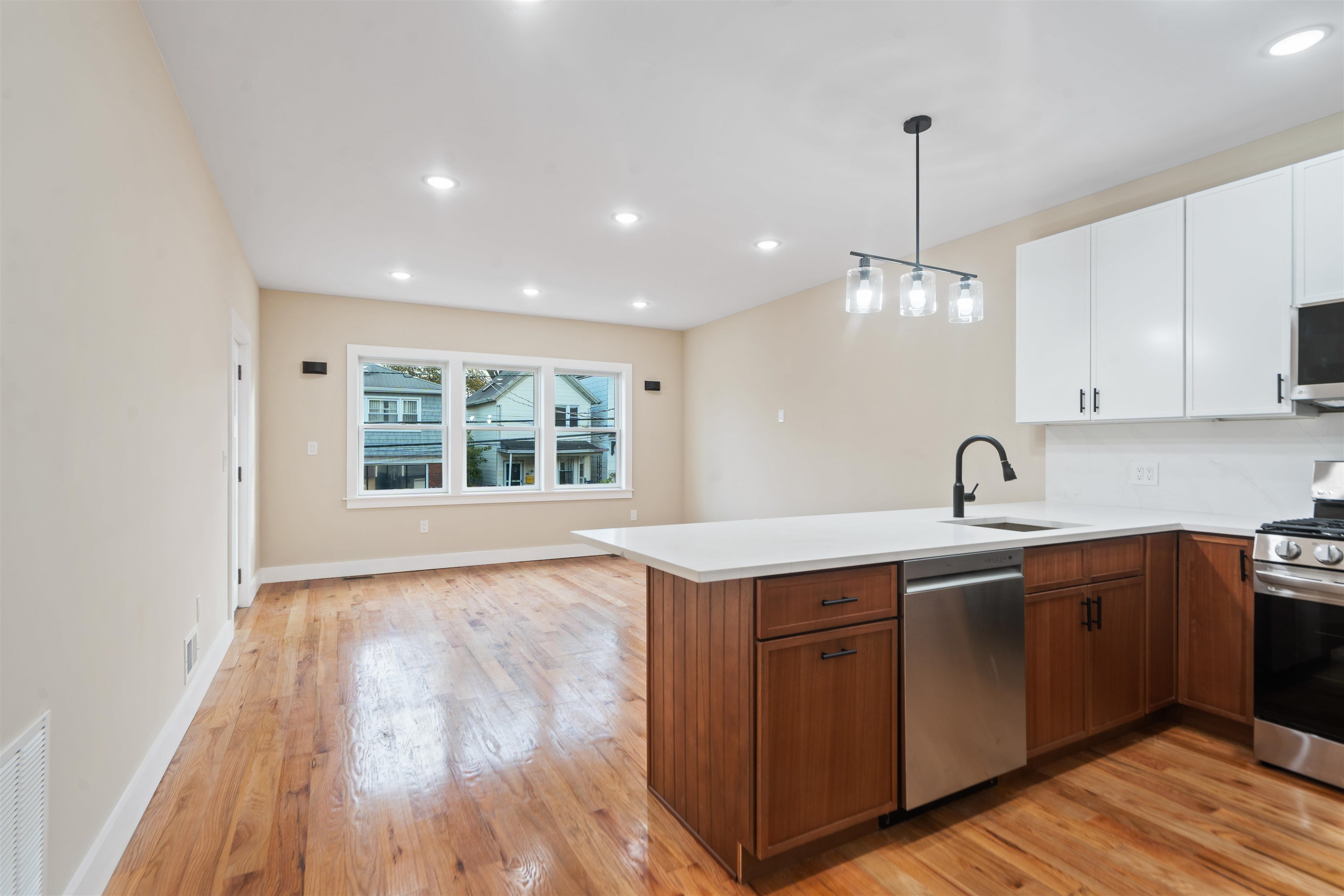 NEWLY constructed property with GARAGE parking for 2 CARS! This 2-story residence features 3 bedrooms and 2.5 bathrooms. Conveniences include central AC/Heat, Washer/Dryer, and tons of storage! The open-concept living area gets great natural light from oversized windows, showcasing the beautiful hardwood floors. The kitchen is equipped with stainless steel appliances, a wine refrigerator, white quartz countertops, and a blend of white and natural wood cabinetry. The main floor consists of 3 bedrooms, 2 full bathrooms, living room, dining area, and kitchen. The primary bedroom has an expansive walk-in closet, en-suite bathroom with a double sink, and private balcony access. All bathrooms are appointed with floor-to-ceiling tile and smart mirrors. The lower level has an oversized bonus room with a bar area and a half bathroom. This floor allows access to the PRIVATE backyard and DIRECT garage access, which has additional storage. Available 1/1/26