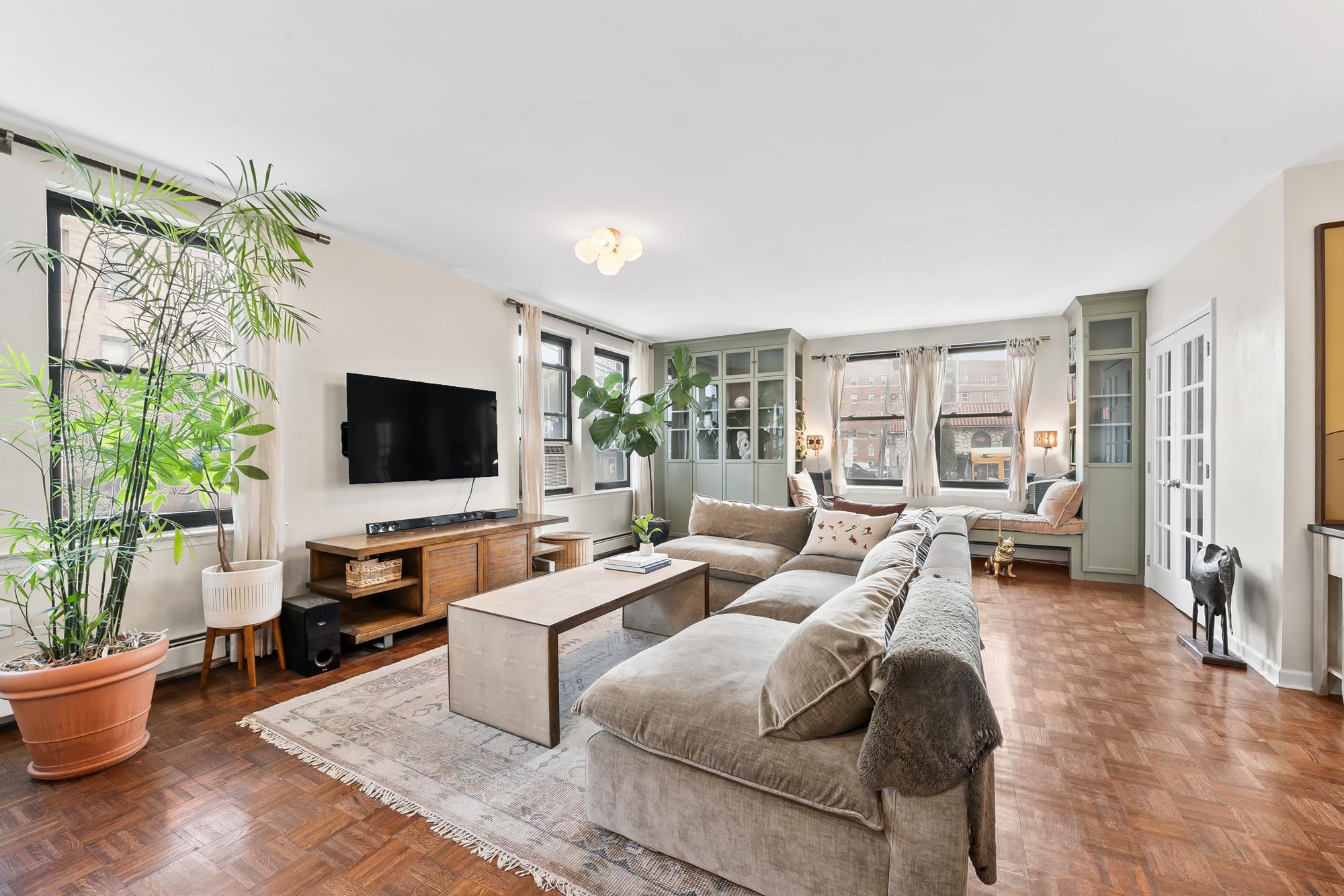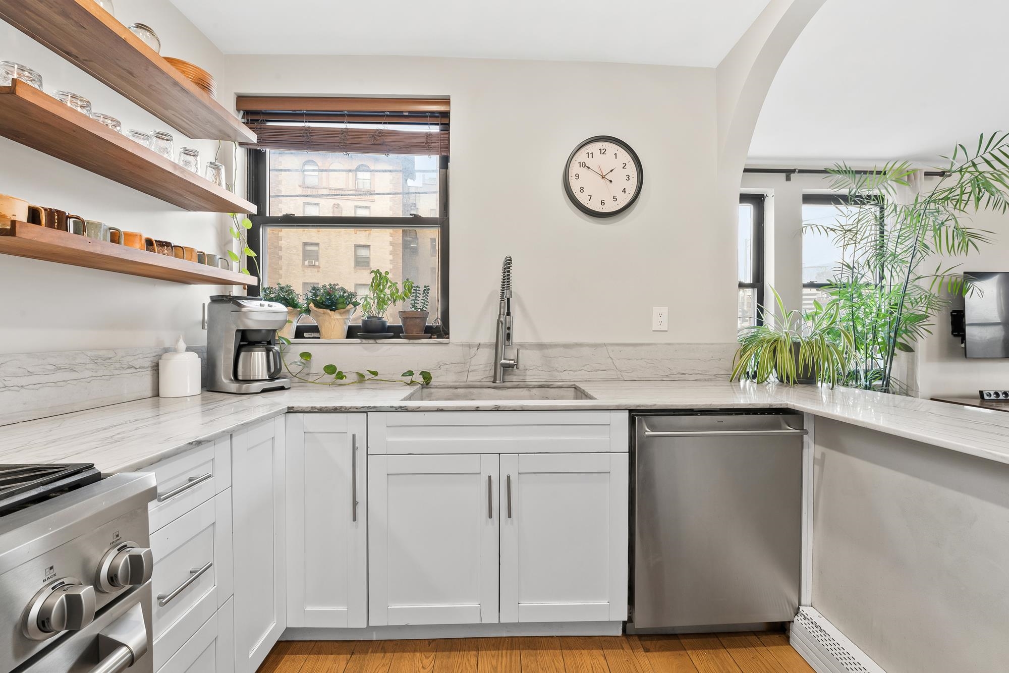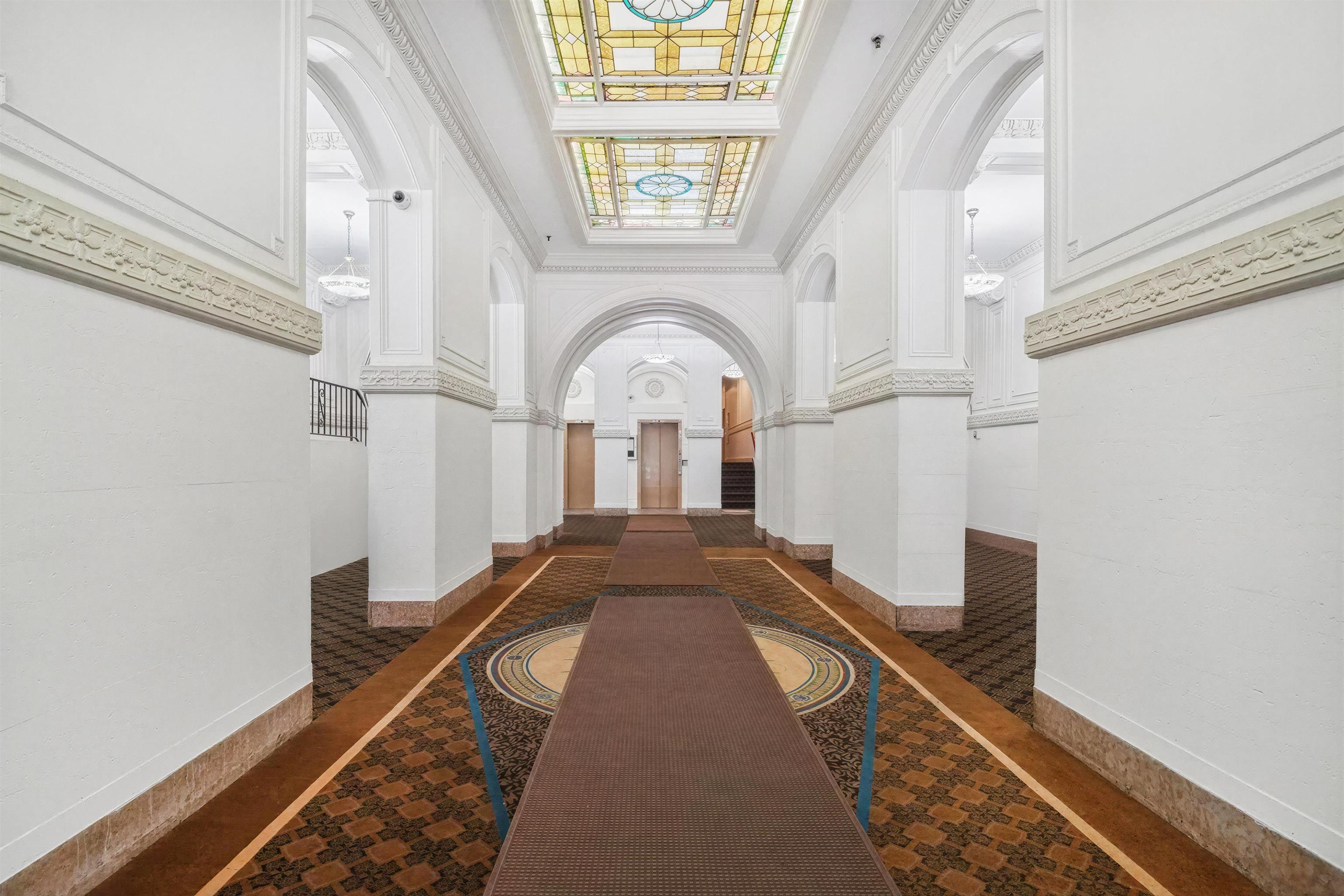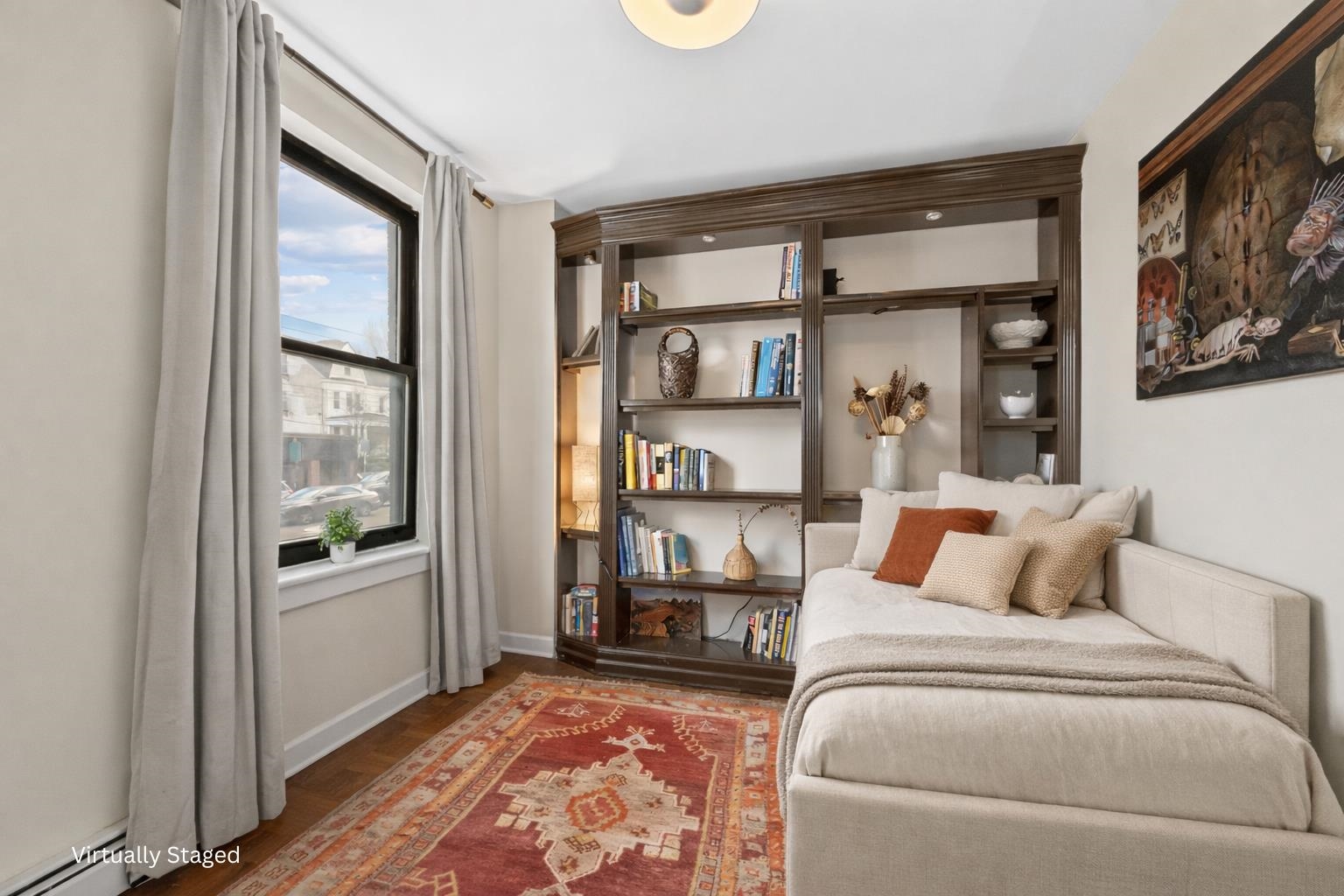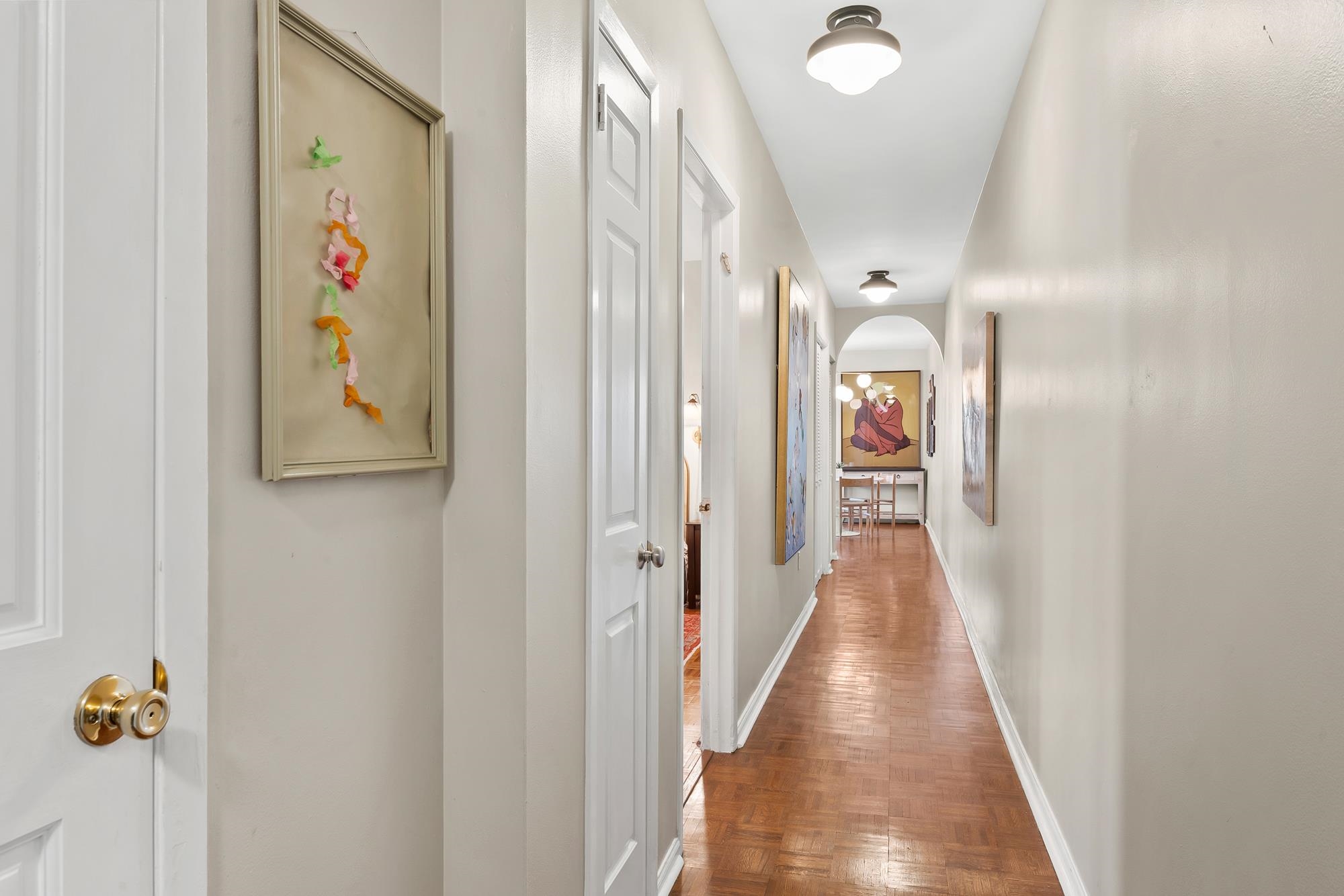 Move right into this expertly designed 3 bedroom (or 2 + den) corner home at the Summit, a grand pre-war building just 2 blocks from Journal Square Path. Masterfully updated by the interior designer-homeowner, this 1200 sq ft condo features oversized living and dining areas, ideal for entertaining, an inviting custom window seat, and floor to ceiling cabinetry. The stunning open kitchen has striking quartzite countertops / breakfast bar and custom 10’’deep quartzite slab sink, with updated stainless appliances, and white shaker cabinetry. The tranquil and generous primary bedroom features a large closet and an en-suite updated bath with new vanity, lighting, and medicine cabinet. The second bedroom easily accommodates a queen bed. The full bath is also newly renovated, with new vanity, medicine cabinet, lighting, and wainscoting. The office / den / 3rd bedroom with French doors, built-in bookcase and new lighting has multiple uses. Custom, thoughtful design touches added throughout: gallery hall entry with custom entry closet and lighting, additional closets, tasteful arches, cabinetry and storage. Original parquet floors. The HOA includes heat, hot & cold water, and cooking gas. The Summit includes many amenities: doorman, elevator, gym, sauna, storage, laundry room, and secure package room. Residences are offered gated assigned parking (currently $180/month). Centrally located for ease of commuting: 2 blocks from the Journal Square PATH, where you’ll pass the brand-new Target, and convenient NYC bus just outside the building. Enjoy the nearby restaurants, grocery stores, and Lincoln Park.