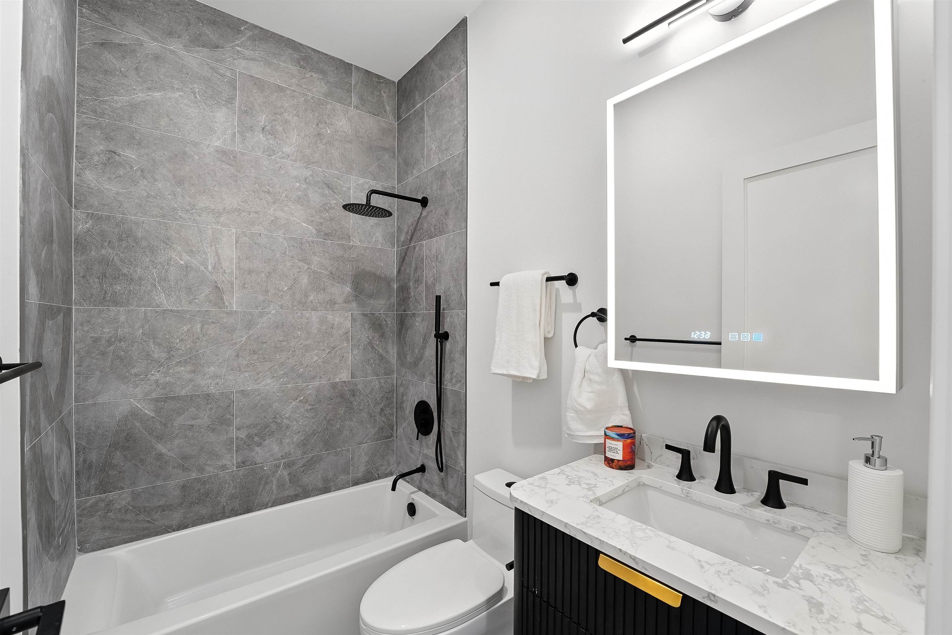 Nestled in the highly sought-after Jersey City Heights neighborhood, this completely reimagined and meticulously redesigned boutique building offers three exceptional units that seamlessly blend elevated luxury with modern convenience—including one year of pre-paid parking. This sun-drenched 3-bedroom, 2.5-bath residence features refined finishes, thoughtful design, and a rare “private” backyard—your own outdoor retreat for peaceful moments away from the city buzz. The timeless red brick façade, complemented by bold black accents, delivers standout curb appeal. Inside, 10-foot ceilings, white oak flooring, recessed lighting, and oversized Andersen windows create a bright and airy living space. At the heart of the home, the chef’s kitchen makes a bold statement with sleek two-tone cabinetry, quartz waterfall countertops and full-height backsplash, pot filler, and a suite of top-of-the-line smart Samsung appliances. Whether for everyday meals or weekend entertaining, this space strikes the perfect balance between form and function. The tranquil primary suite features double closets and a spa-inspired en-suite bath with double vanities, designer fixtures, and a high-end smart toilet. Two additional bedrooms provide flexibility for children, guests, or a home office, served by a stylish full bathroom. Step outside to your private backyard, complete with low-maintenance artificial turf—ideal for grilling, lounging, entertaining, or letting your little ones play. Engineered for energy efficiency and modern comfort, the home includes spray foam insulation, Andersen high-performance windows, and a full fire sprinkler system. Smart home features include a Honeywell thermostat, Ring doorbell, keyless entry, and Wi-Fi–enabled appliances throughout. A dedicated private (14’x6′) storage room on the lower level provides space for bikes, strollers, and any other storage needs. Commuting to NYC is effortless—take the NJ-119 bus to Midtown Manhattan, hop on a Citibike or the NJ-83 bus to Journal Square PATH, or simply enjoy a 15-minute walk to the station. The neighborhood is alive with many local favorites—restaurants, cafes, shops—and beloved green spaces like Pershing Field Park, offering walking trails, multiple sports fields, playgrounds, an ice rink, and a seasonal heated pool. 5-year tax abatement granted.