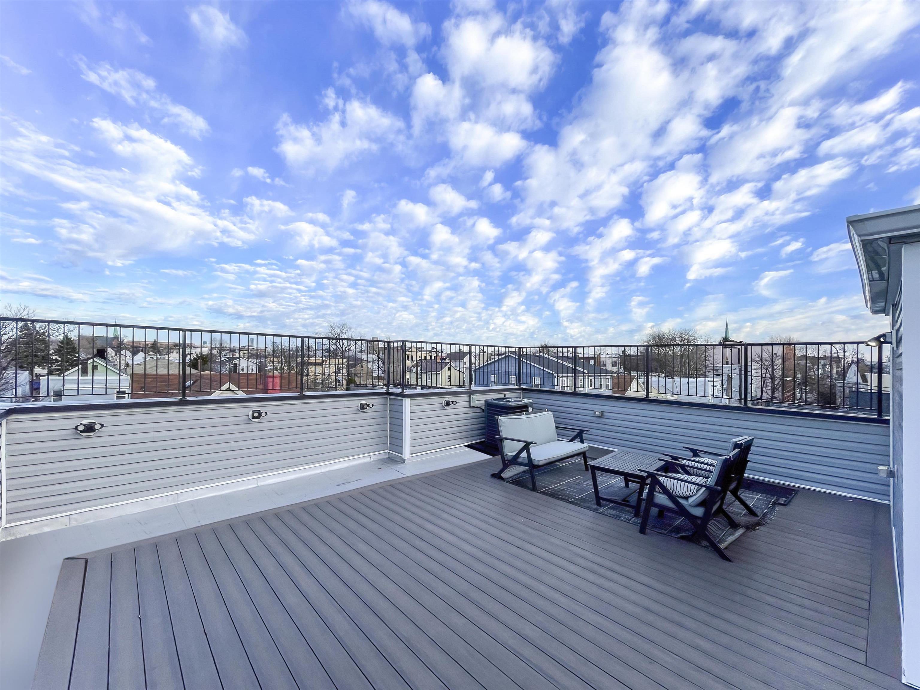PREPARE TO BE WOWED! This stunning, newly crafted unit offers modern luxury and elegant design across two spacious levels, crowned by a private rooftop deck with breathtaking 360-degree panoramic views. Enjoy a bright, airy layout with oversized custom windows, premium flooring, and high-end finishes throughout. The main living area features an open-concept design with a gourmet kitchen equipped with top-of-the-line appliances, multiple sinks, and a convenient powder room. Upstairs, discover 5 generous bedrooms and 3 full baths, including two bedrooms with en suite baths. A private balcony off one bedroom delivers stunning views, and laundry is conveniently located on this floor. Additional features include high-efficiency appliances, abundant storage, and access to a shared fenced backyard perfect for outdoor enjoyment. Located near bus lines, JFK Blvd, I-78, parks, shops, and restaurants, this home is perfect for today’s modern lifestyle. Don’t miss your chance to own this one-of-a-kind residence schedule your private tour today!