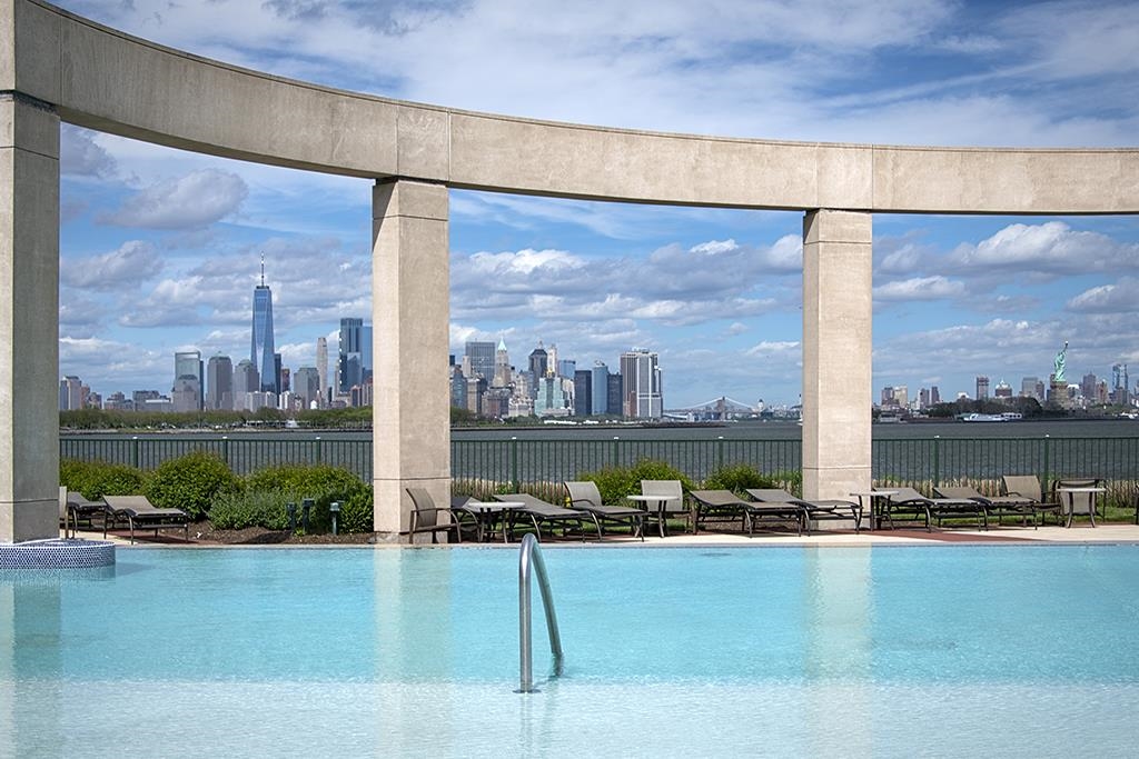 Top Floor 2 Bedroom with NYC Views located on landscaped park! Bright & spacious modern two bedroom, two bath condo with garage parking included. Make this your own! Features NYC and landscaped park views! Large living/dining room will accommodate your full sized furnishings and offers gleaming hardwood flooring and opens to private balcony. The perfect space for relaxation with your morning coffee while you catch up on your emails. Spacious kitchen offers granite counters, stainless steel appliances, cherry cabinetry and generous granite workspaces. Large primary suite offers walk-in closet. The primary bath with deep soaking tub, separate shower, dual vanity, warm toned marble and even a linen closet! Generous sized second bedroom with ample closet and hallway modern tiled second bath. Home offers a full sized washer/washer and garage parking. Easy NYC commute with on-site ferry service to NYC and on-site shuttle service to the Grove St. Path. Port Liberte offers wonderful amenities and they include: 24 hour gated security, tot lot, professional gym, tennis/basketball courts, waterfront promenades, two resort style pools and a dog run. Must See!