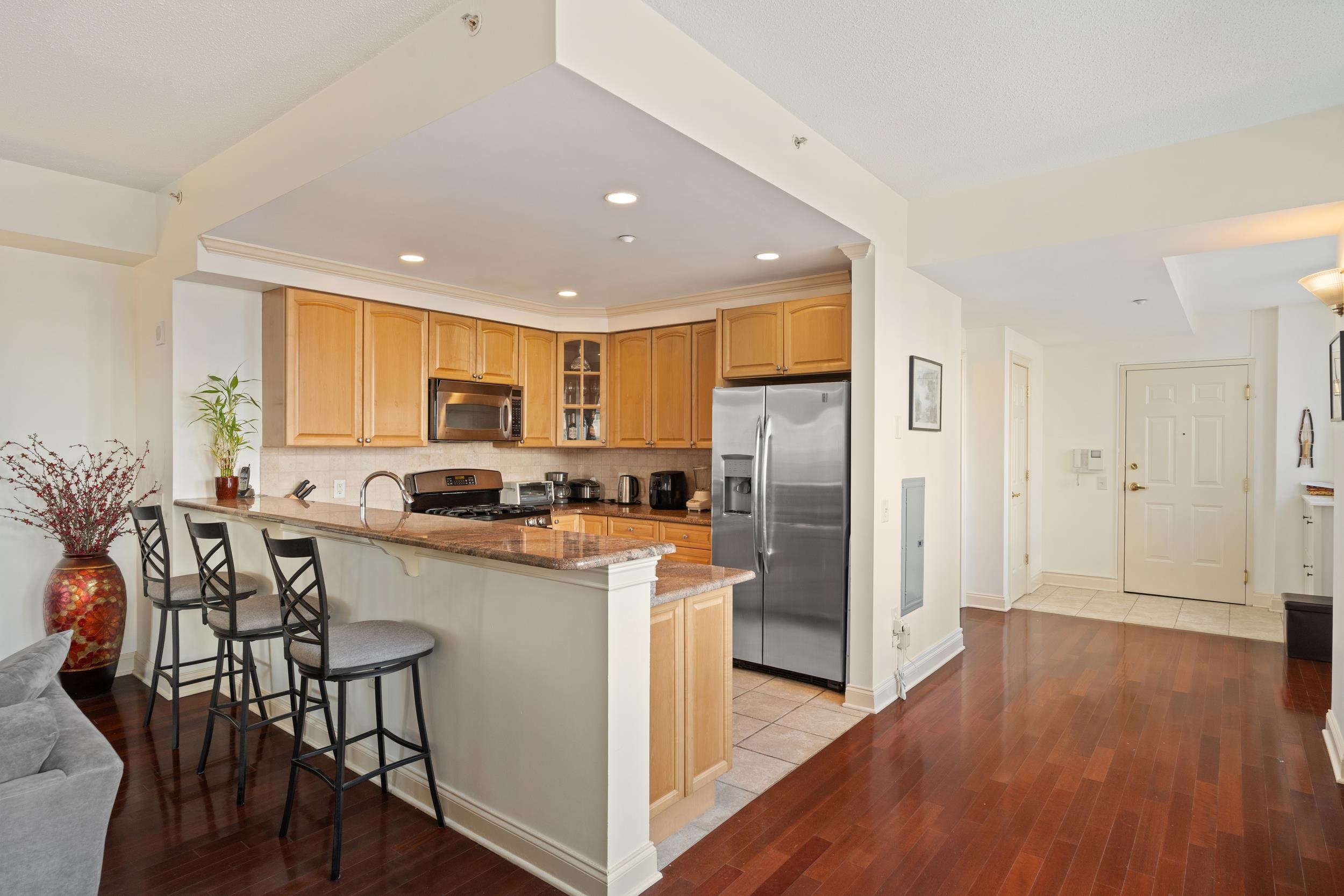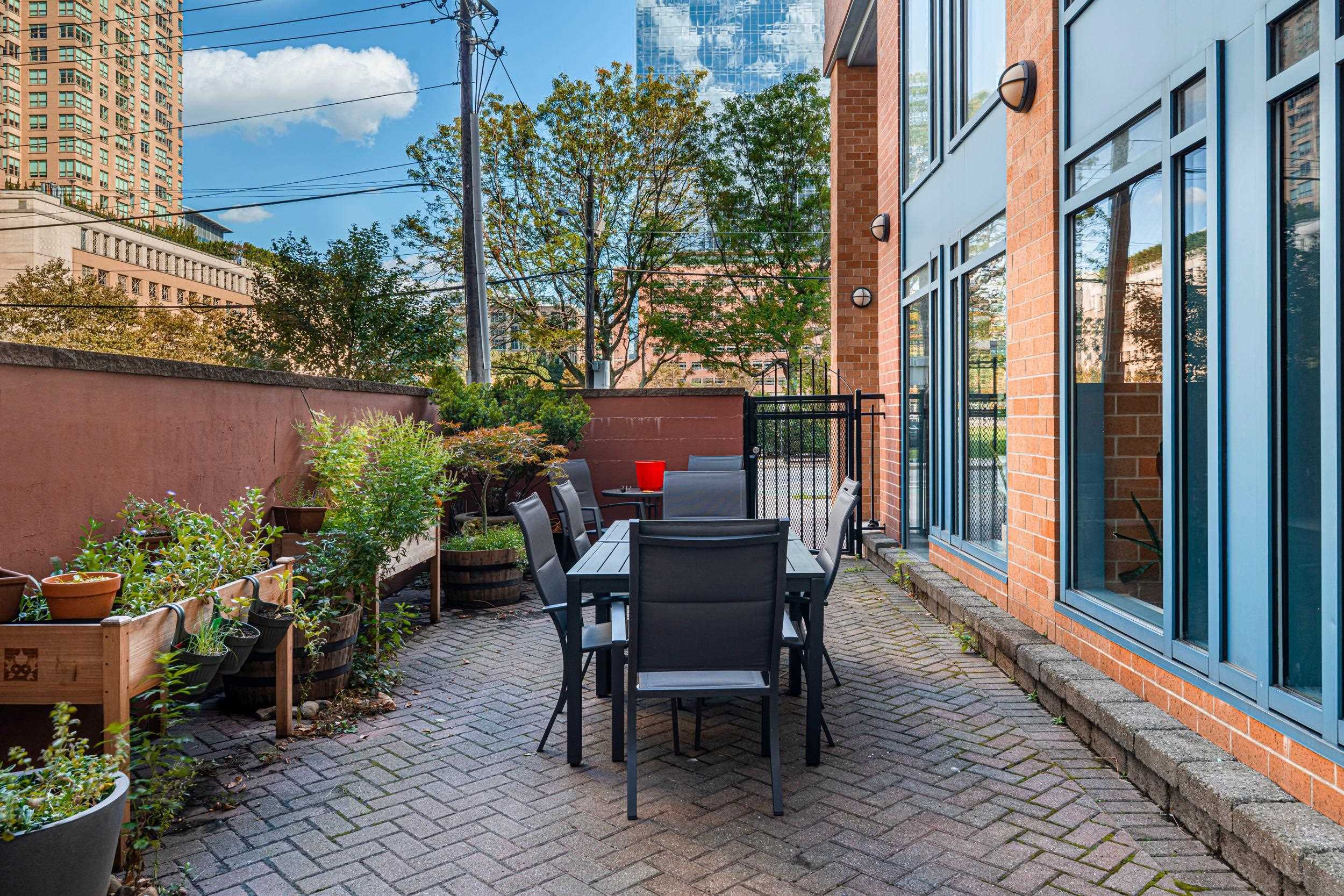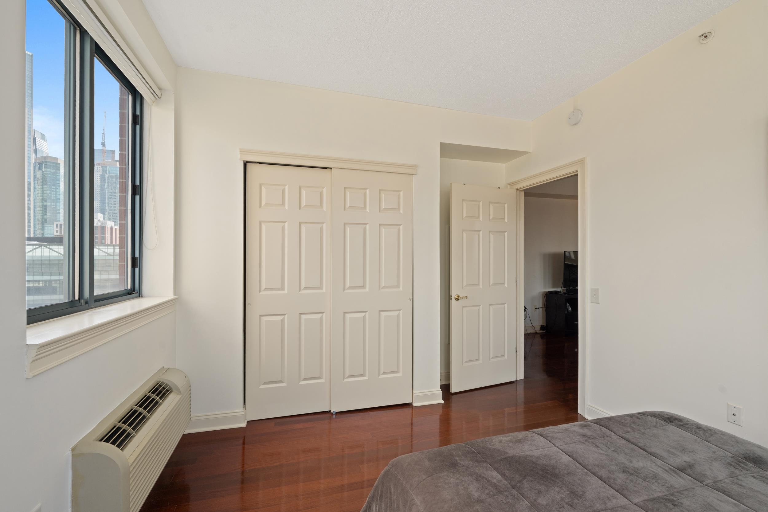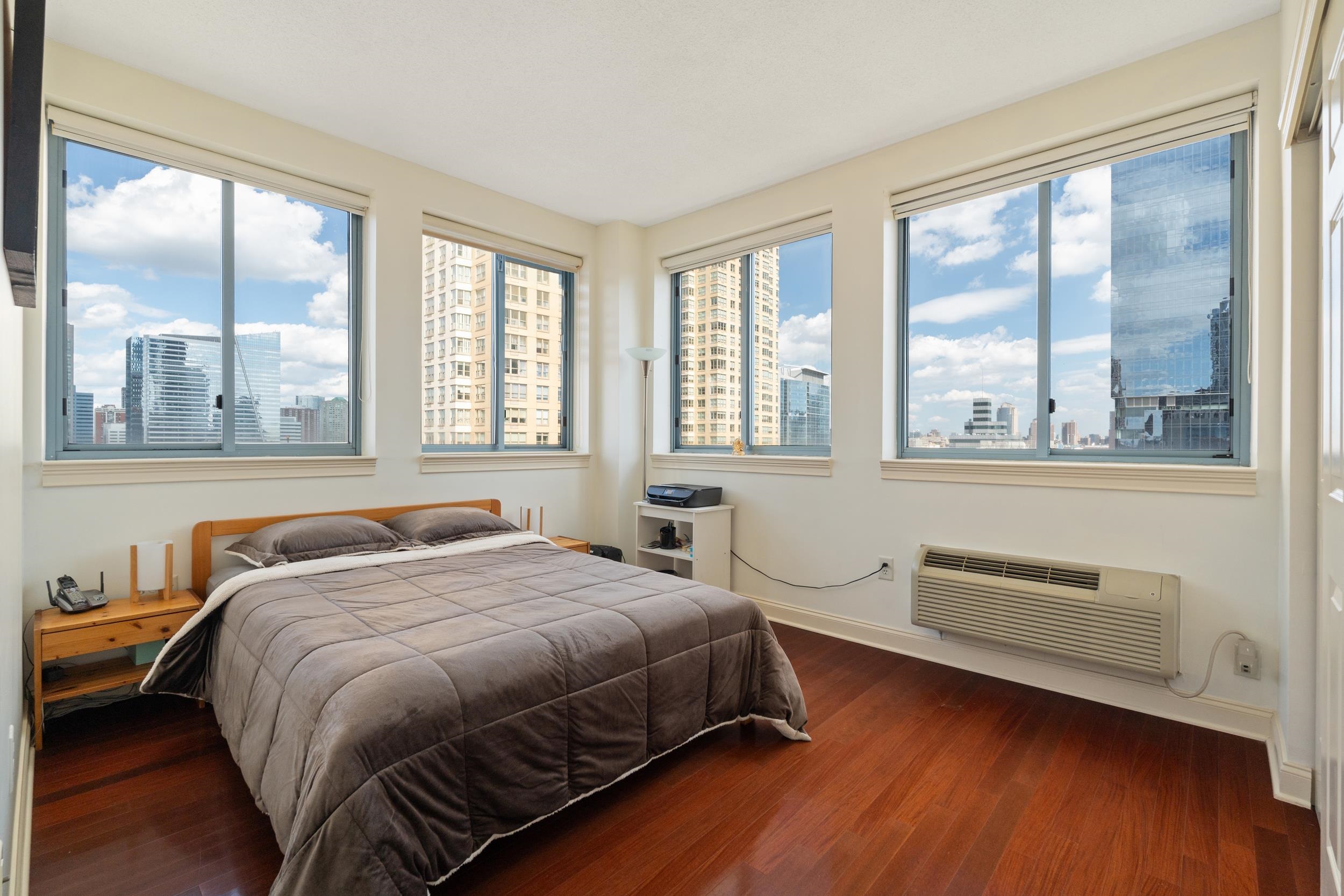 Simply outstanding, this 2 bedroom, 2 bathroom corner unit offers a front-row seat to the glittering NYC skyline from one of Downtown Jersey City’s most convenient buildings. Large windows flood the space with natural light and highlight the beautiful view. Gleaming hardwood floors flow throughout, creating a warm yet modern vibe. The open kitchen with breakfast bar seamlessly connects to the spacious living and dining area, making entertaining both stylish and effortless. The primary suite is a true retreat, boasting generous closet space and a private full bath designed for comfort and relaxation. A large second bedroom and equally spacious second full bathroom provide versatility for guests, a home office, or both. The building delivers a luxury lifestyle with a doorman, fully equipped gym, onsite parking, and a serene common courtyard. Perfectly positioned, you’re just moments away from the PATH, Light Rail, vibrant dining, shopping, and nightlife—putting all of Jersey City and Manhattan within easy reach.
