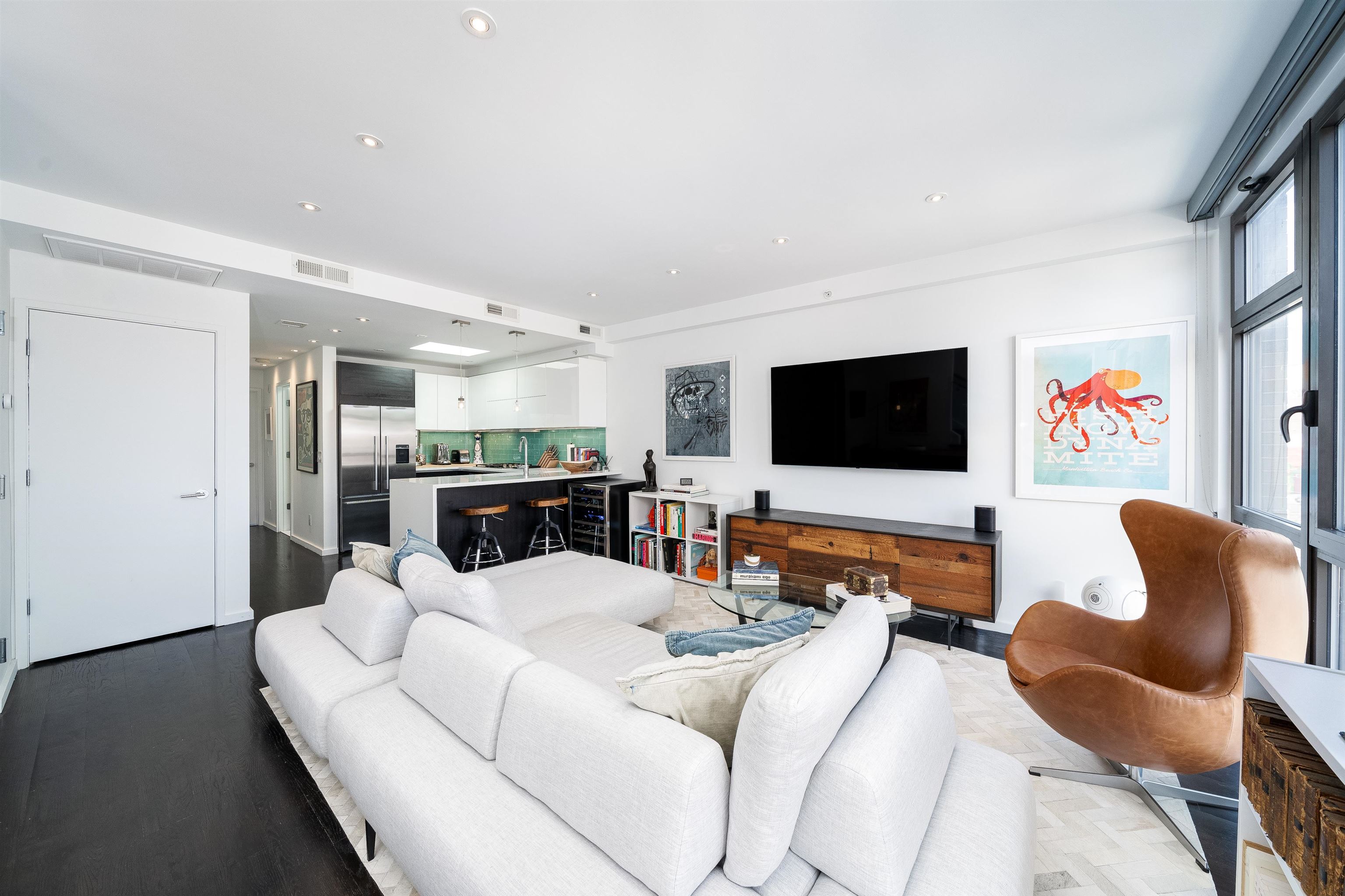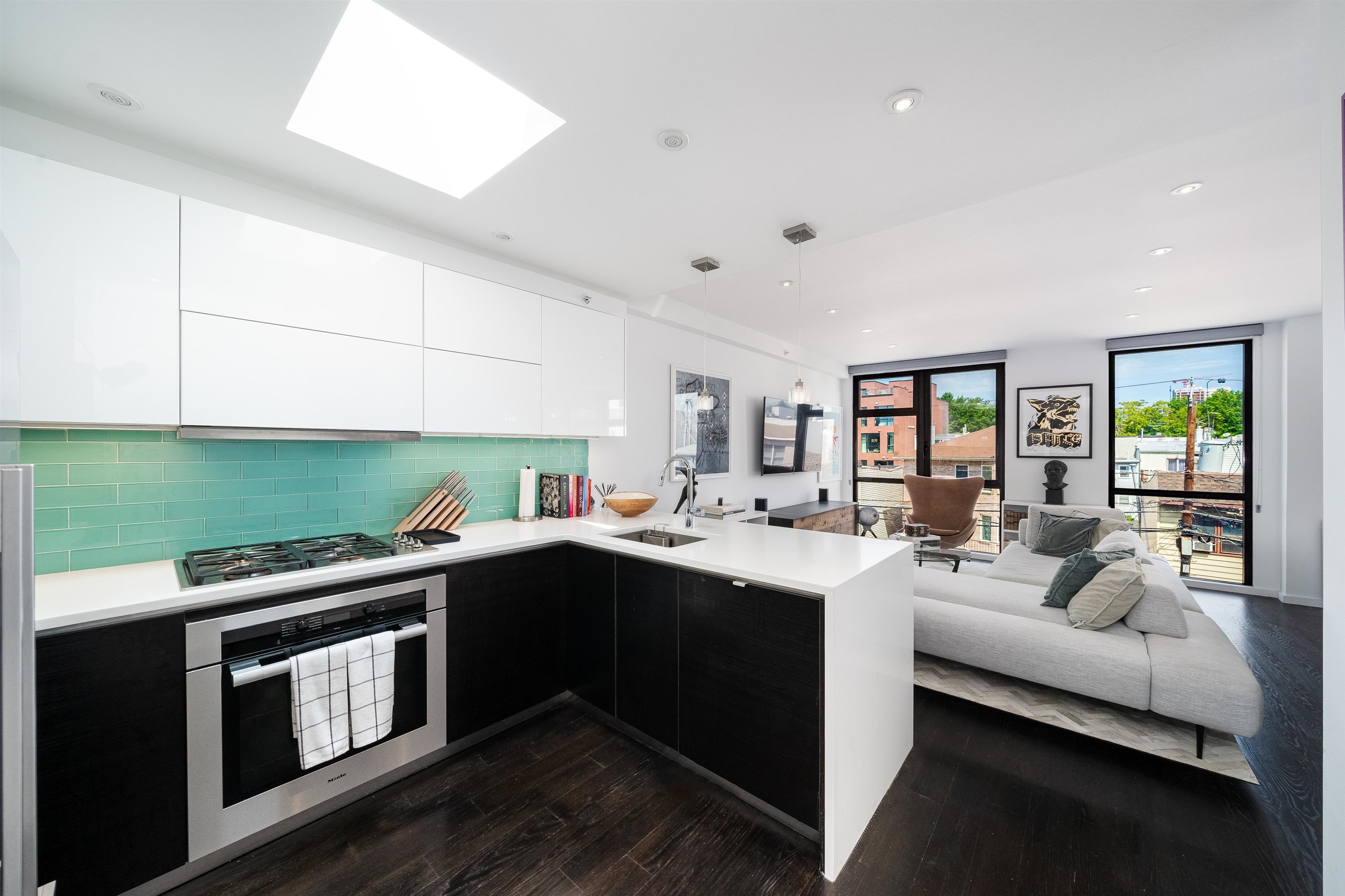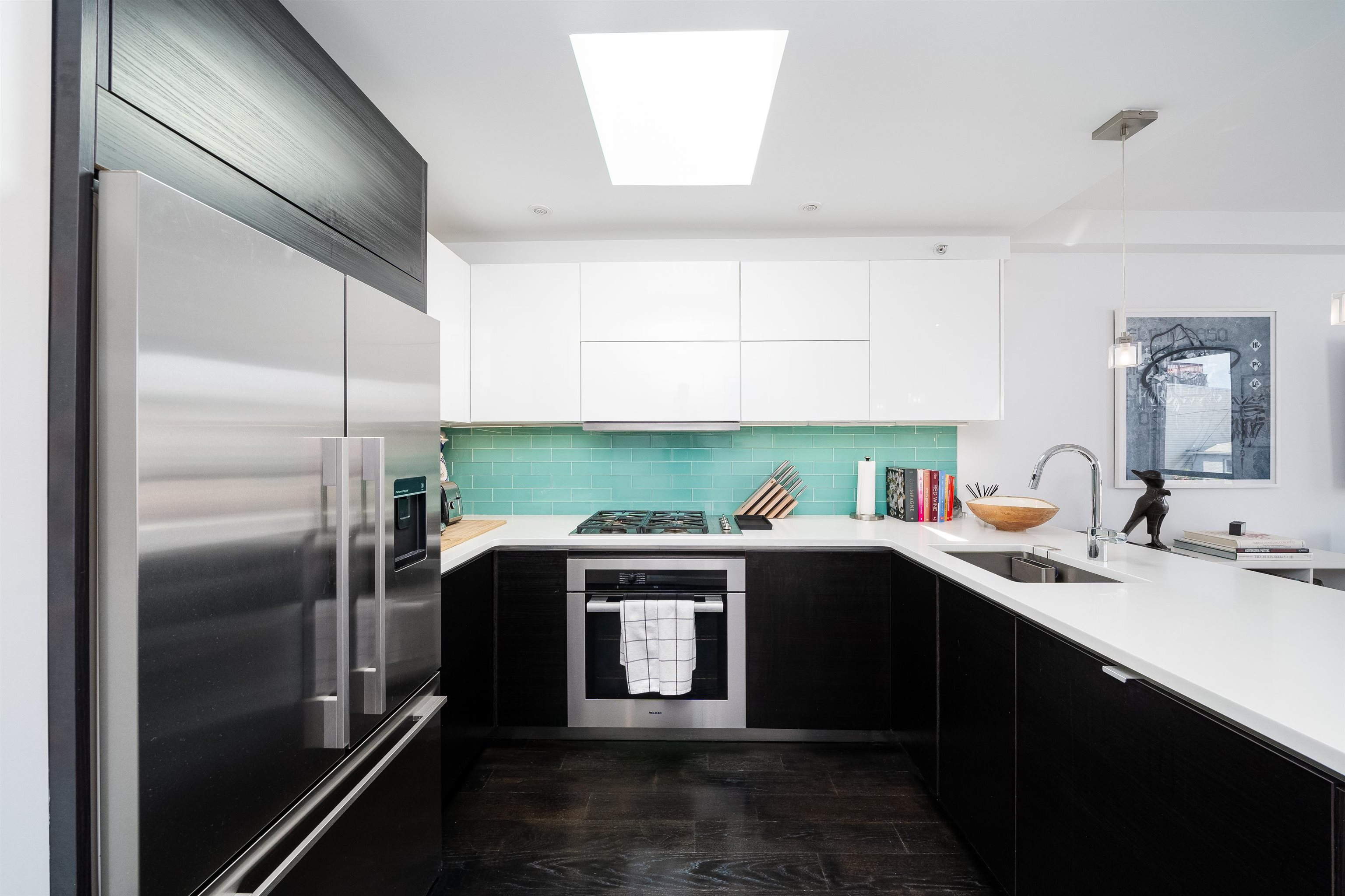 Beautifully designed 2BR/2BA condo featuring a fully furnished 900+ sq. ft. private roof deck. Modern kitchen with Fisher & Paykel, Miele, and Bosch appliances, waterfall quartz counters, and custom cabinetry under large skylights. Bright open living/dining area with floor-to-ceiling windows. Interior stairs lead to a private rooftop oasis with dining and lounge areas. Primary suite includes a walk-in closet, dual-vanity bath, and soaking tub. Second bedroom with large windows and ample closet space. Additional features include central A/C, hardwood floors throughout and in-unit washer/dryer.