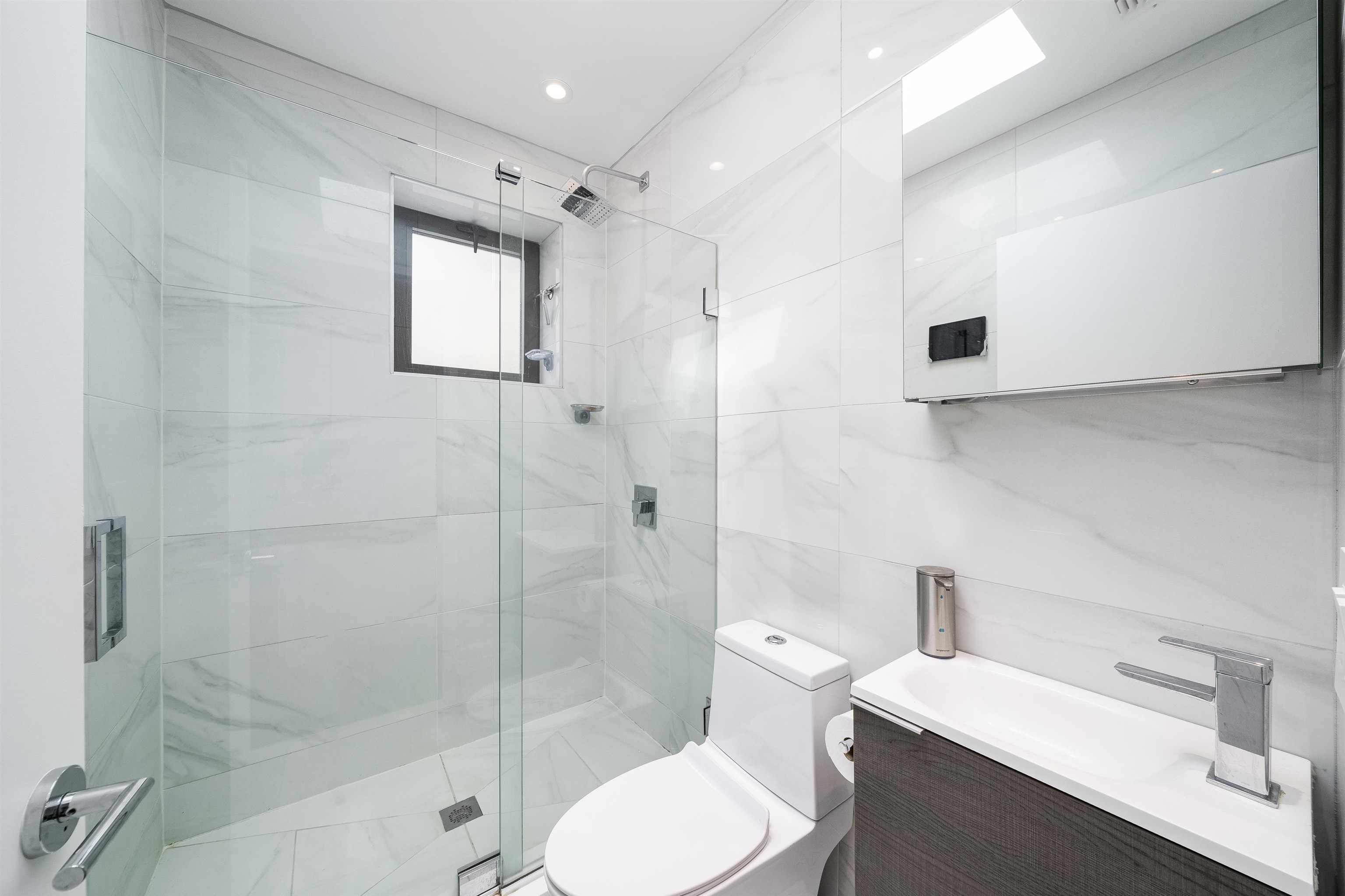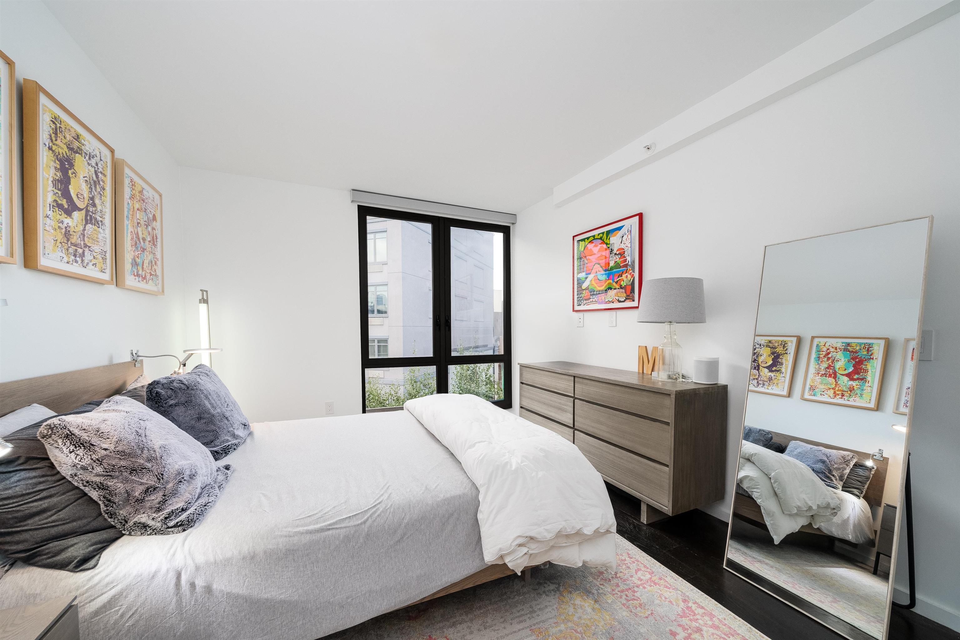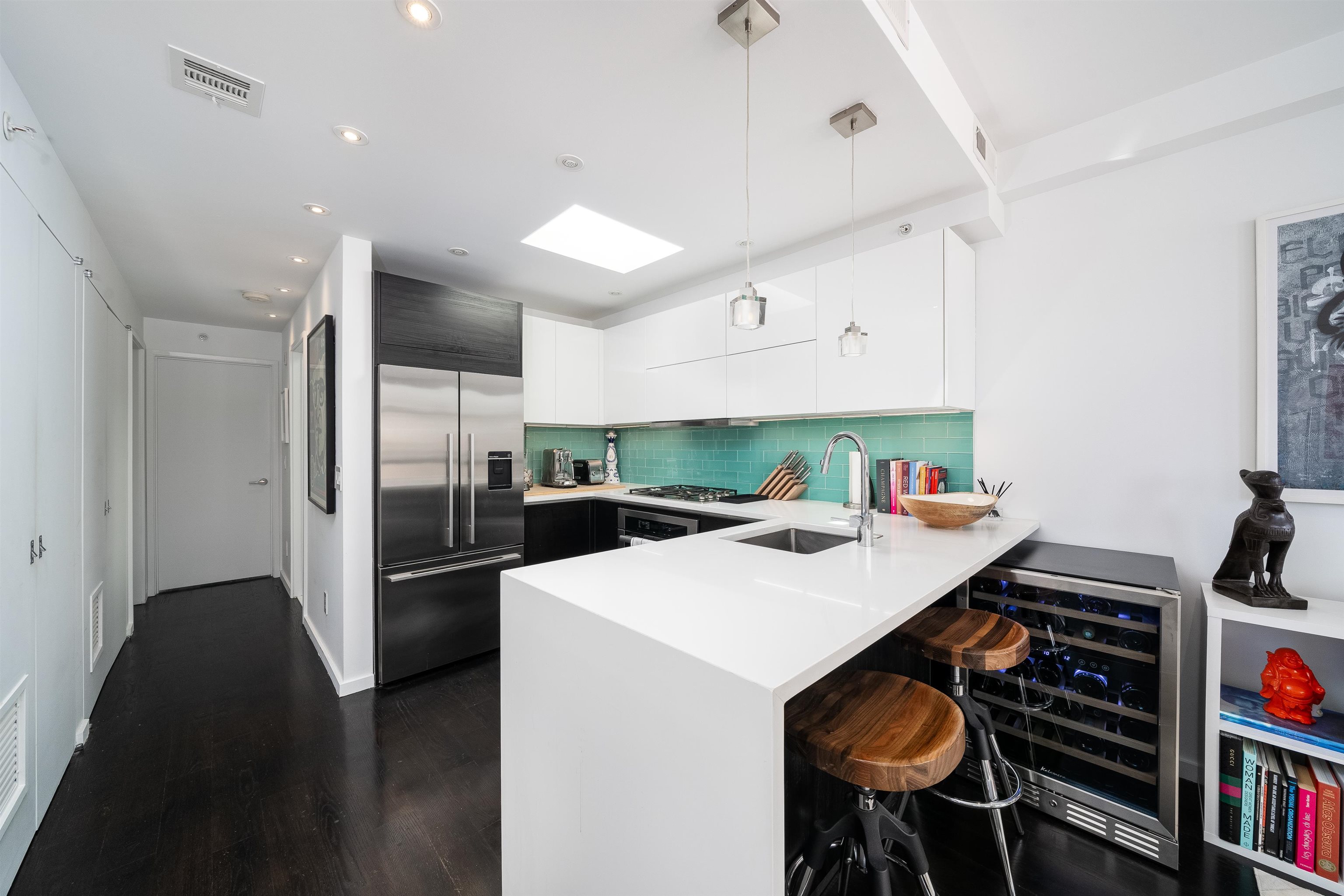 Beautifully designed 2BR/2BA condo featuring a fully furnished 900+ sq. ft. private roof deck. Modern kitchen with Fisher & Paykel, Miele, and Bosch appliances, waterfall quartz counters, and custom cabinetry under large skylights. Bright open living/dining area with floor-to-ceiling windows. Interior stairs lead to a private rooftop oasis with dining and lounge areas. Primary suite includes a walk-in closet, dual-vanity bath, and soaking tub. Second bedroom with large windows and ample closet space. Additional features include central A/C, hardwood floors throughout and in-unit washer/dryer.