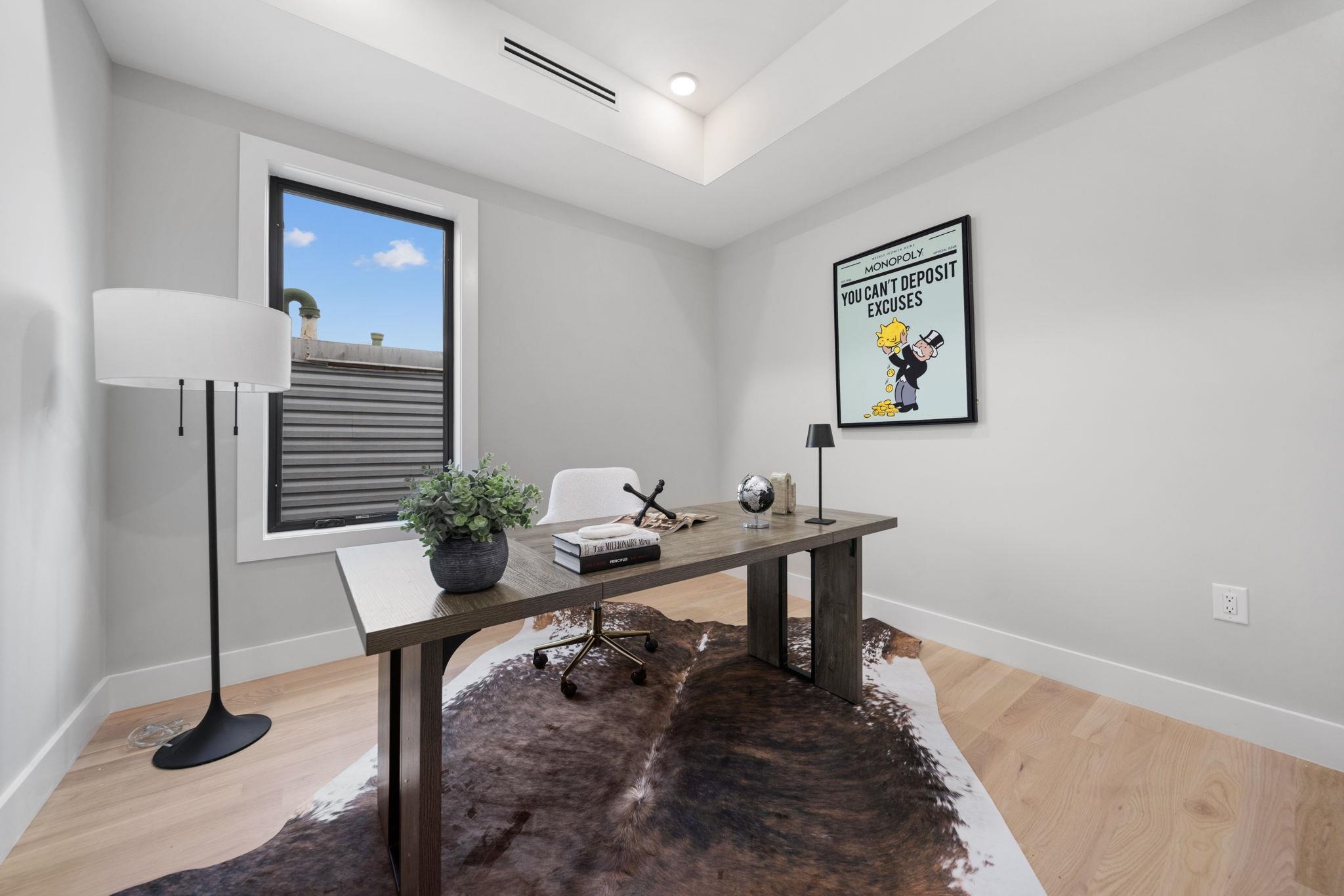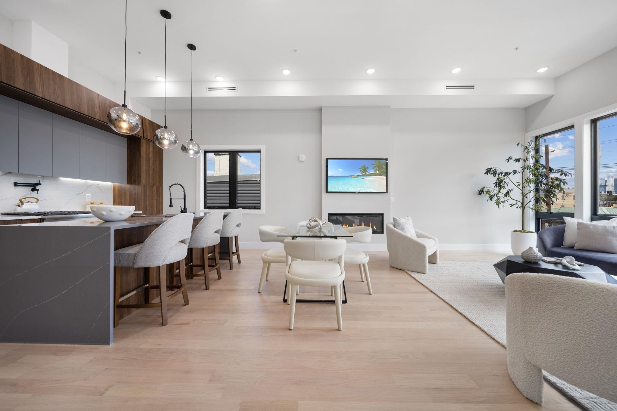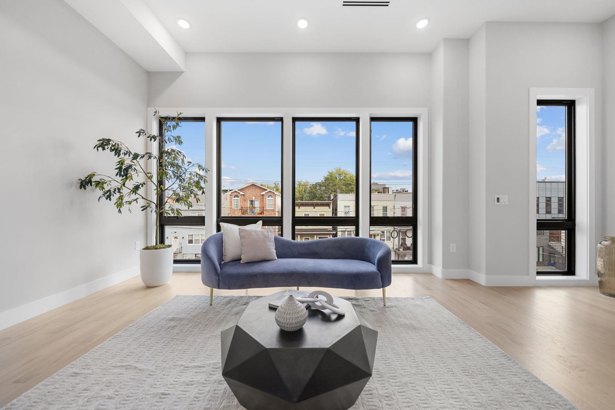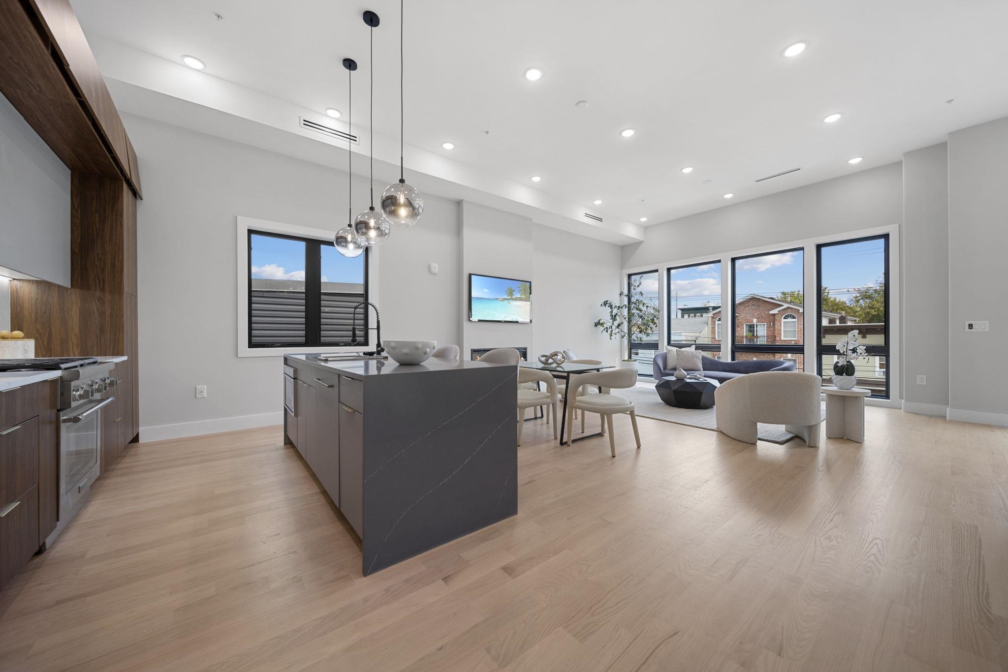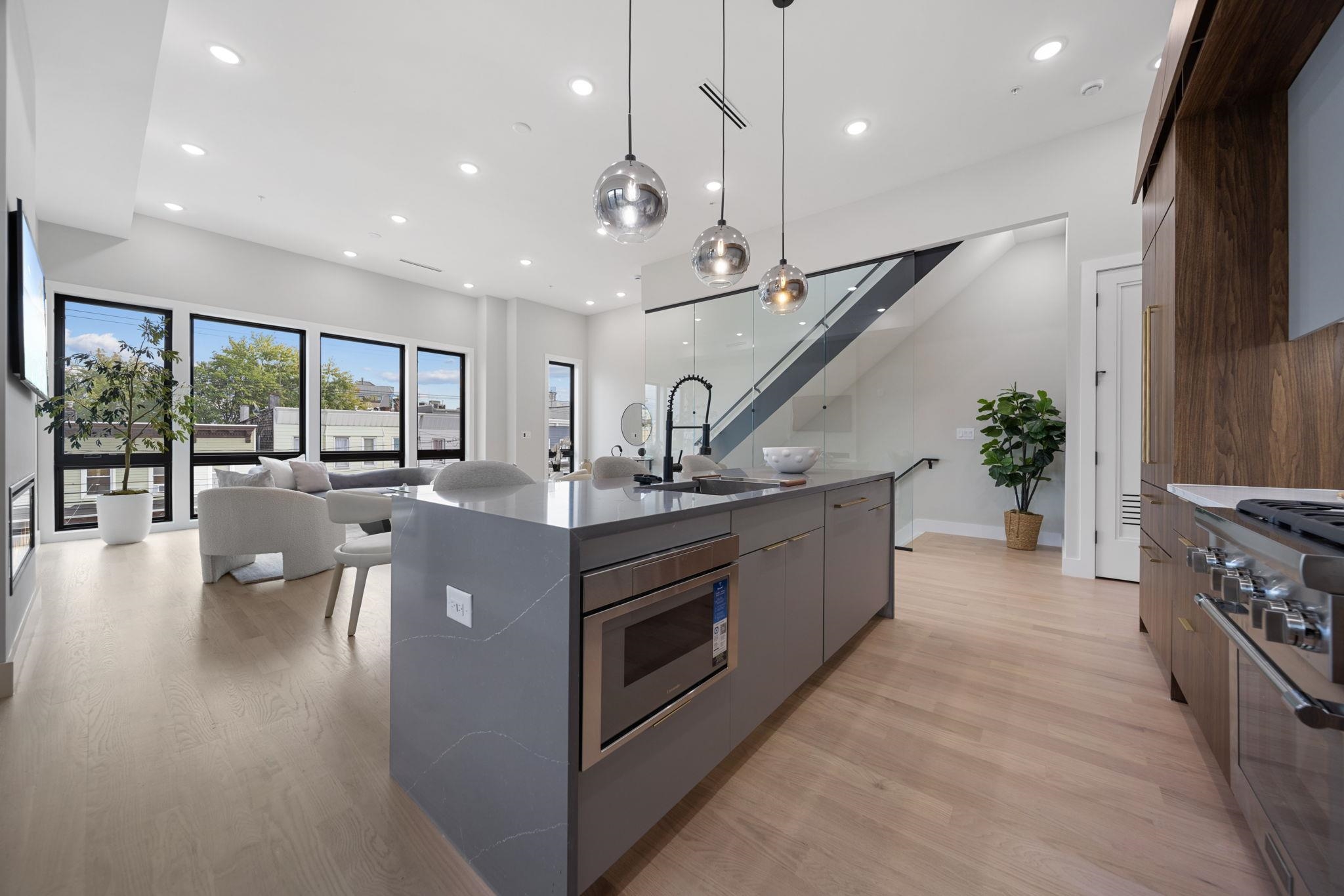 MOMENTS FROM CONGRESS ST LIGHT RAIL STATION AND RIVERVIEW FISK PARK. Welcome to 373 New York Avenue, Jersey City — Blue Chip Properties’ most iconic and sought-after project to date. This stunning 3-bedroom, 2-bathroom duplex home is located in the highly desirable New York Avenue enclave, known for its close proximity to the 9th Street Light Rail, Riverview-Fisk Park, Hoboken, and the gourmet dining scene of Palisade Avenue. Designed with timeless interior finishes, high-end fixtures, and meticulous craftsmanship, this residence also offers cutting-edge modern technology for elevated daily living. The main level opens to a grand open-concept dining and living area with soaring 12-foot ceilings, oversized Andersen energy-efficient windows, a floor-to-ceiling tempered glass accent wall, abundant natural light, and a statement-making realistic flame fireplace. The chef’s kitchen is outfitted with designer two-tone cabinetry, Thermador appliance package with paneled refrigerator and dishwasher, 5 burner range, and heating drawer. The oversized double waterfall quartz island showcases luxurious West Elm accent lighting, along with porcelain backsplash with a convenient Pot Filler, and an externally vented hood. The primary suite is a serene retreat featuring custom warm wood-tone millwork, bedside pendant lighting, a walk-in closet with built-ins, and a private balcony with tree-lined views. The spa-like ensuite bath showcases modern natural tones, an oversized double vanity, soaking tub, warm pendant lighting, and a luxurious shower with multiple Kohler body sprays and rainfall showerhead. The two additional bedrooms include custom-finished closets and share a beautifully appointed full bath with double vanity and floor-to-ceiling tiles. A separate laundry room with top-of-the-line washer and dryer completes the main level. Upstairs, a recessed lit staircase with a glass accent wall leads to an upper-level entertainment zone featuring a wet bar with custom cabinetry, backlit designer backsplash, and wine fridge. Step outside to your expansive rooftop with some of the best NYC skyline views in The Heights, complete with premium astroturf and Trex decking, gas, electric, and water hookups — ideal for entertaining. This fully equipped smart home includes a Google Nest doorbell, security cameras, Google Smart Hub, smart thermostat, touchscreen light switches, dimmers, and more — all seamlessly controlled via smartphone, along with a security camera system. The home is completed with Blue Chip Properties’ signature exterior facade and professional landscaping. Property includes a 10-year builder’s warranty and a 5-year Tax Abatement. Square footage is approximate. Offsite parking available, inquire for further details.