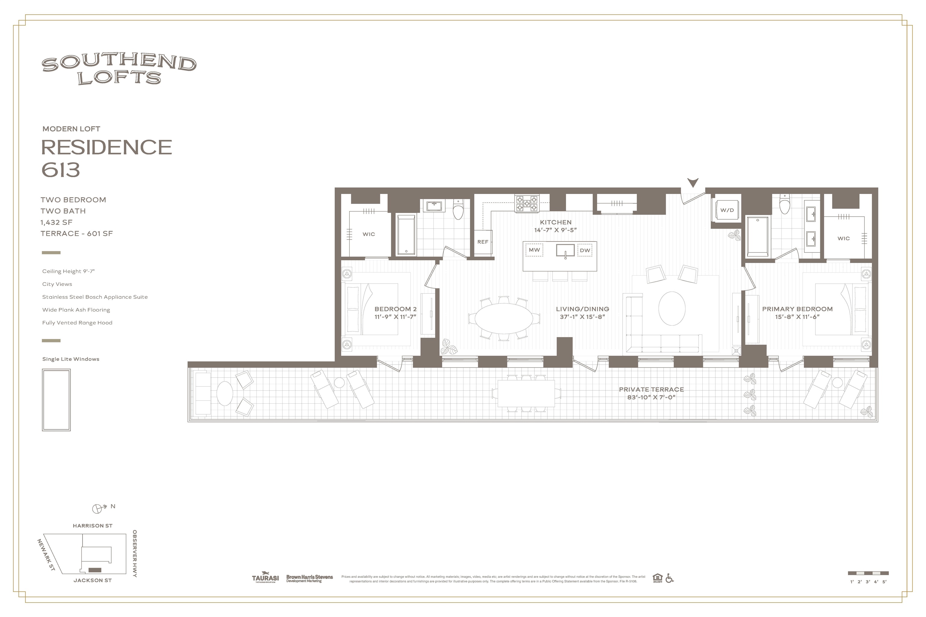 Two Bed with Terrace and Iconic Views Residence 613 is a one-of-a-kind split two-bedroom, two-bath home with a separate dining area and an extraordinary 83-foot-long terrace accessible from every room, offering breathtaking views of the Manhattan skyline. The east-facing exposure and oversized windows fill the home with abundant natural light throughout the day and frame spectacular city views at night. The custom kitchen features abundant storage, Calacatta Valentin countertops and backsplash, and a suite of Bosch stainless steel appliances, including a vented range hood, microwave drawer, and dishwasher. The primary suite boasts a massive walk-in closet and a luxurious four-fixture primary bath adorned with Calacatta Lucca wall and floor tiles, a Duravit soaking tub/shower, and a double vanity with white quartz countertop, Kohler sinks, and distinctive pill-shaped mirrors with integrated lighting. Wide plank ash wood floors, high-performance VRF heating and cooling, an LG washer, and a state-of-the-art heat pump dryer complete the exceptional finish package of this brand-new home. Southend Lofts features 1 – 5 bedroom newly built condominiums offering over 20,000 square feet of amenities including a massive roof garden with incredible Manhattan Views, a 40′ pool, BBQ stations, recreation area and lounging, 24 hour attended lobby, fitness center, co-working areas, a Golf and Multi Sports Simulator and Children’s Playroom. Indoor parking available at an additional cost. Exclusive Sales and Marketing Agent: Brown Harris Stevens Development Marketing. The complete offering terms are in a Public Offering Statement available from the Sponsor. File R-5108. Equal Housing Opportunity