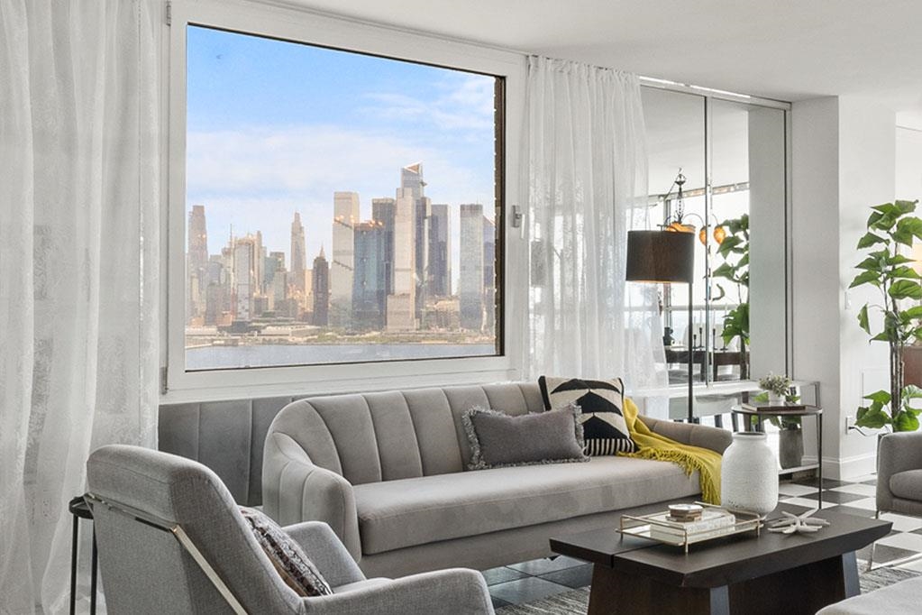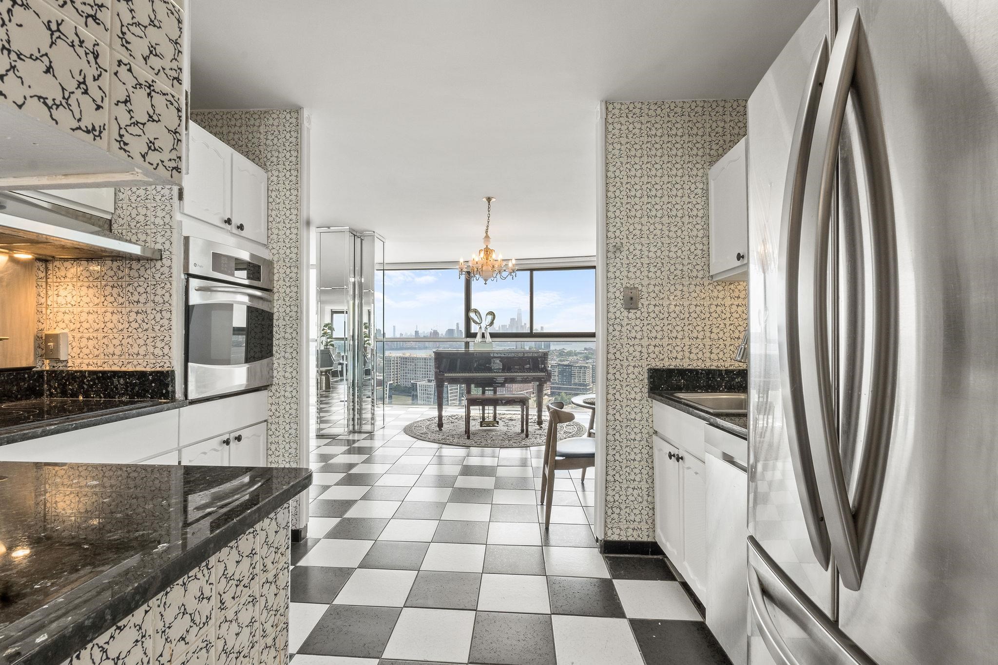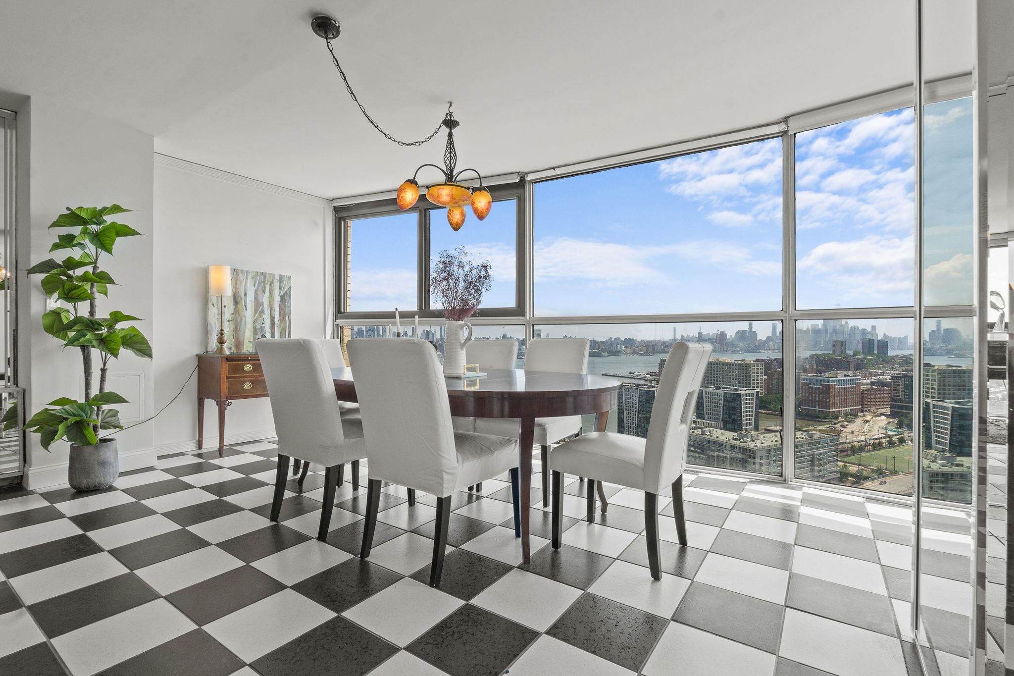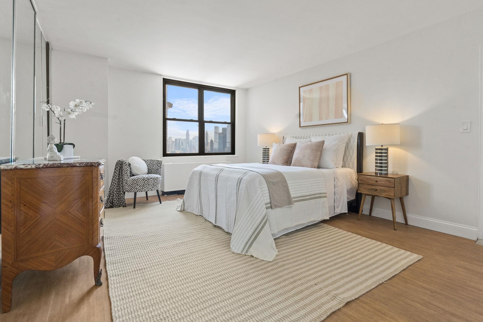 One of the most desired and largest corner layouts and prime location in the building, this unit faces both midtown and downtown Manhattan from its 11th floor cliff-top perch, more than 30 stories above the Hudson River and eye level with the magnificent skyscrapers of Hudson Yards. Sprawling and flooded with light, this unit is ready for move-in yet priced to redesign to your discriminating taste. Maintenance includes real estate taxes, ALL utilities, internet and cable TV service with HBO/Max included. The efficient kitchen has open access to a huge living/dining area; you’ll have plenty of room to roam and be captivated by panoramic city and river views from expansive window wall and dual-exposure postcard views of the Hudson River and New York City. Mirrored walls expand the magic of every moment in your “VIP box seats” to the never-ending fascination of city sunrises, brilliant sunsets, and glittering lights of the magnificent Manhattan skyline. The primary bedroom is the largest in Troy Towers, with en suite bathroom, dressing area and two semi-walk-in closets. Storage is generous throughout with five additional closets, and a large entry foyer adds grace and privacy for your daily greetings. Troy Towers is a well-built, well-maintained vintage hi-rise, the best value and best world class NYC views on the Hudson. The building is undergoing fully budgeted upgrades of the elevators, lobby level, selected exterior enhancements and magnificent pool area with proposed build-out beneath to create exciting new building amenities in the coming years. Note, initial purchases must be owner-occupied for a minimum of two years. Square footage quotes are not provided by the building, so estimated quotes for comparable units may be inconsistent or inaccurate. Please request original floor plans for comparisons. Troy Towers allows one dog per apartment. Garage parking, bike storage, and gym memberships are readily available for very reasonable fees. Ask to see!