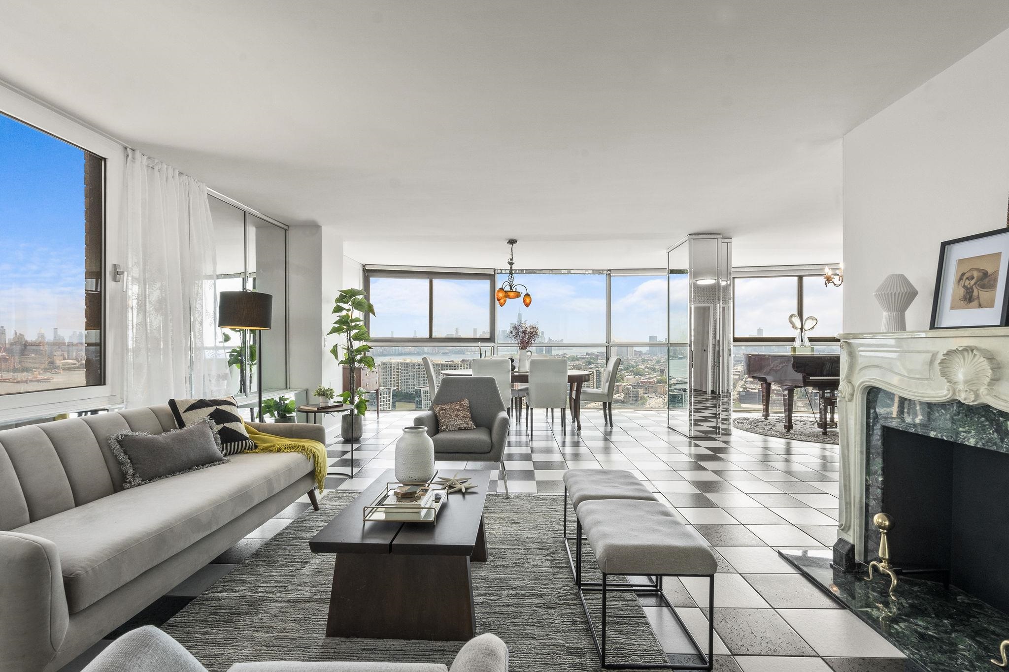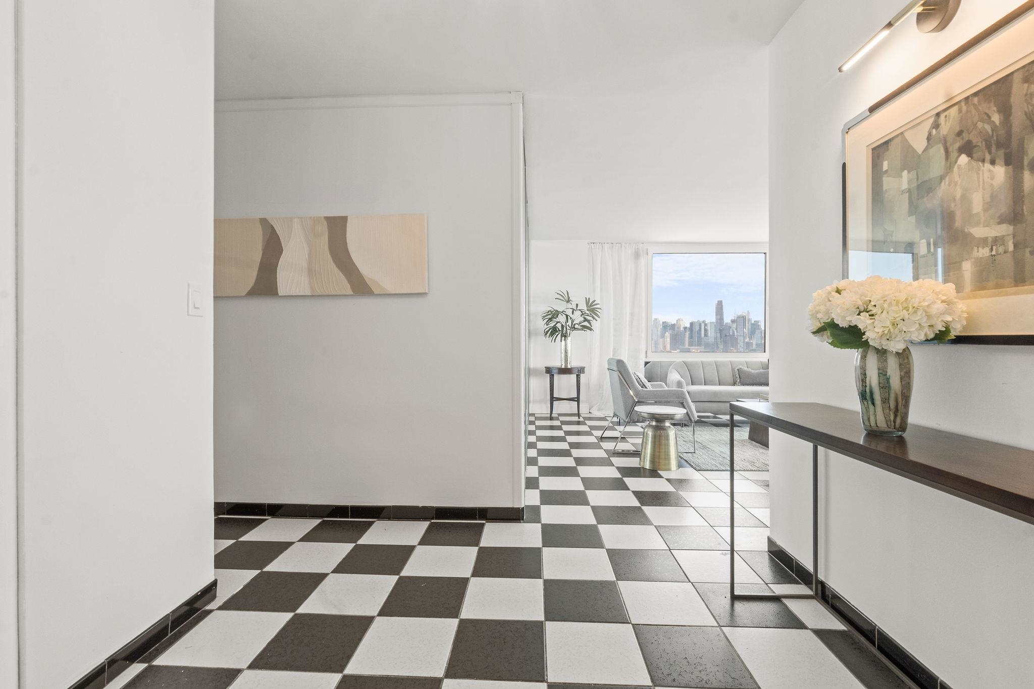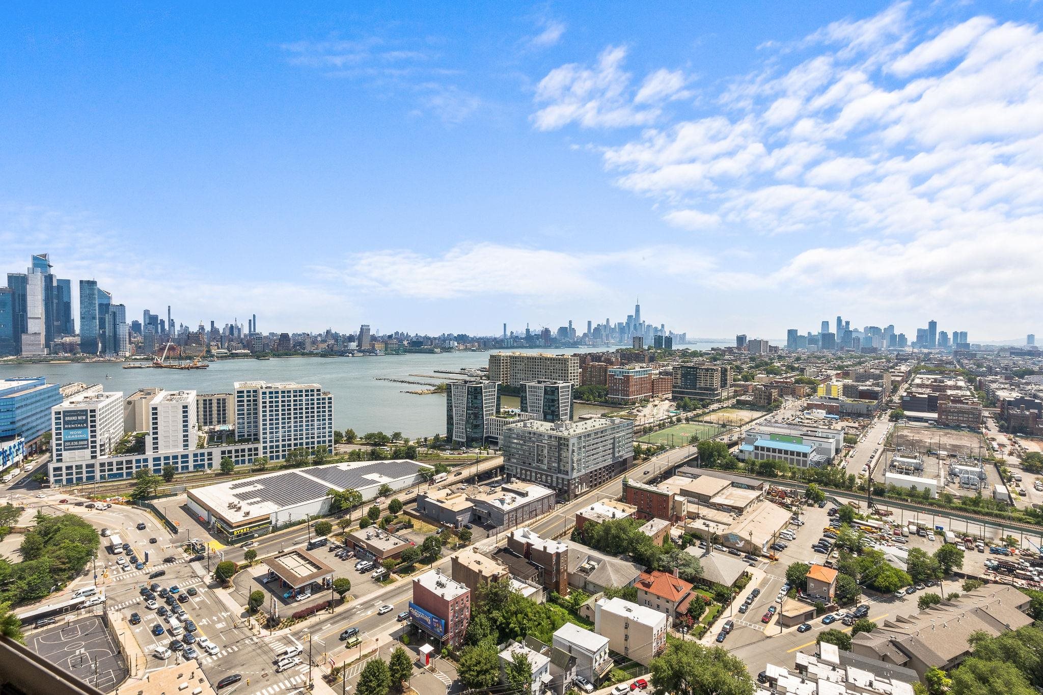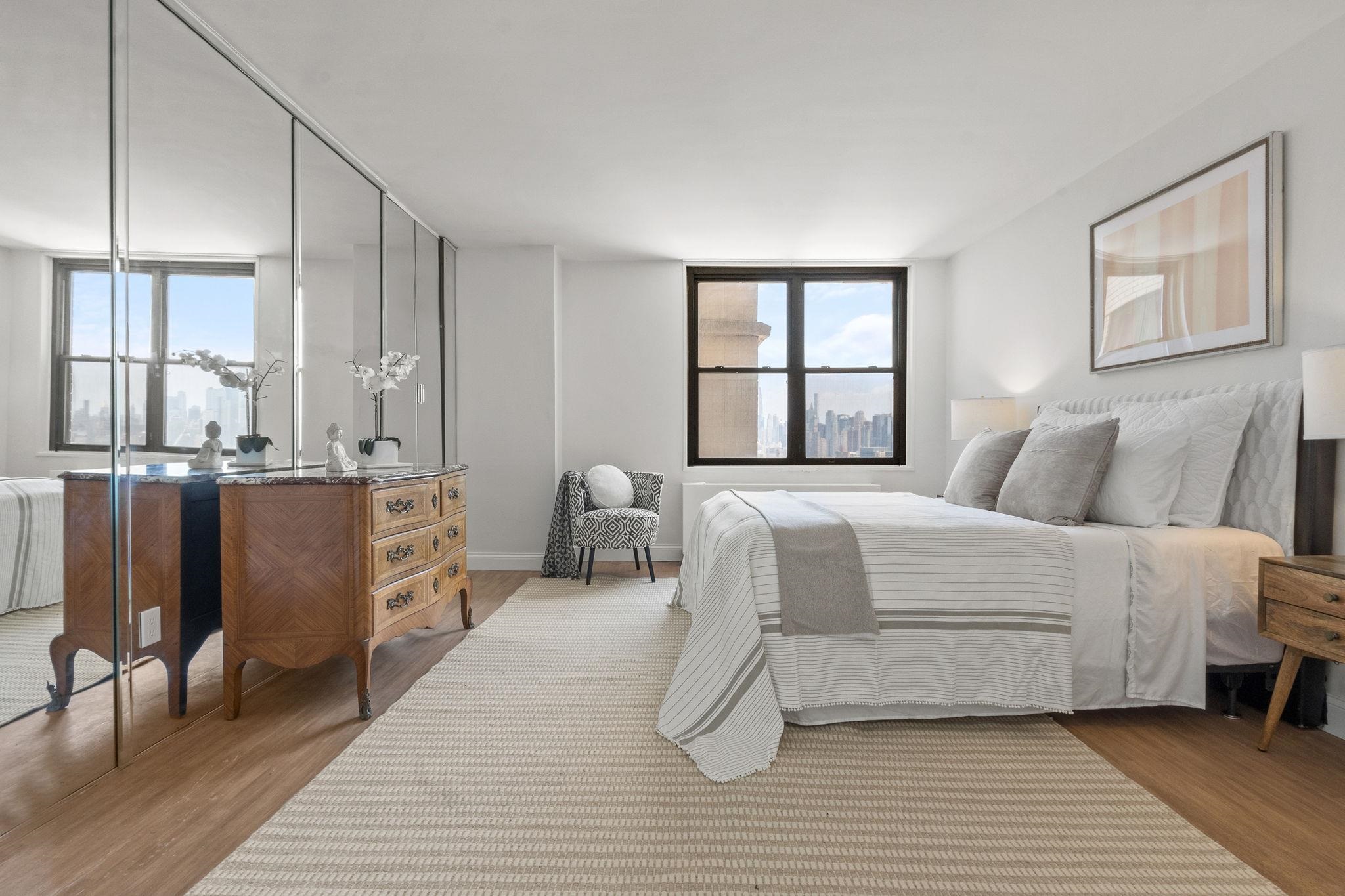 One of the most desired and largest corner layouts and prime location in the building, this unit faces both midtown and downtown Manhattan from its 11th floor cliff-top perch, more than 30 stories above the Hudson River and eye level with the magnificent skyscrapers of Hudson Yards. Sprawling and flooded with light, this unit is ready for move-in yet priced to redesign to your discriminating taste. Maintenance includes real estate taxes, ALL utilities, internet and cable TV service with HBO/Max included. The efficient kitchen has open access to a huge living/dining area; you’ll have plenty of room to roam and be captivated by panoramic city and river views from expansive window wall and dual-exposure postcard views of the Hudson River and New York City. Mirrored walls expand the magic of every moment in your “VIP box seats” to the never-ending fascination of city sunrises, brilliant sunsets, and glittering lights of the magnificent Manhattan skyline. The primary bedroom is the largest in Troy Towers, with en suite bathroom, dressing area and two semi-walk-in closets. Storage is generous throughout with five additional closets, and a large entry foyer adds grace and privacy for your daily greetings. Troy Towers is a well-built, well-maintained vintage hi-rise, the best value and best world class NYC views on the Hudson. The building is undergoing fully budgeted upgrades of the elevators, lobby level, selected exterior enhancements and magnificent pool area with proposed build-out beneath to create exciting new building amenities in the coming years. Note, initial purchases must be owner-occupied for a minimum of two years. Square footage quotes are not provided by the building, so estimated quotes for comparable units may be inconsistent or inaccurate. Please request original floor plans for comparisons. Troy Towers allows one dog per apartment. Garage parking, bike storage, and gym memberships are readily available for very reasonable fees. Ask to see!