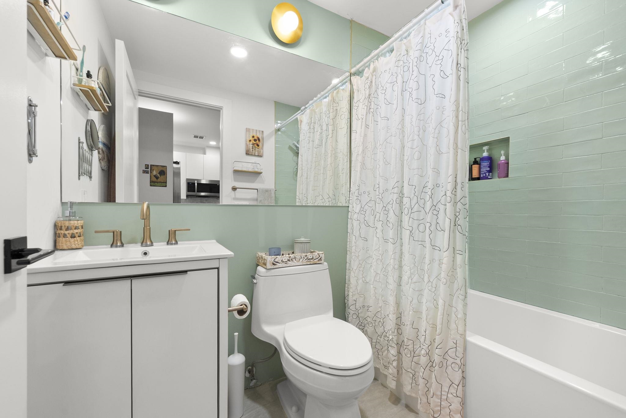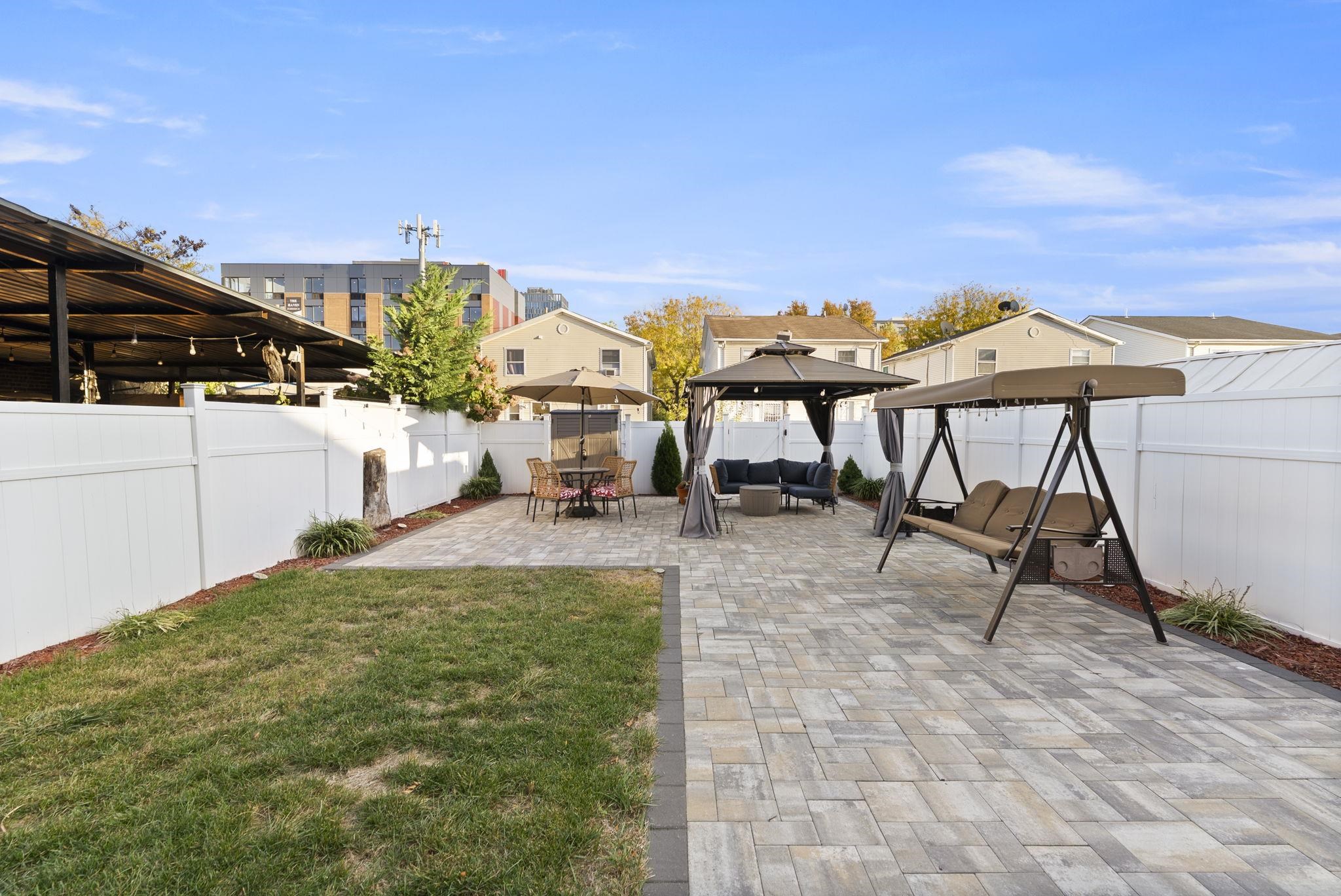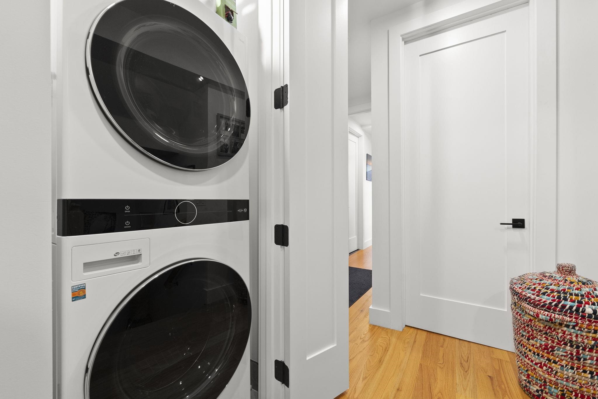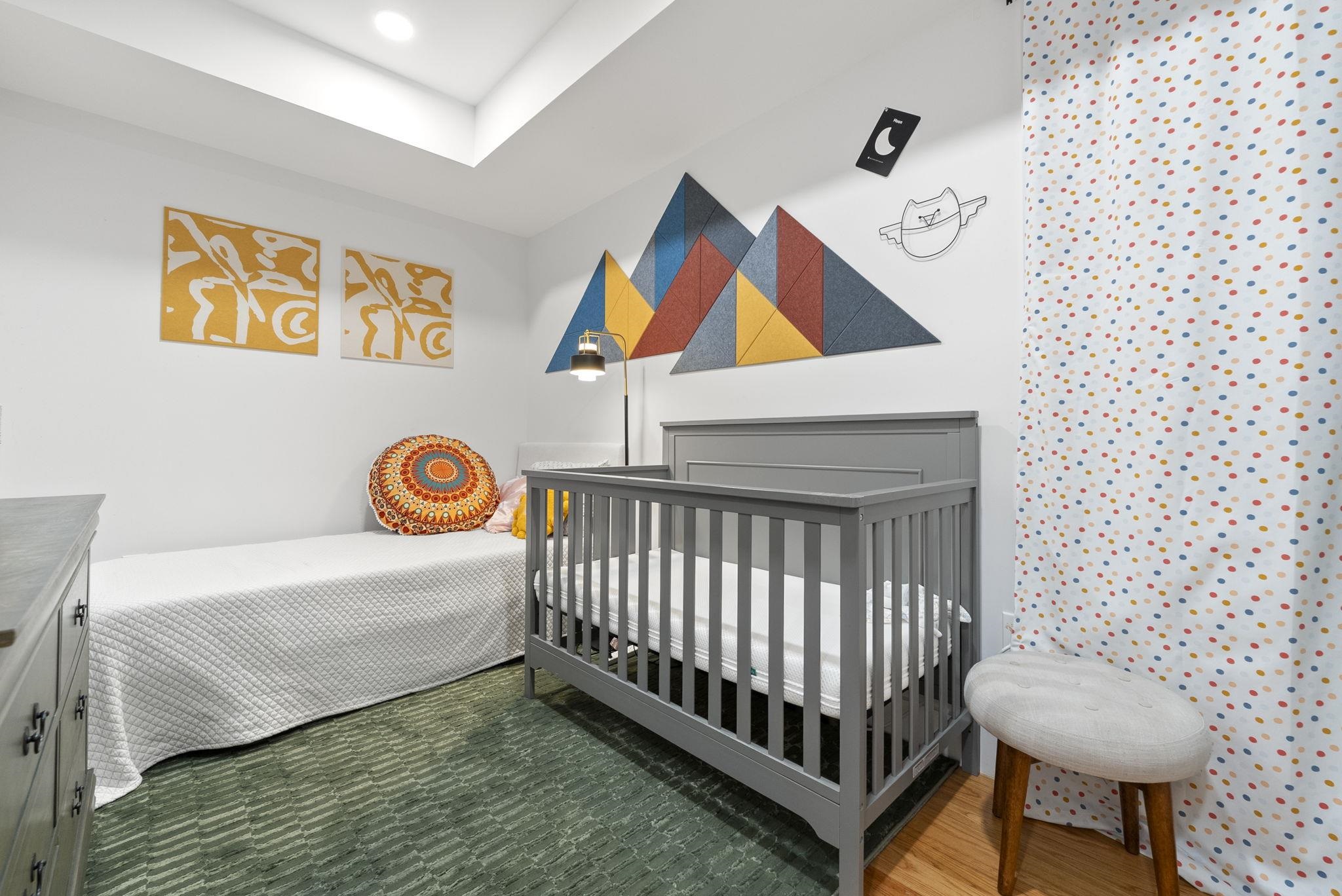 This fully renovated condominium offers a streamlined layout with updated finishes and smart features throughout. The interior is fitted with hardwood flooring, recessed lighting in every room, and a dedicated dining area. The kitchen combines modern design with functionality, featuring quartz countertops, geometric tile accents, and stainless steel appliances. Natural light fills the living space through bay windows, while both bathrooms showcase distinct tilework and contemporary fixtures—one with green subway tiles and brass accents, the other with black penny tiles and a built-in shower niche. Additional conveniences include a full-sized washer and dryer, central HVAC, and a private backyard enclosed by a white picket fence.