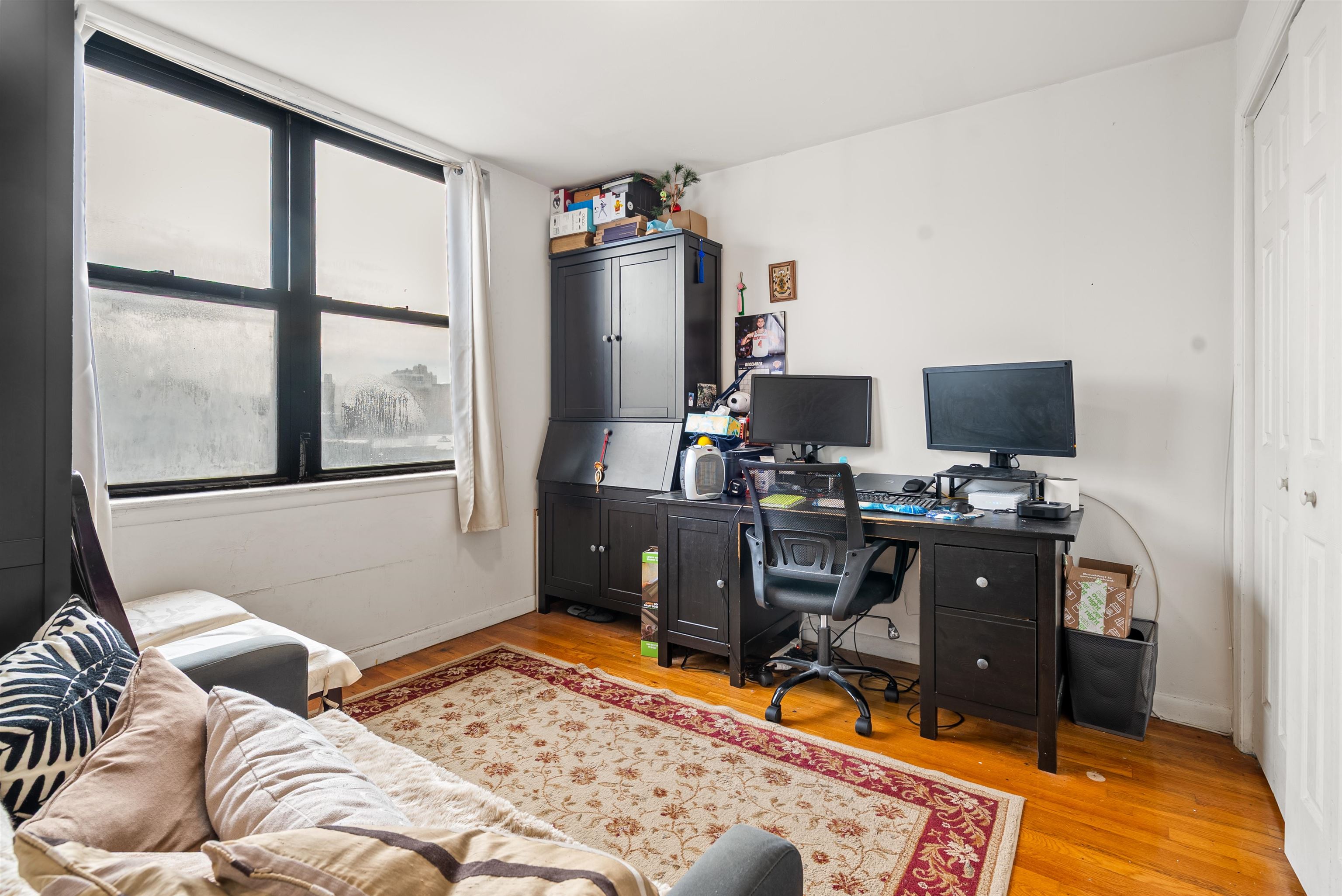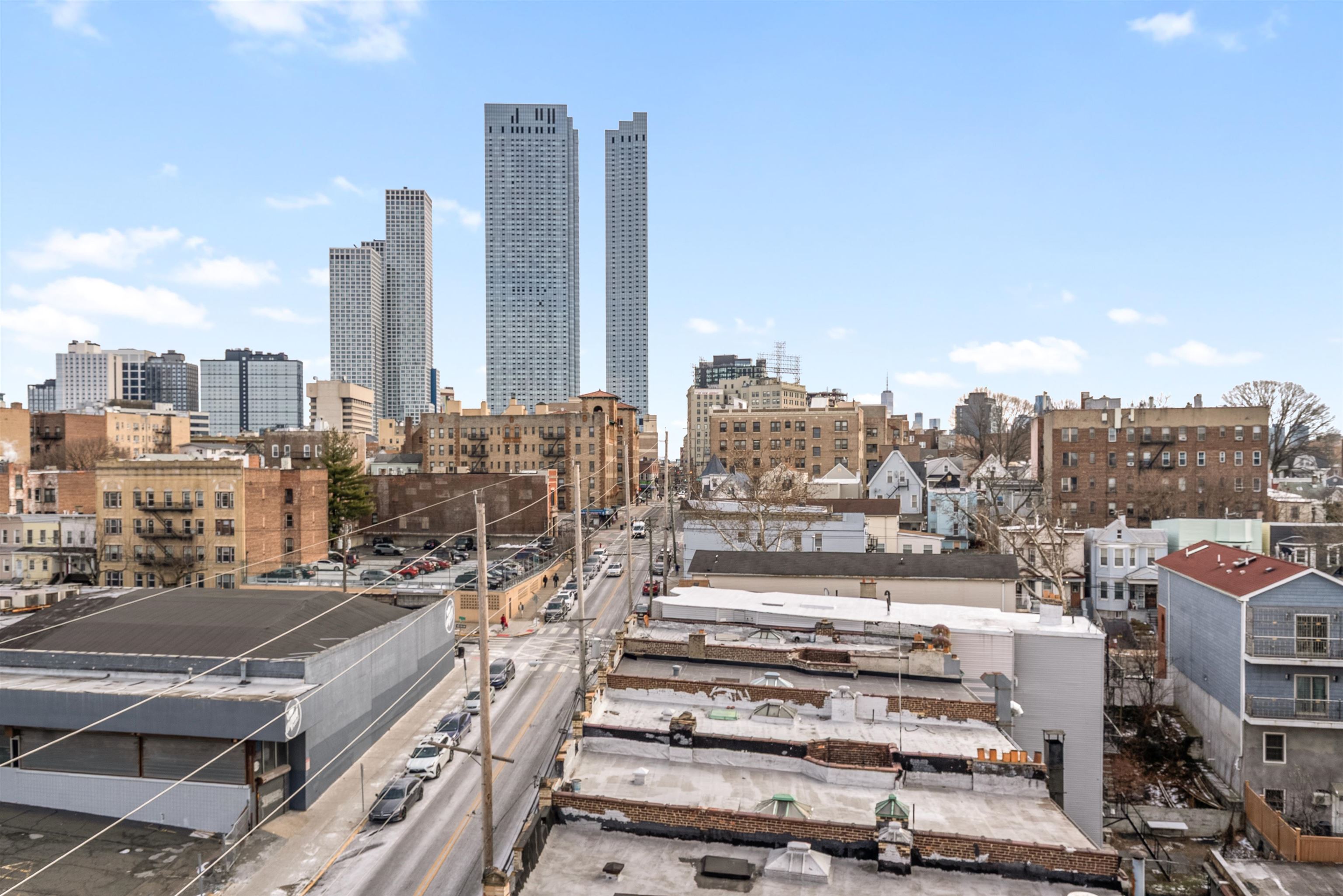 Value-add opportunity in a prime Journal Square location. This spacious 2-bedroom, 1-bath condo offers 810 sq ft of interior living space plus a rare 300 sq ft private roof deck an exceptional amenity that enhances both resale and rental appeal. Located on the 6th floor of an elevator building, the unit features an open kitchen with a pass-through to the dining/living area and a spiral staircase leading to the private rooftop. The building offers a common laundry room conveniently located on the same floor and a shared gym/fitness room. Includes a dedicated parking space in a secured lot an increasingly valuable feature near mass transit. Nearby the Journal Square PATH train with easy access to NYC, Hoboken, Harrison, and Newark. This home presents an excellent opportunity for an investor or end user to add equity in a high-demand, transit-oriented neighborhood.
