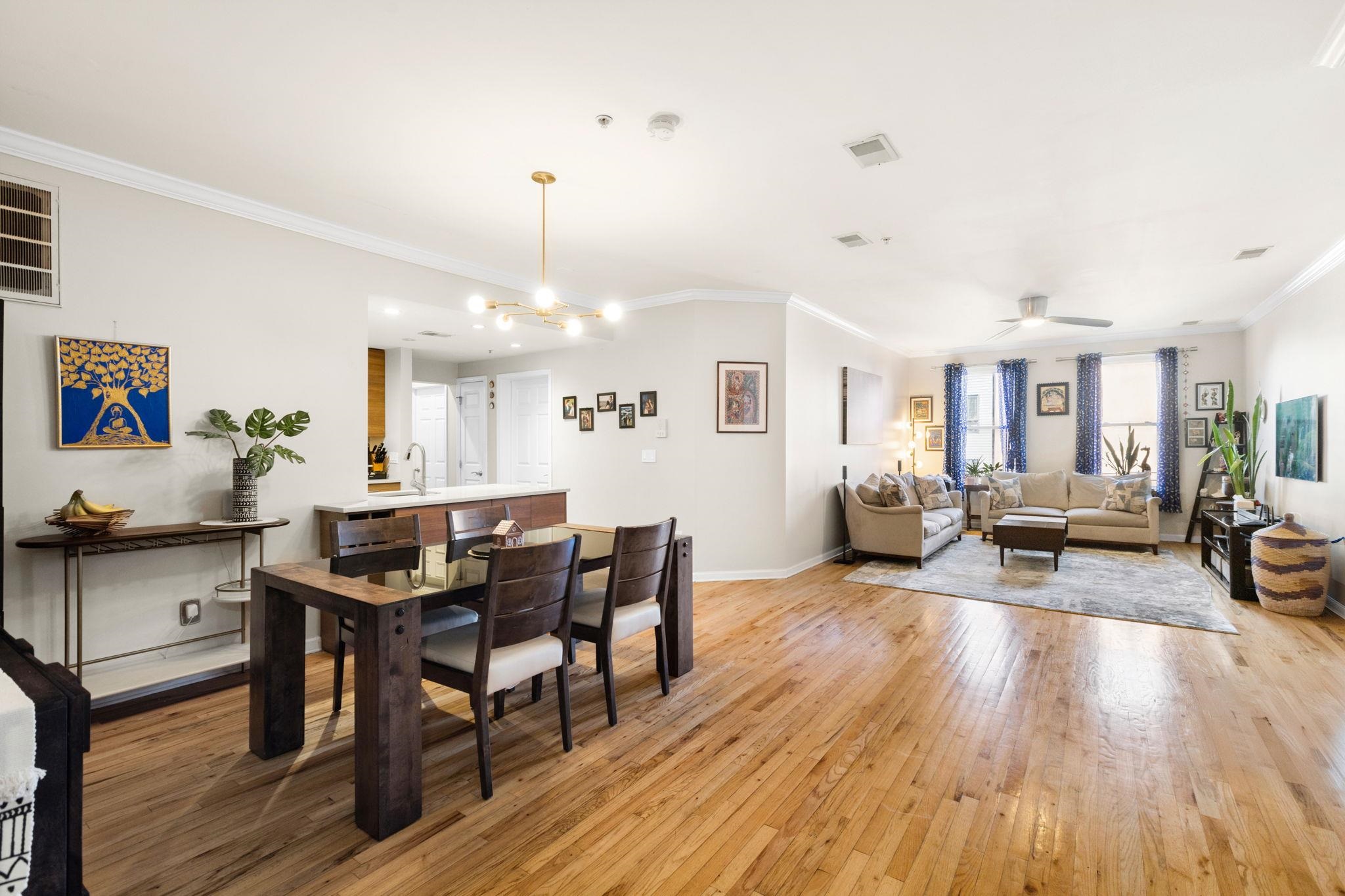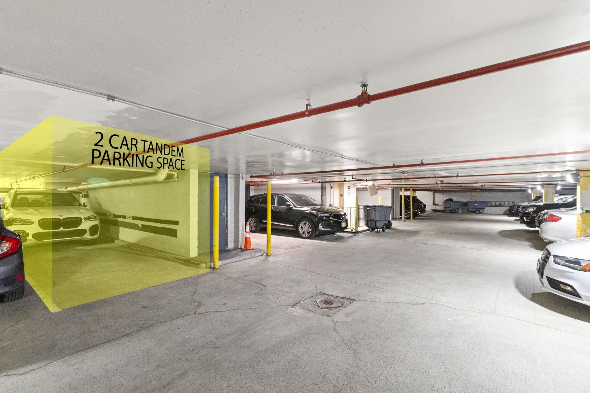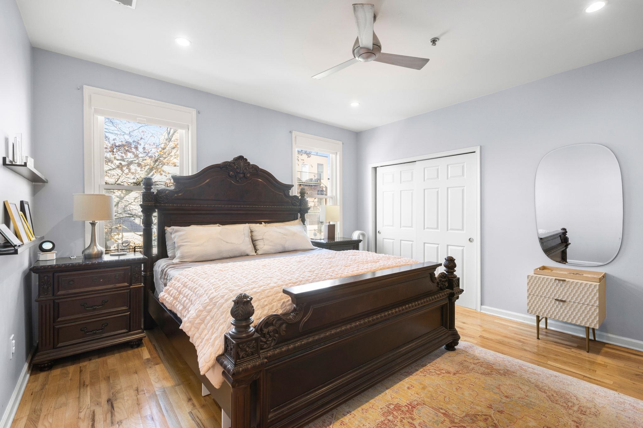 Welcome home to this stunning 3-bedroom (2 bed + den), 2-bath 1,342 sq ft condo in a desirable elevator building. The open living/dining area features hardwood floors, recessed lighting, a NEST thermostat, and smart switches. Both bedrooms offer blackout shades and custom closets; the spacious primary suite fits a California king and includes a stylish en-suite bath. The bright second bedroom has ample storage with easy access to the guest bath. A large den with a closet provides flexible use as an office, nursery, fitness room, or guest space. The well-appointed kitchen features stain-resistant countertops, stainless steel appliances, a tile backsplash, under-cabinet lighting, integrated spice shelves, and smart vertical storage. Additional highlights include two deeded tandem parking spaces, a turfed shared backyard with patio seating, and secure DoorBird video/audio intercom access. Ideally located steps from the Monroe Center, NYC transportation, grocery stores, fitness studios, parks, restaurants, and all that Hoboken has to offer.