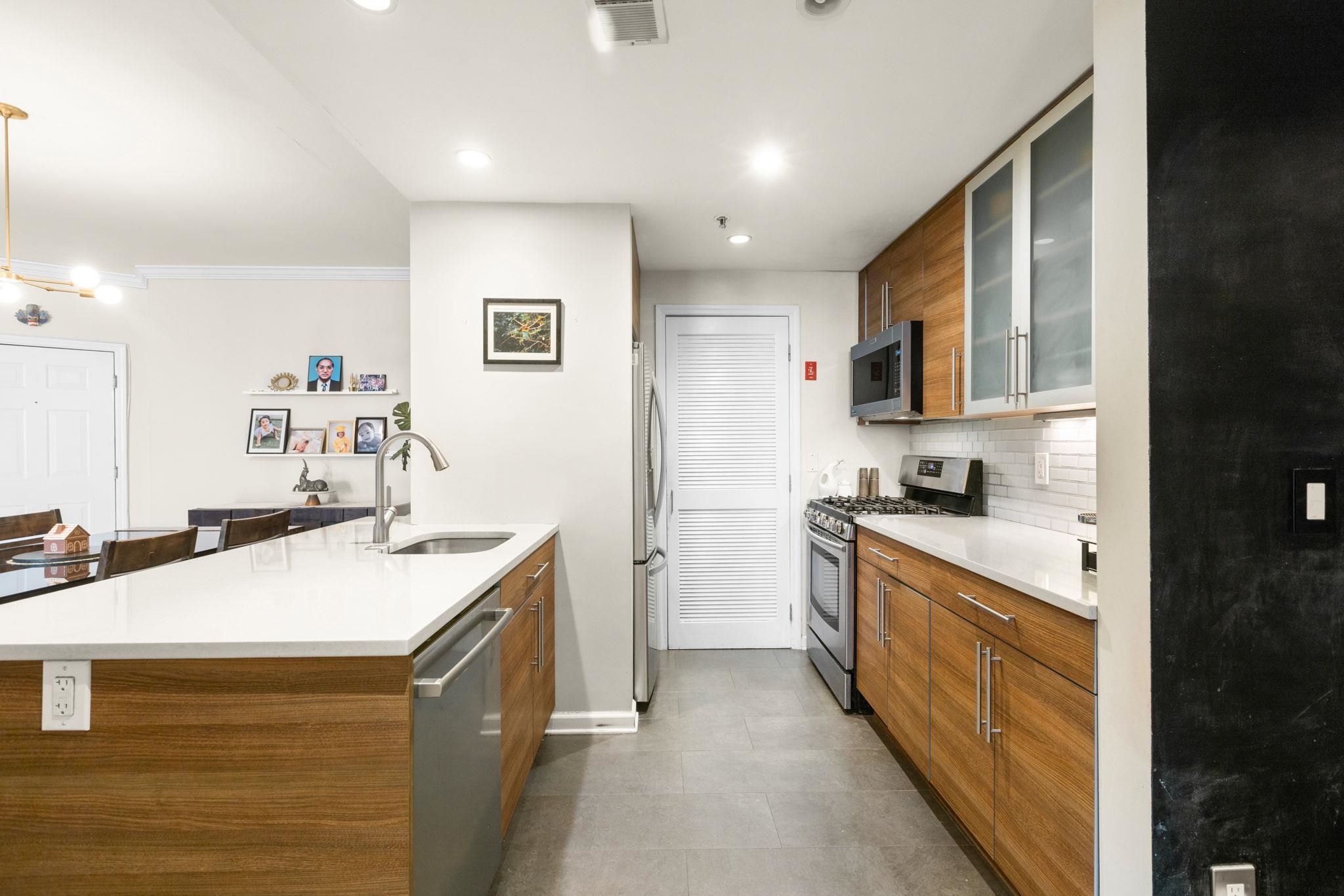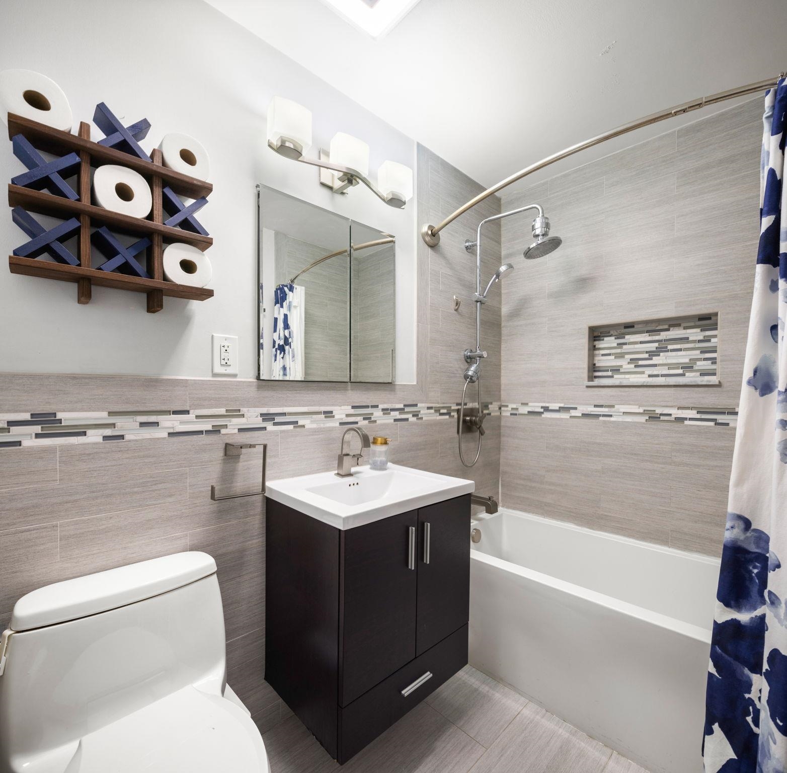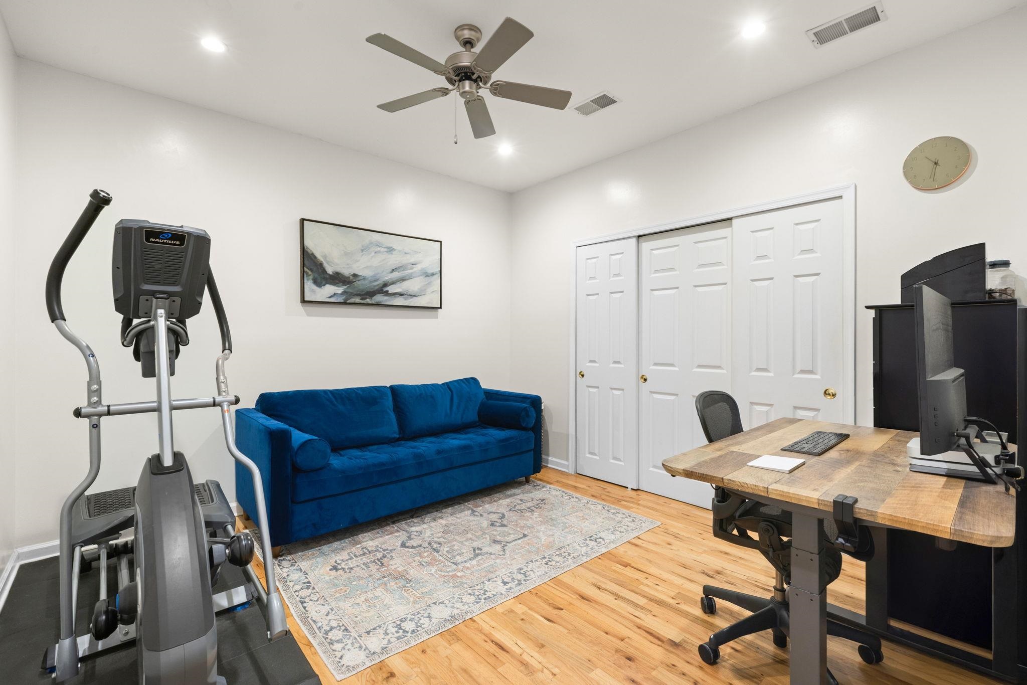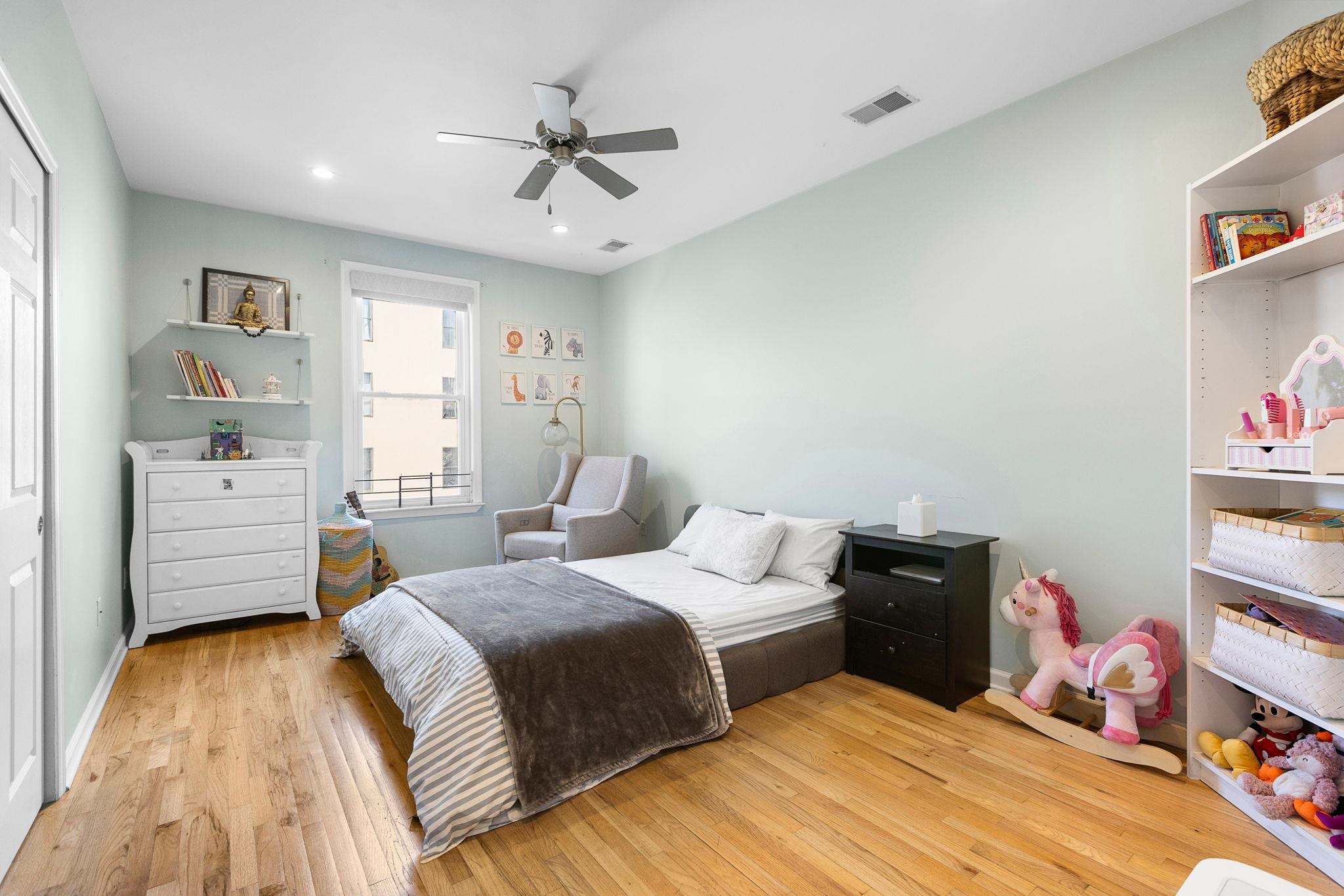Welcome home to this stunning 3-bedroom (2 bed + den), 2-bath 1,342 sq ft condo in a desirable elevator building. The open living/dining area features hardwood floors, recessed lighting, a NEST thermostat, and smart switches. Both bedrooms offer blackout shades and custom closets; the spacious primary suite fits a California king and includes a stylish en-suite bath. The bright second bedroom has ample storage with easy access to the guest bath. A large den with a closet provides flexible use as an office, nursery, fitness room, or guest space. The well-appointed kitchen features stain-resistant countertops, stainless steel appliances, a tile backsplash, under-cabinet lighting, integrated spice shelves, and smart vertical storage. Additional highlights include two deeded tandem parking spaces, a turfed shared backyard with patio seating, and secure DoorBird video/audio intercom access. Ideally located steps from the Monroe Center, NYC transportation, grocery stores, fitness studios, parks, restaurants, and all that Hoboken has to offer.