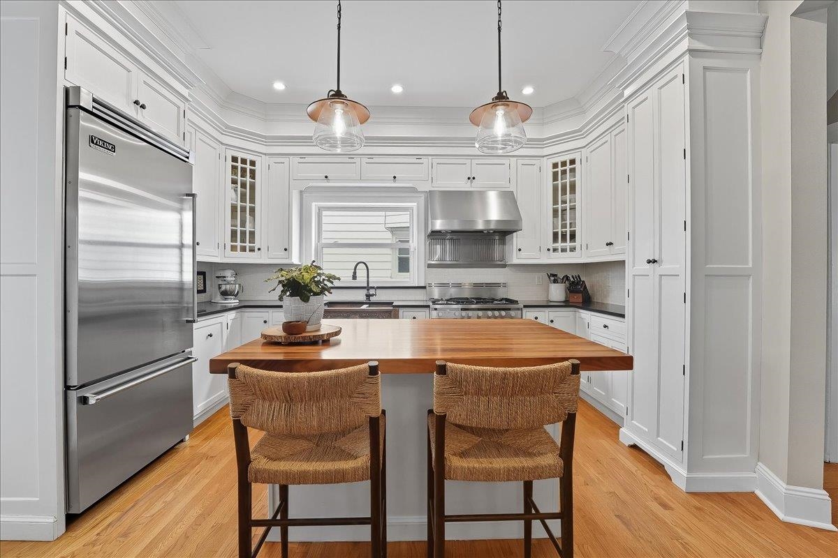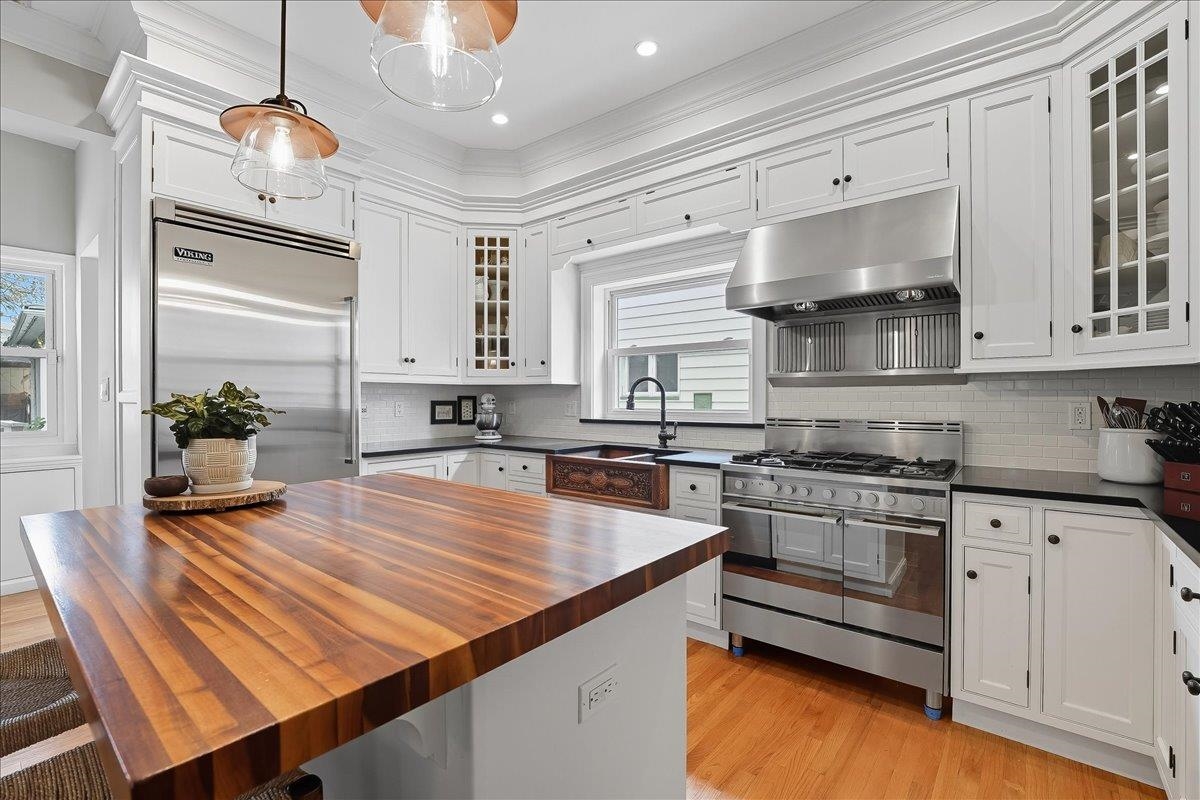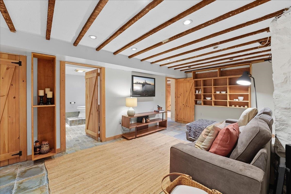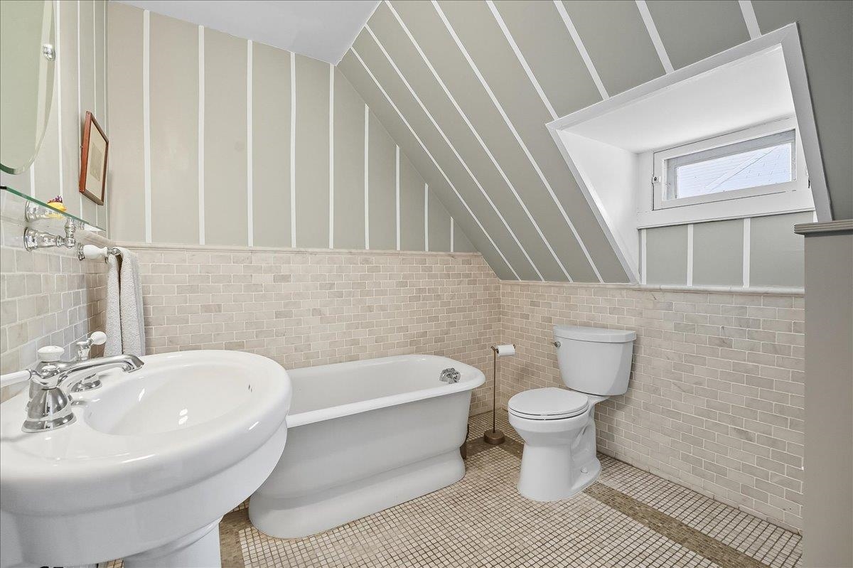 This beautiful, large & luminous Tudor sits peacefully on an enchanting 50 x 100′ lot, deep in the heart of King’s Bluff surrounded by a lush, vintage garden including hydrangea, lilac & cherry blossom, and a massive 2-car garage with added driveway parking for 3 more cars. 56-58 Bonn Place is completely renovated & restored, keeping the original architecture intact, while creating a space that is modern, functional & comfortable for contemporary life. The open, airy first level includes an opulent living room w/coffered ceiling & a vintage decorative fireplace. Seamlessly connected to the living room is an expansive, light-filled dining room which is directly across from a timeless kitchen featuring a massive butcher block island, custom cabinetry & a unique copper farmhouse sink, w/premium appliances including Viking refrigerator, and Fisher & Paykel double oven. There is a delightful sunroom in the back of the house that gives way to the beautiful garden, and an appealing half bath for added comfort & convenience. Both the dining room & sunroom are outfitted with Serena & Lily chandeliers, with a sound system installed throughout the first floor. Walk up the perfect, solid oak staircase w/Harlequin stained glass to the second floor which unfolds into 3 oversized bedrooms, with one bedroom being used as a roomy office, an oversized walk-in closet, 2 spacious baths w/impeccable design & a conveniently located LG washer/dryer. Head up to the 3rd floor which contains 2 large, sunny bedrooms that could also be used flexibly as creative, guest, or work spaces & a pristine bath with vintage reproduction elements. NYC views are visible from the 2nd & 3rd floors, & all 4 ½ baths have been thoughtfully & tastefully renovated. Finally, head down to the comfortable basement which includes a full bath w/tile & stone walk-In shower, lounge area, & an additional flex room, all artfully designed for maximum relaxation. Close to the Port Imperial & Lincoln Harbor Ferry, Light Rail, Bus & Easy Access to Lincoln Tunnel, Major Highways, & Local Airports. This Incredible Home is just Minutes to New York!