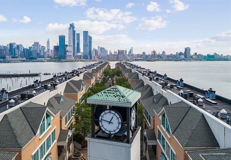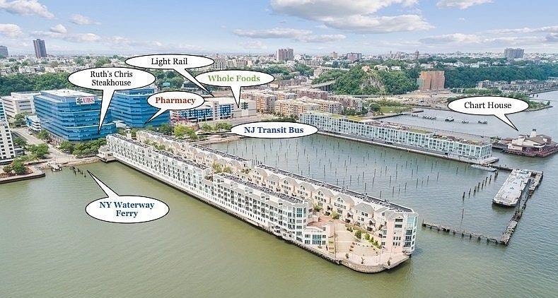 Dreaming of living by the Hudson River? Your search ends here with this stunning and well-maintained duplex! Located just steps from the ferry, bus, and light rail, this spacious and private 3-bedroom, 3-bathroom duplex loft boasts an unbeatable waterfront location. Perfect for commuters! It features your own townhouse-style private entrance from Harbor Blvd through the Community Promenade along the Hudson River. Enjoy breathtaking views of the Hudson River and NYC from your large windows and two private balconies. The sunlit, south-facing living area boasts a two-story vaulted ceiling with a skylight, a modern fireplace, in-unit laundry, and hardwood floors. The stylish open kitchen is equipped with granite countertops, stainless steel appliances, and a glass tile backsplash, while all bathrooms have been updated with contemporary finishes. Community amenities include 24-hour concierge services, elevators, secured garage parking, an indoor heated pool, a gym with a sauna, and a yoga room. Whole Foods is conveniently located across the street. The Weehawken waterfront complex, playground, and Hudson River promenade are right nearby, along with a short walk to restaurants and north Hoboken.